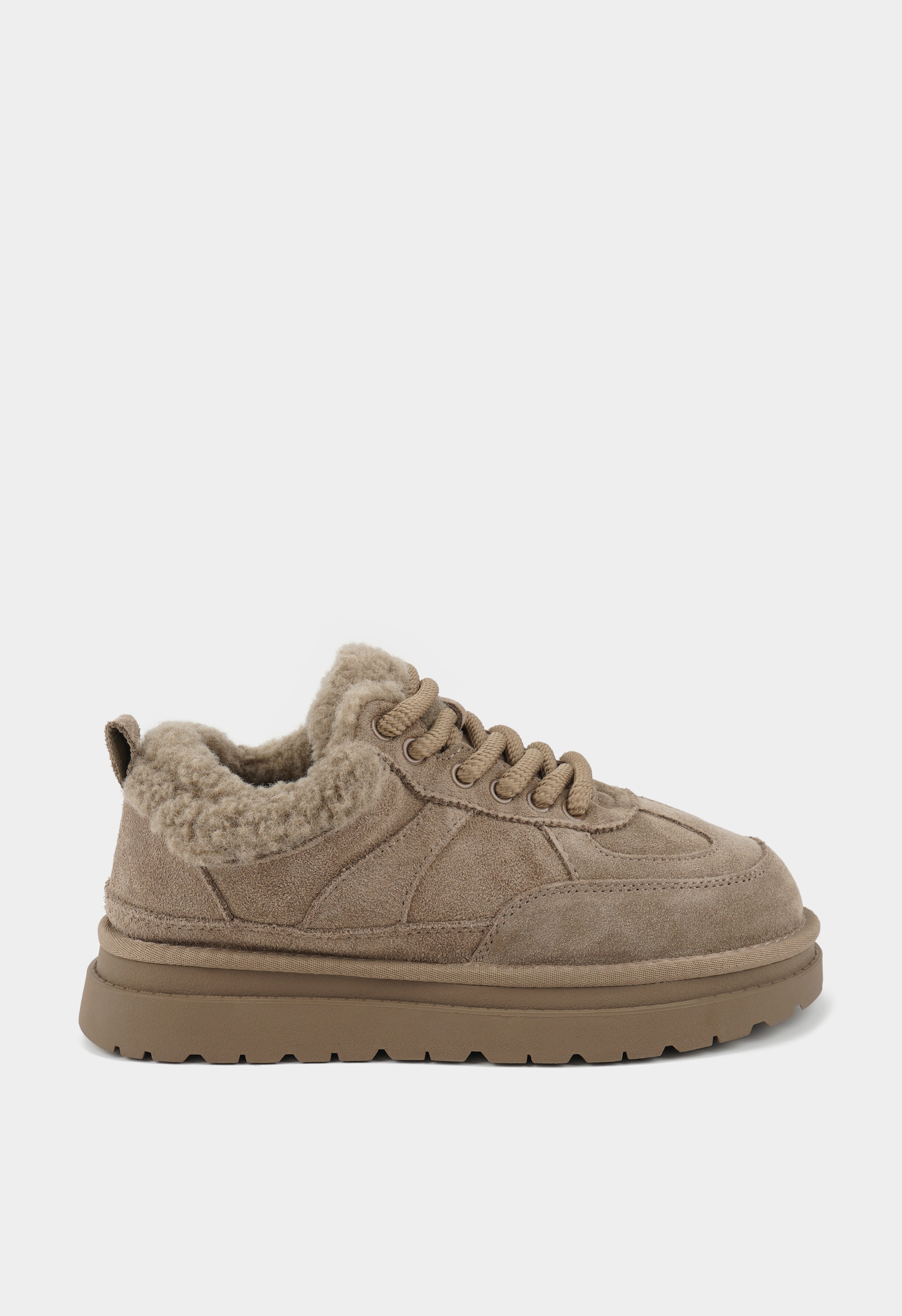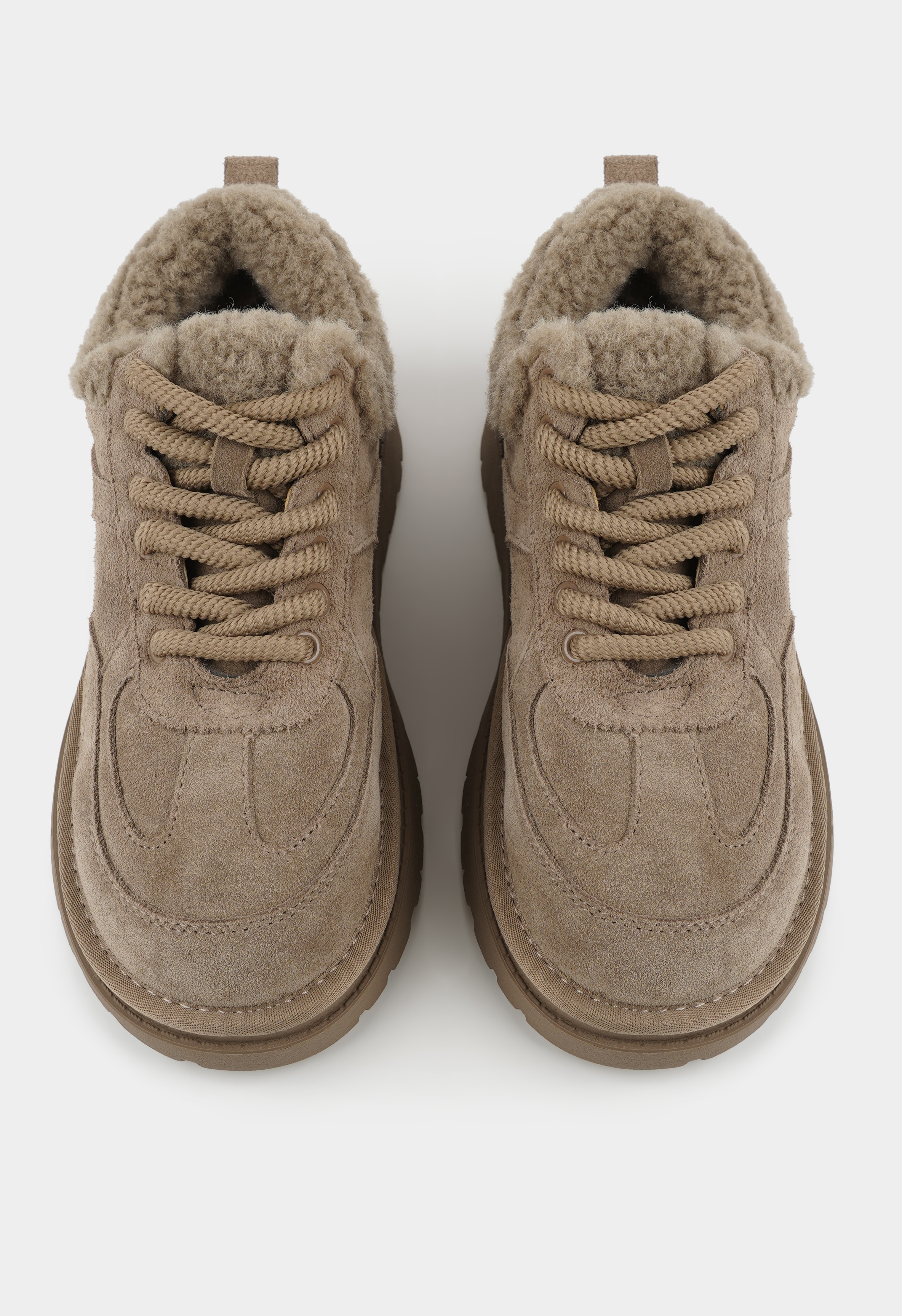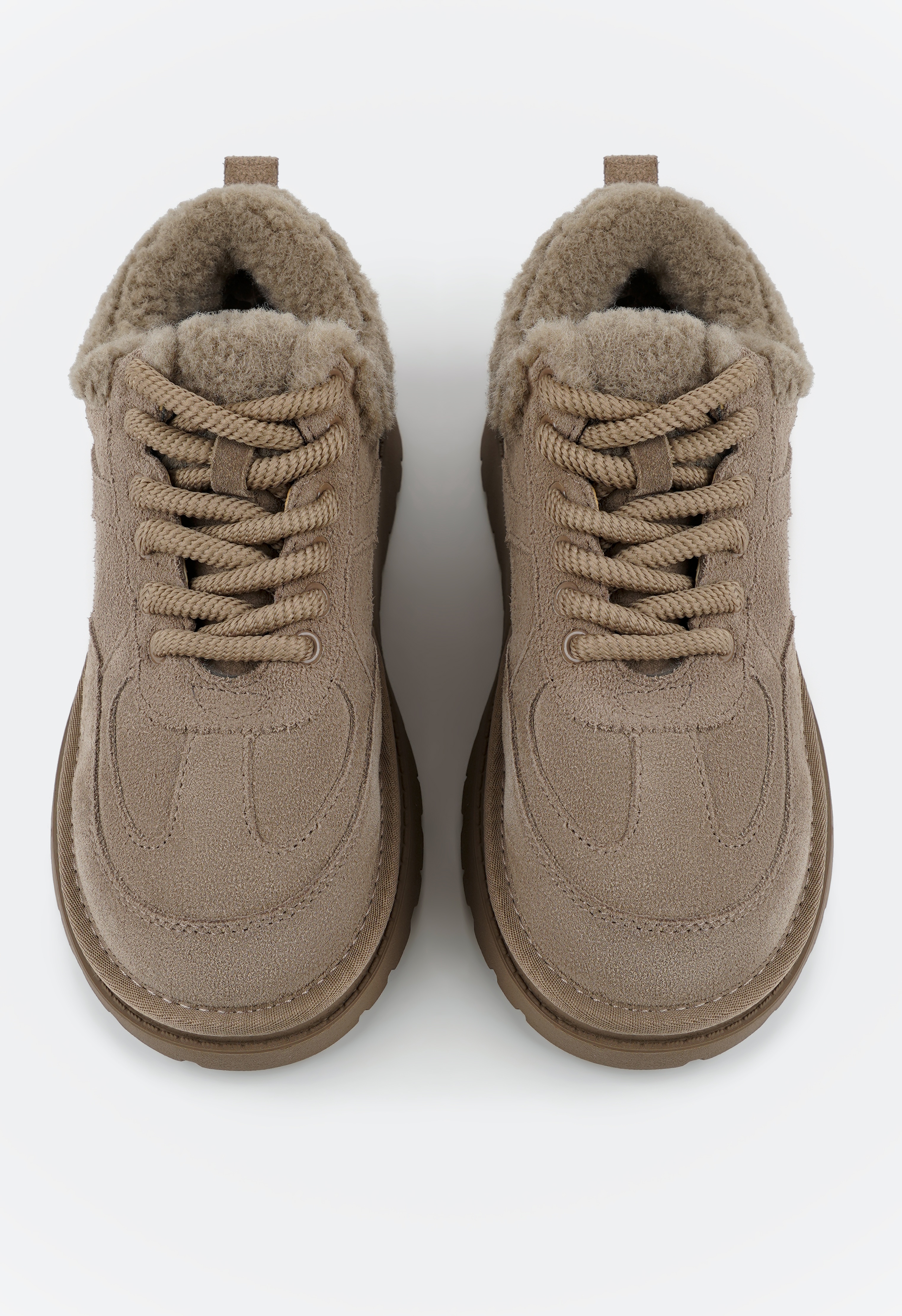 Полуботинки бежевого цвета – гармоничное сочетание мягкого дизайна и практичности, созданное для стильных образов на каждый день. Модель выполнена из натуральной замши, которая приятно ложится по ноге и сохраняет безупречный внешний вид, внутренняя отделка из натуральной шерсти обеспечивает тепло и комфорт в прохладную погоду. Жесткая подошва придает устойчивость и защищает от влаги, округлый мысок создает удобную посадку, а аккуратная шнуровка помогает легко регулировать объем. Платформа и фурнитура в цвете хаки добавляет современный акцент и делает модель особенно выразительной.