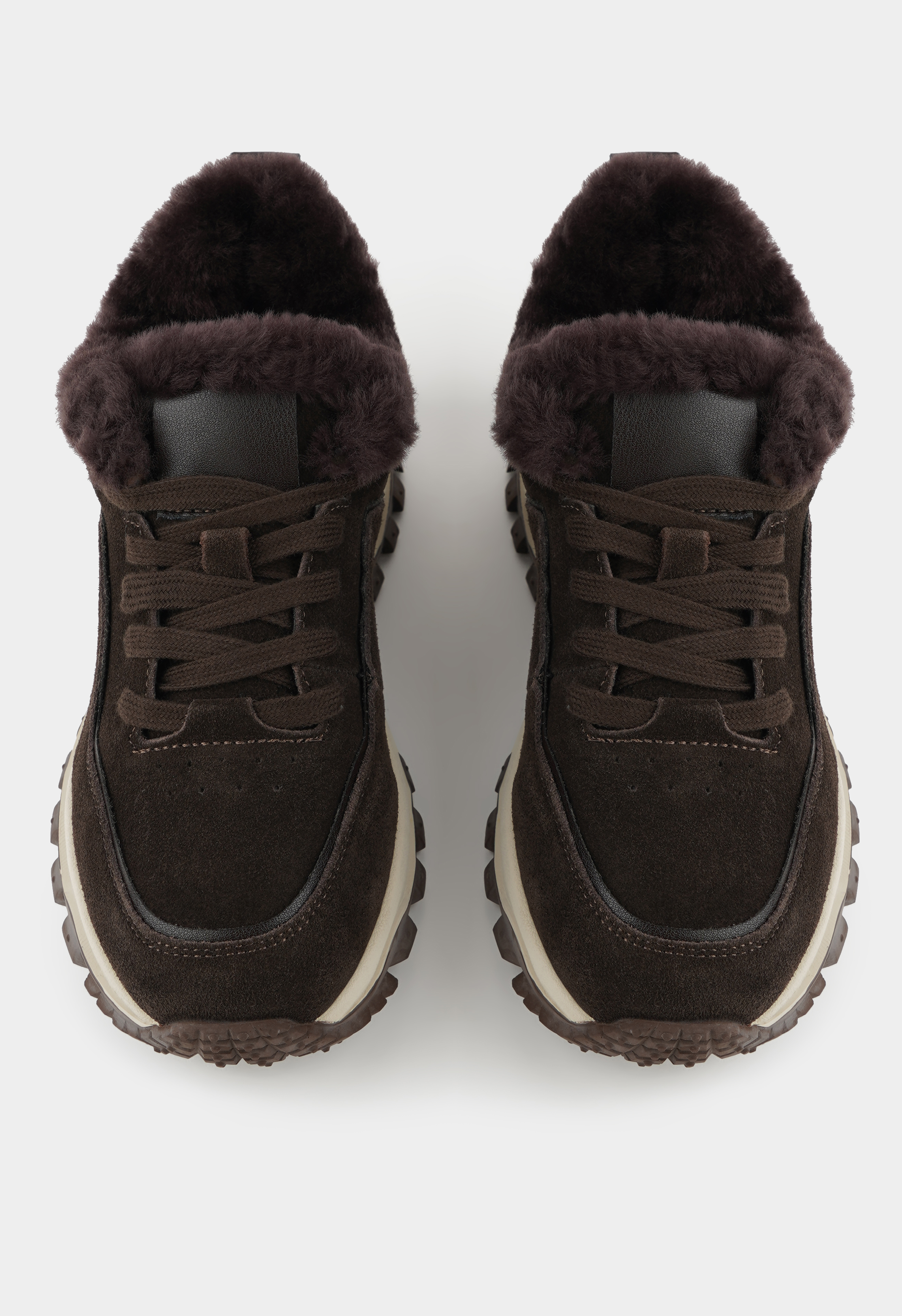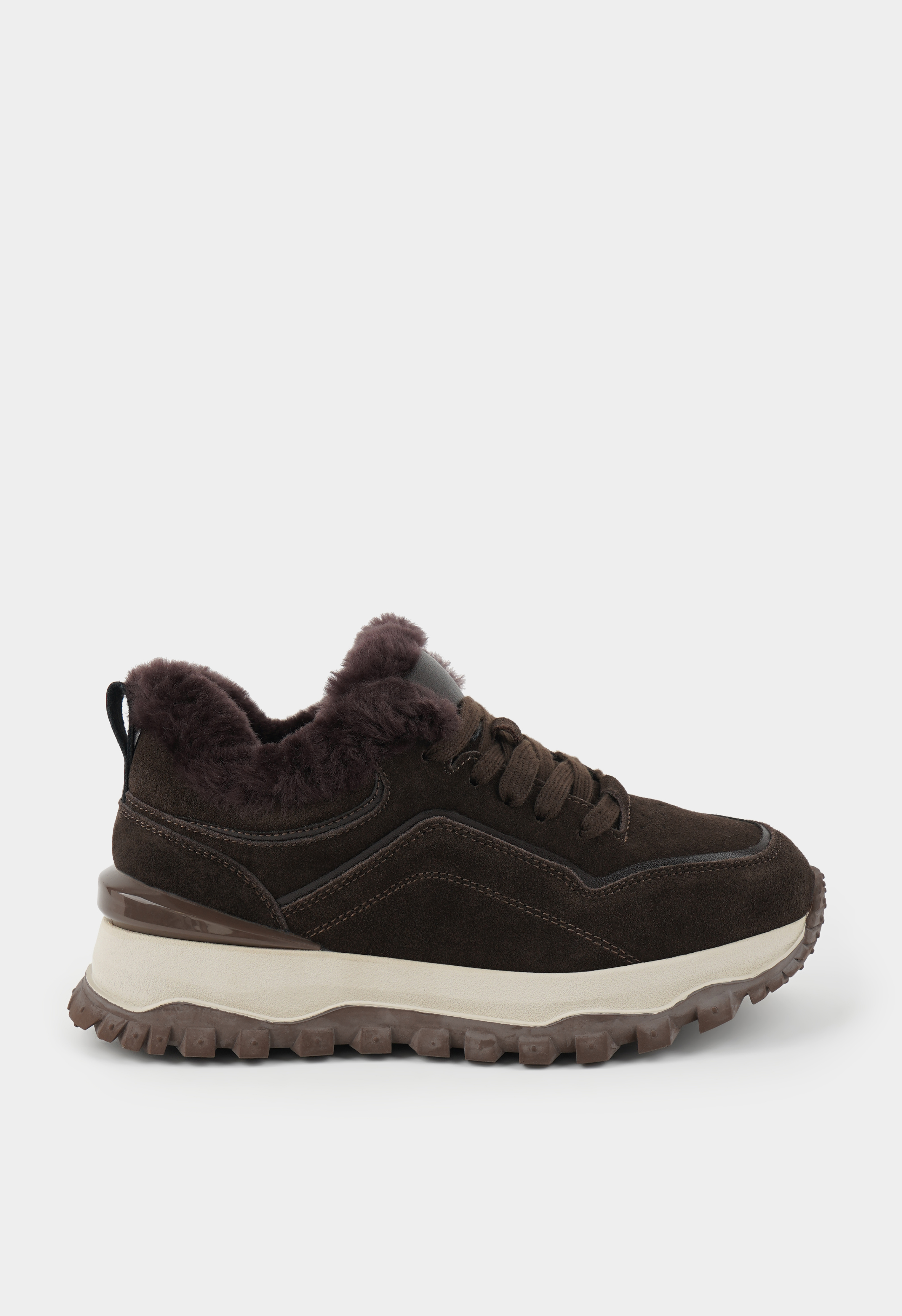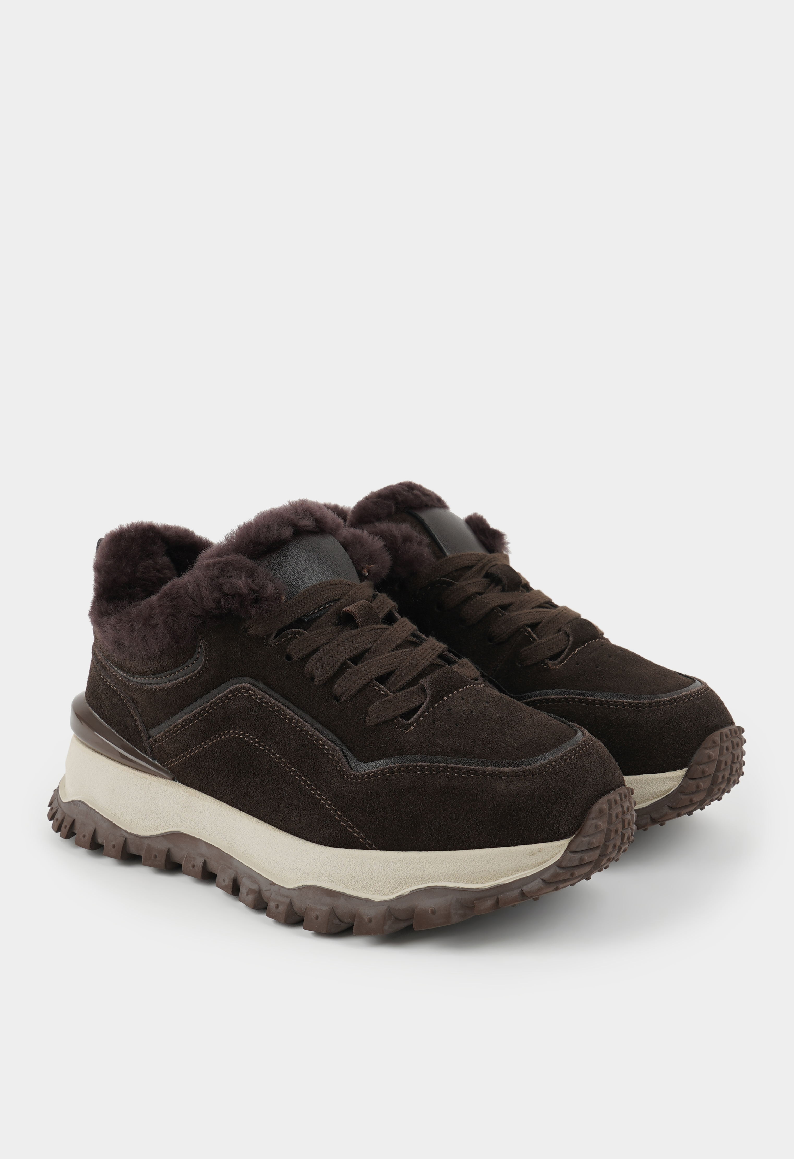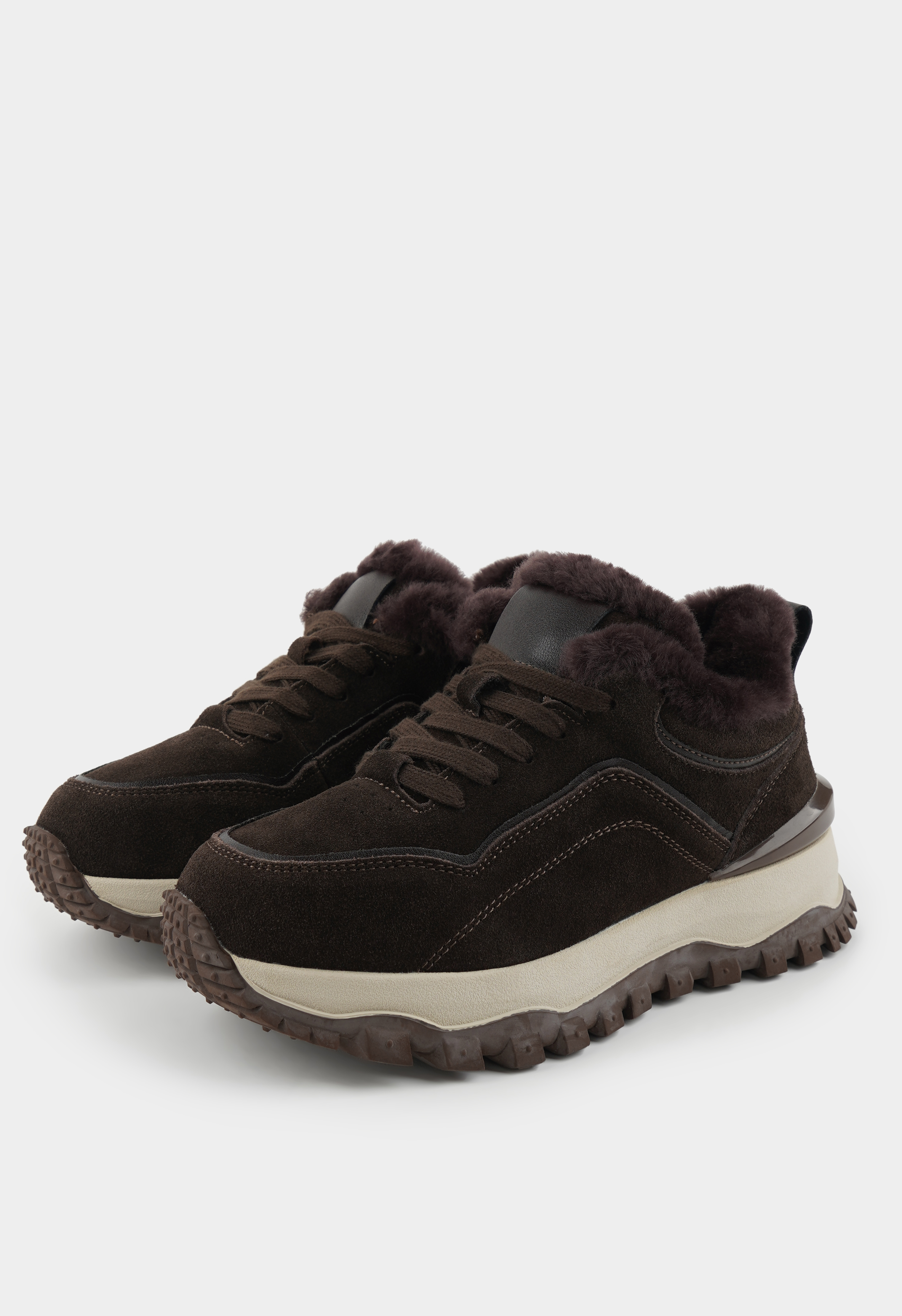 Базовые ботинки коричневого цвета – идеальный выбор для тех, кто ценит комфорт и лаконичный стиль в повседневной обуви. Натуральная замша придает модели мягкость и благородство, а внутренняя отделка из натуральной шерсти дарит тепло и уют в холодные зимние дни. Жесткая подошва обеспечивает устойчивость и надежность при ходьбе, округлый мысок делает обувь удобной, в то время как шнуровка позволяет легко подстроить посадку под ногу. Платформа добавляет легкий визуальный акцент и делает шаг уверенным, превращая эту модель в практичное и стильное дополнение к любому гардеробу.
