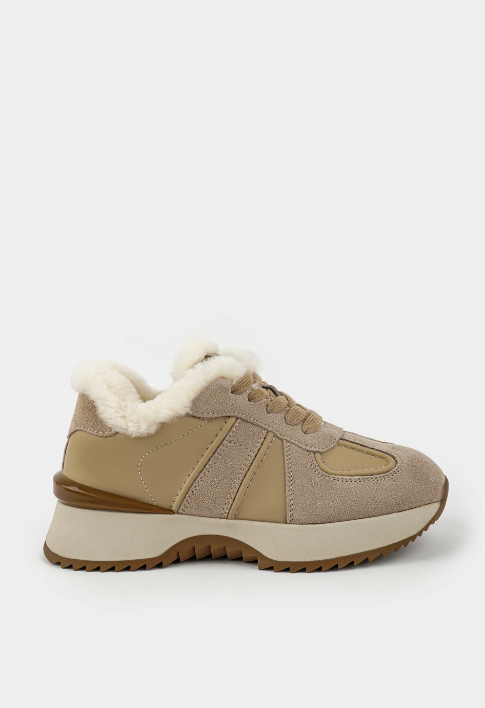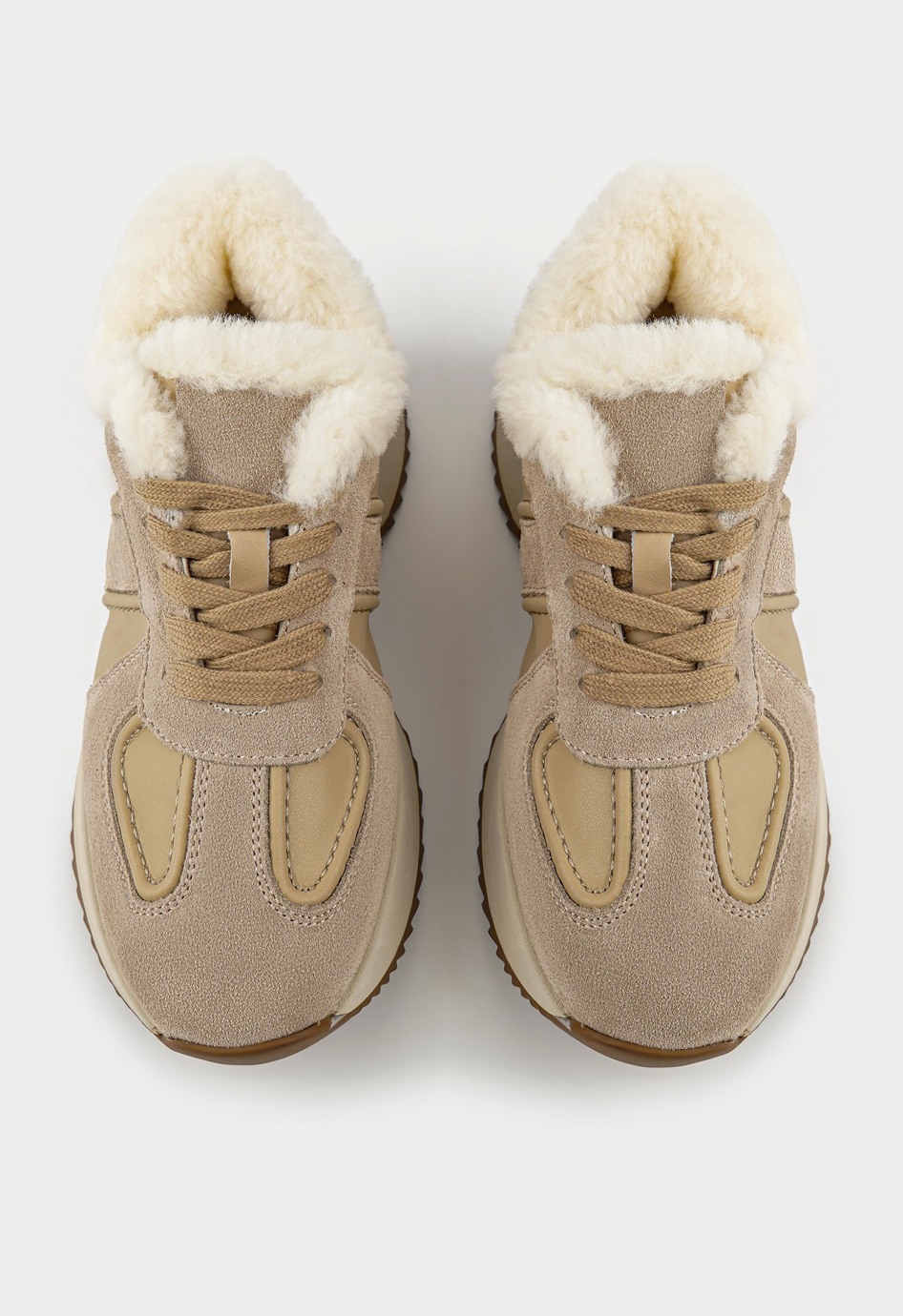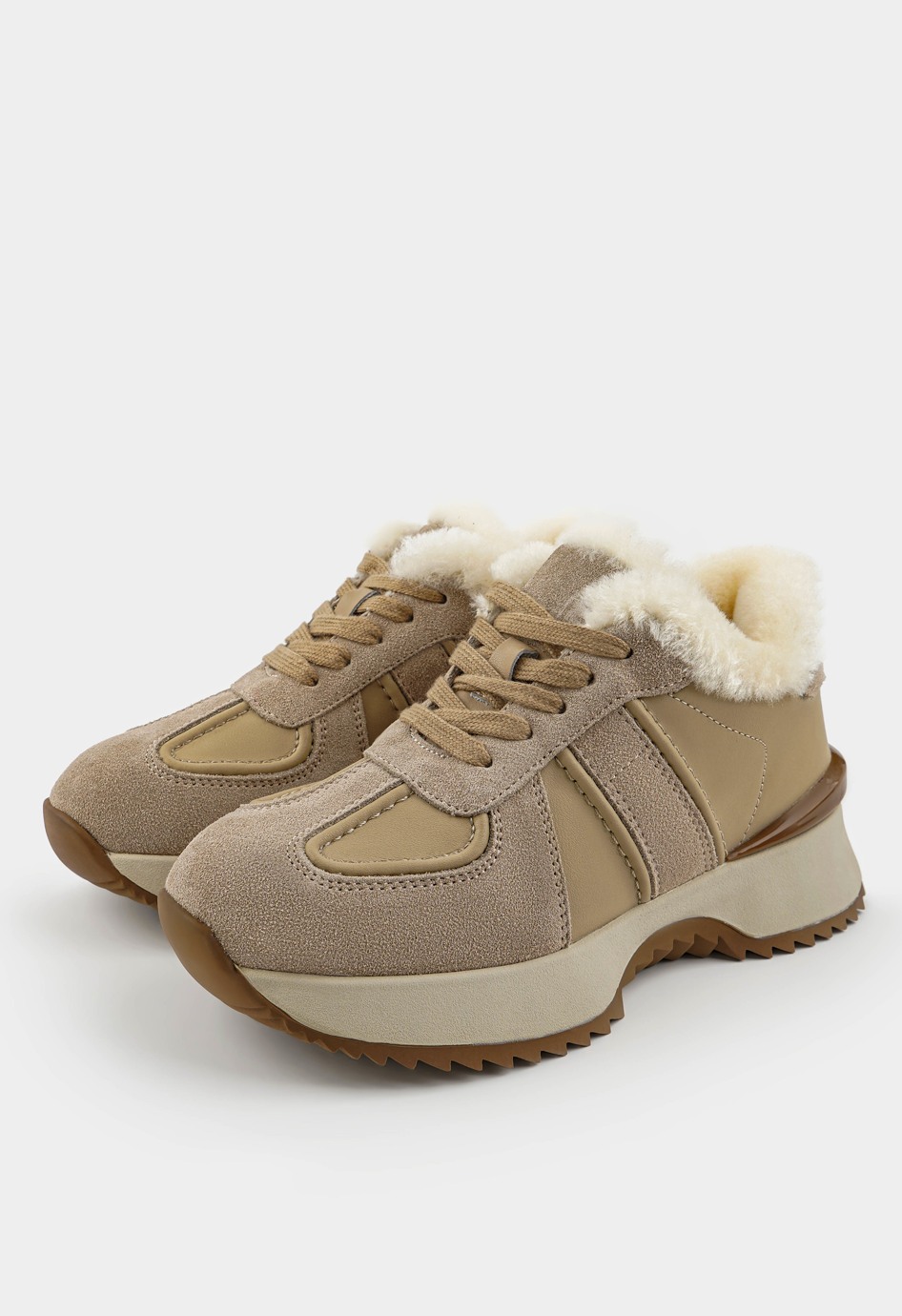 Повседневные полуботинки бежевого цвета станут надежной основой для стильных и удобных образов на каждый день. Сочетание натуральной замши и гладкой кожи придает модели выразительный вид и гарантирует долговечность, в то время как внутренняя отделка из натуральной шерсти сохраняет тепло и комфорт даже в холодное время года. Жесткая подошва обеспечивает устойчивость на любых поверхностях, округлый мысок делает посадку стопы естественной, а шнуровка позволяет подогнать обувь по ноге. Платформа визуально удлиняет силуэт и добавляет легкости шагу, подчеркивая современный характер этой модели.
