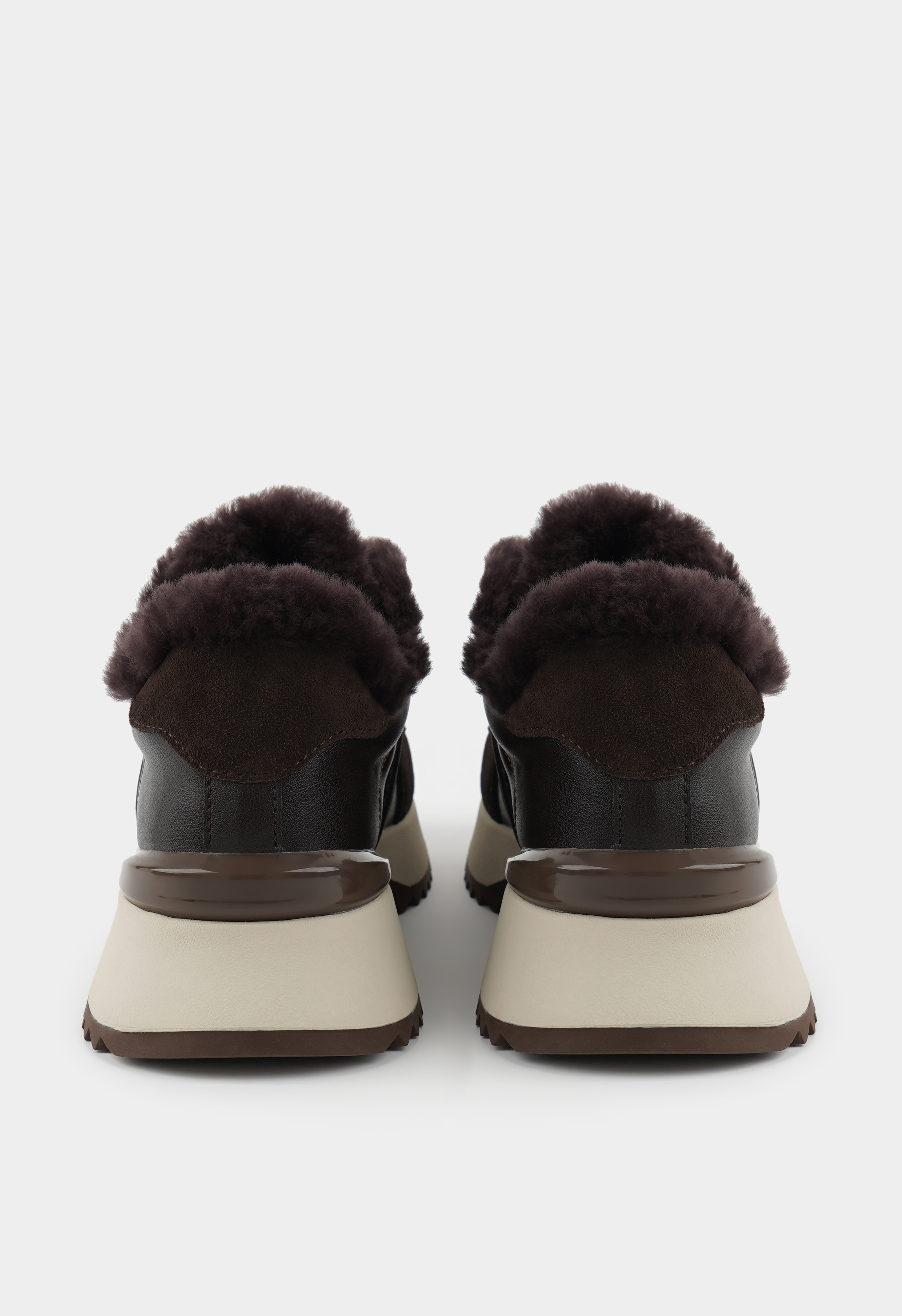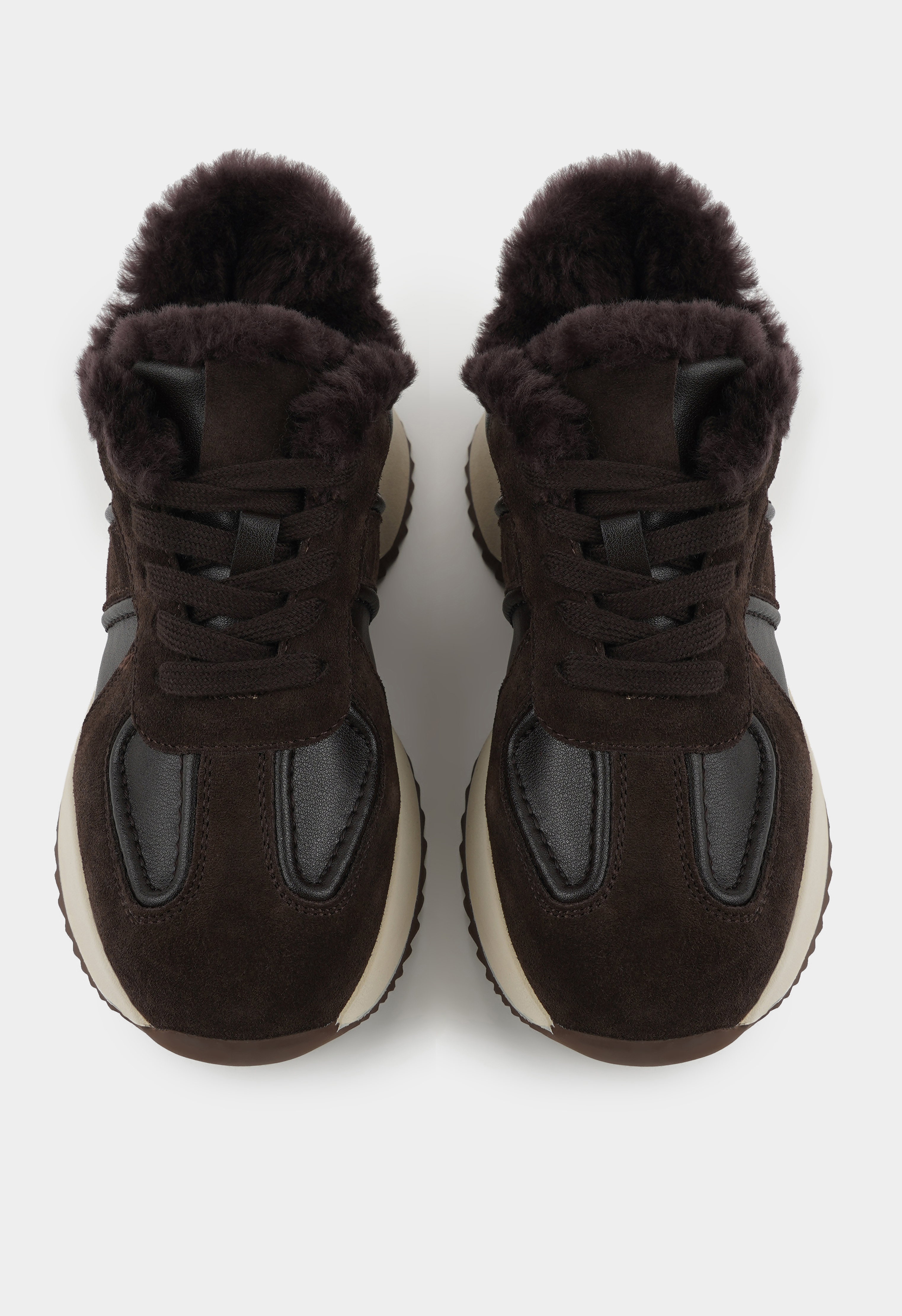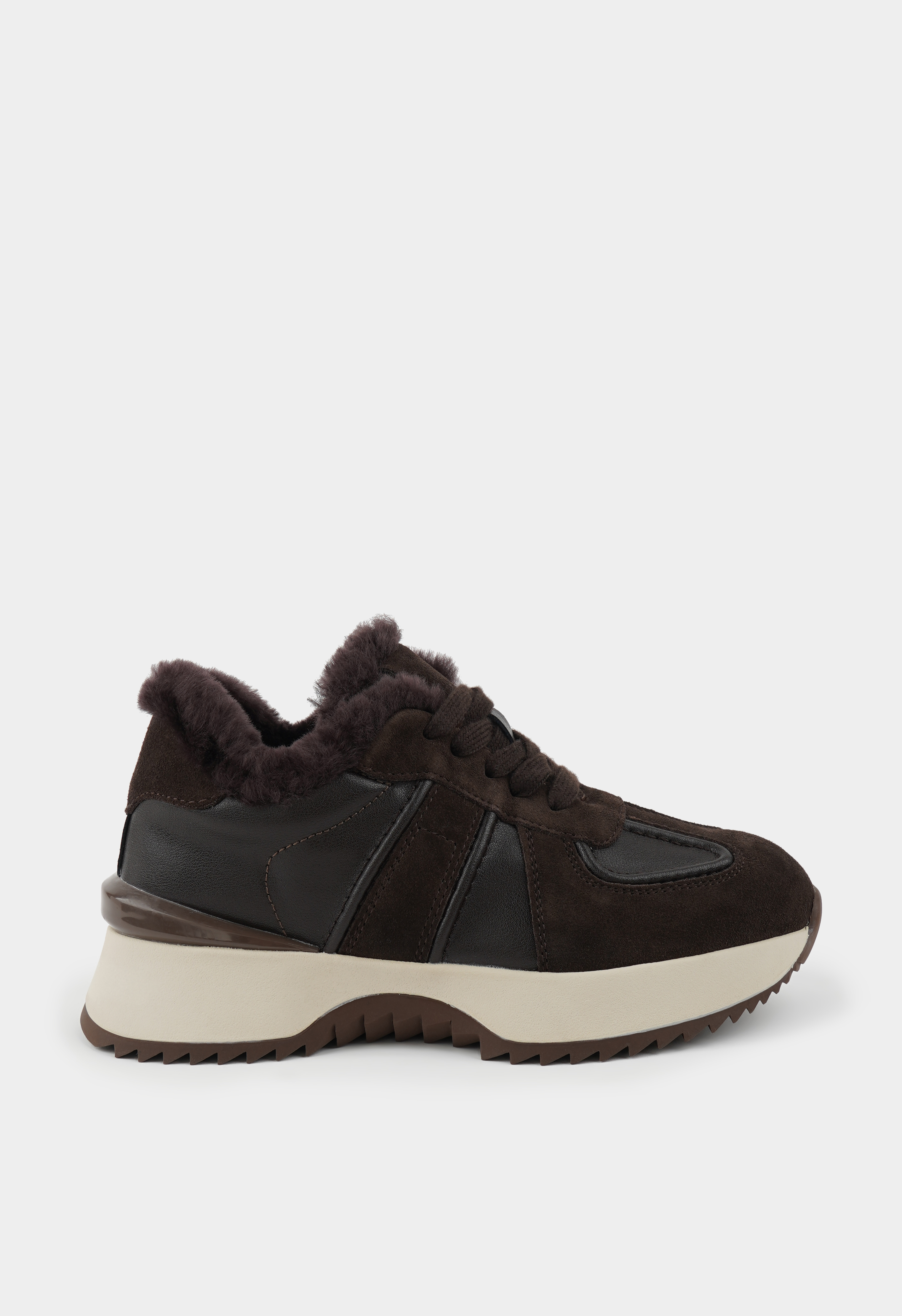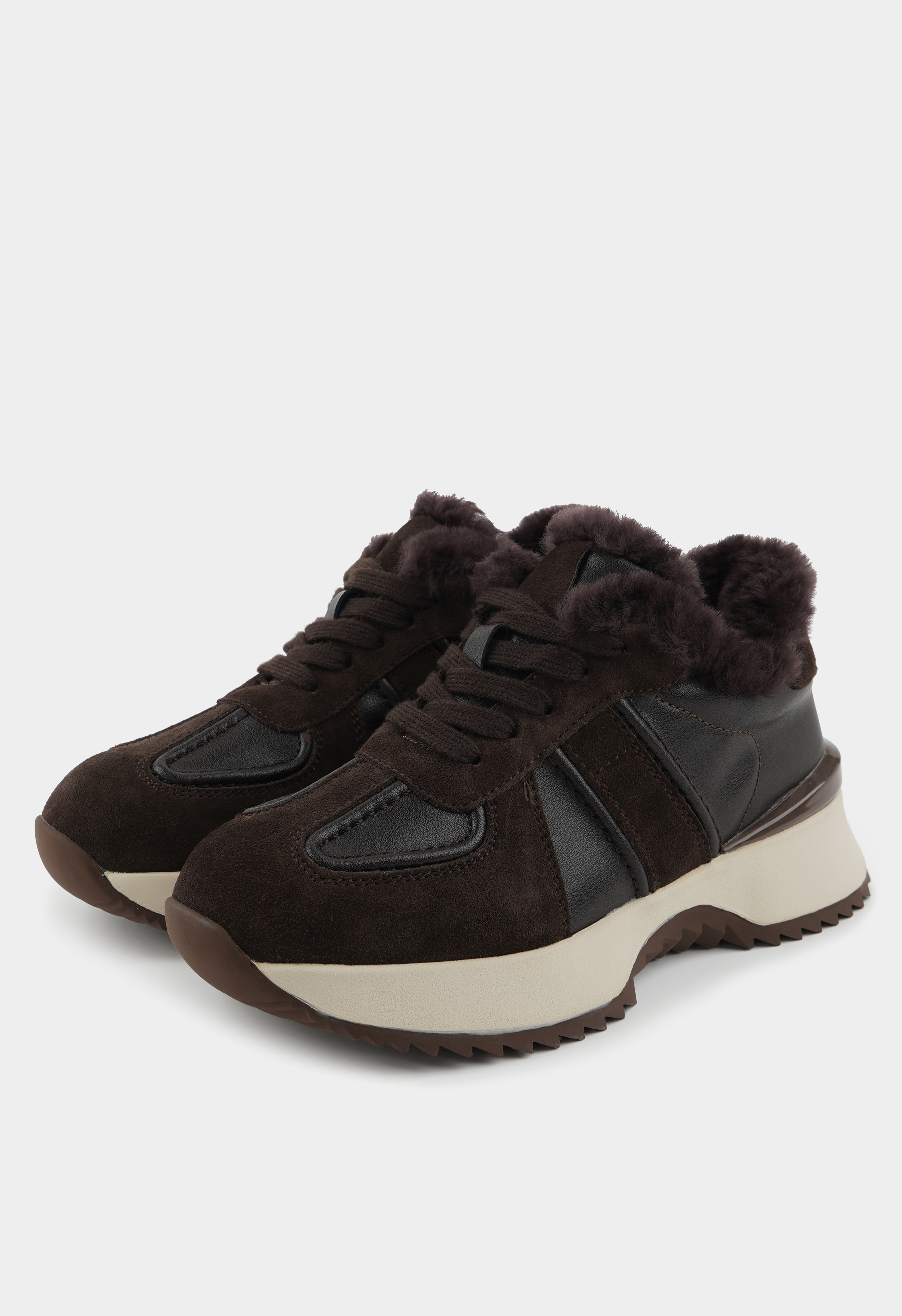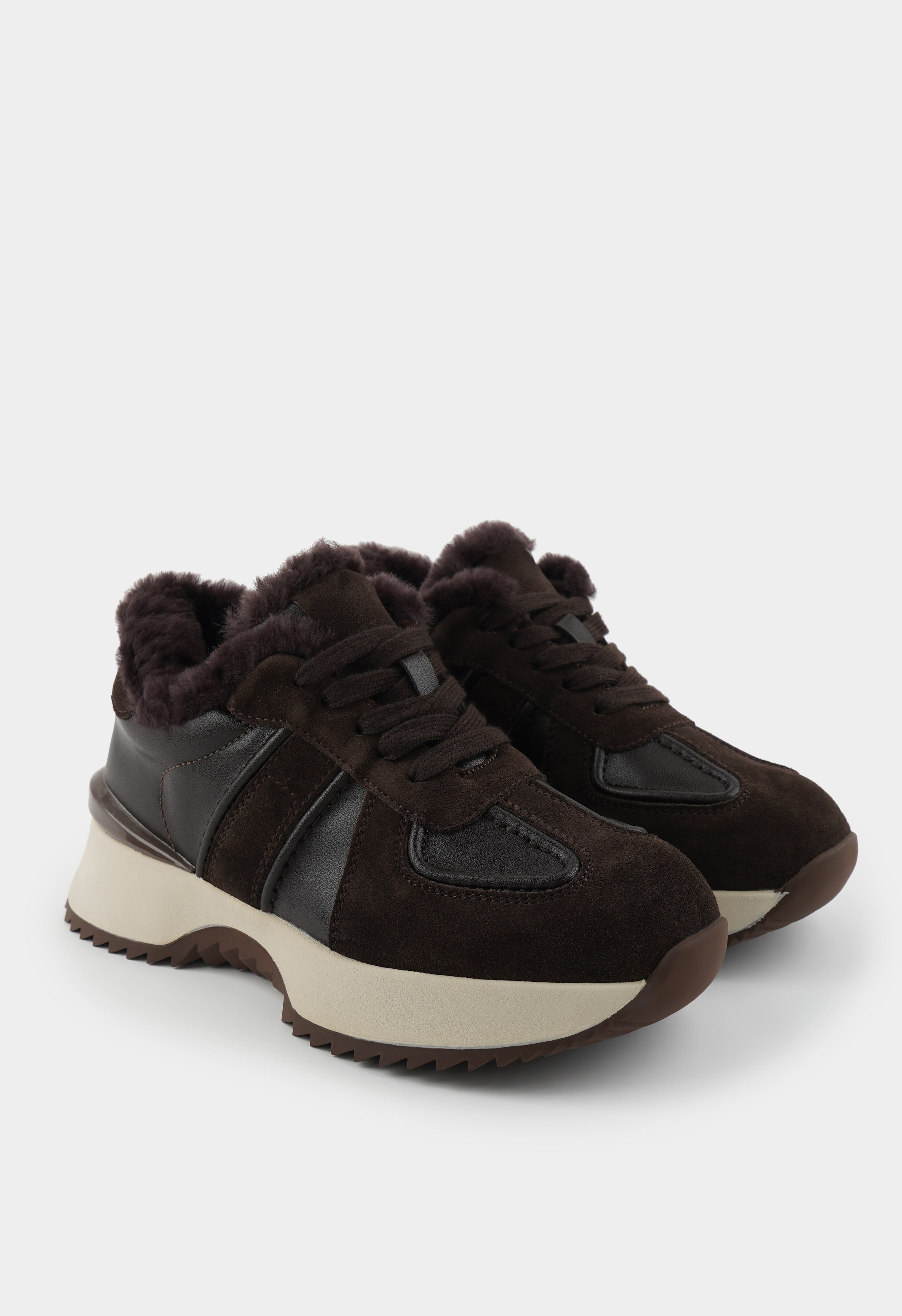 Повседневные полуботинки коричневого цвета станут надежной основой для стильных и удобных образов на каждый день. Сочетание натуральной замши и гладкой кожи придает модели выразительный вид и гарантирует долговечность, в то время как внутренняя отделка из натуральной шерсти сохраняет тепло и комфорт даже в холодное время года. Жесткая подошва обеспечивает устойчивость на любых поверхностях, округлый мысок делает посадку стопы естественной, а шнуровка позволяет подогнать обувь по ноге. Платформа визуально удлиняет силуэт и добавляет легкости шагу, подчеркивая современный характер этой модели.