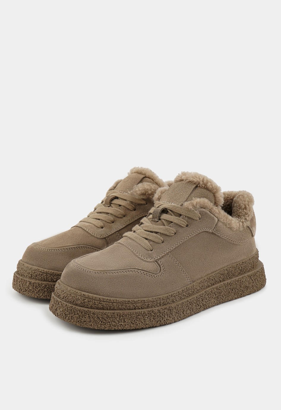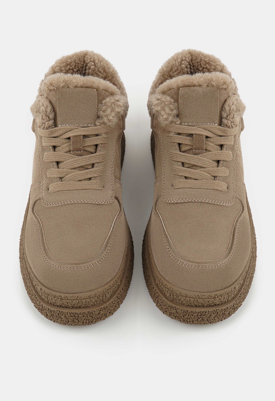 Аккуратные кроссовки светло-коричневого цвета – удачное сочетание комфорта, качества и стиля, созданное для тех, кто ценит практичность в повседневной обуви. Верх из натуральной замши придает модели мягкость и выразительность, в то время как внутренняя отделка из натуральной шерсти обеспечивает приятное ощущение тепла и уюта. Жесткая подошва делает шаг устойчивым, округлый мысок повышает комфорт при движении, а аккуратная шнуровка гарантирует надежную фиксацию. Платформа добавляет легкости походке и придает модели современный, сбалансированный силуэт.