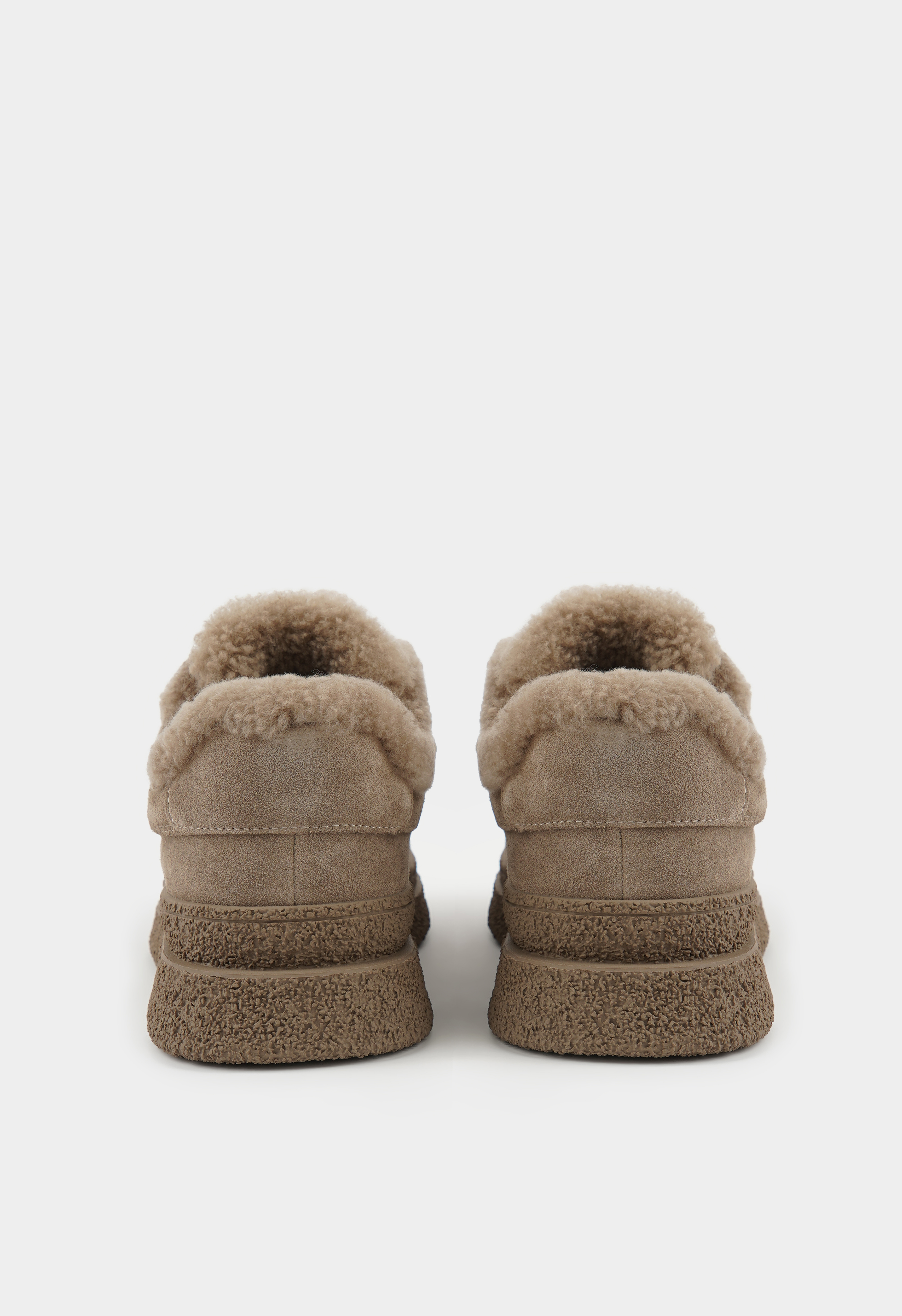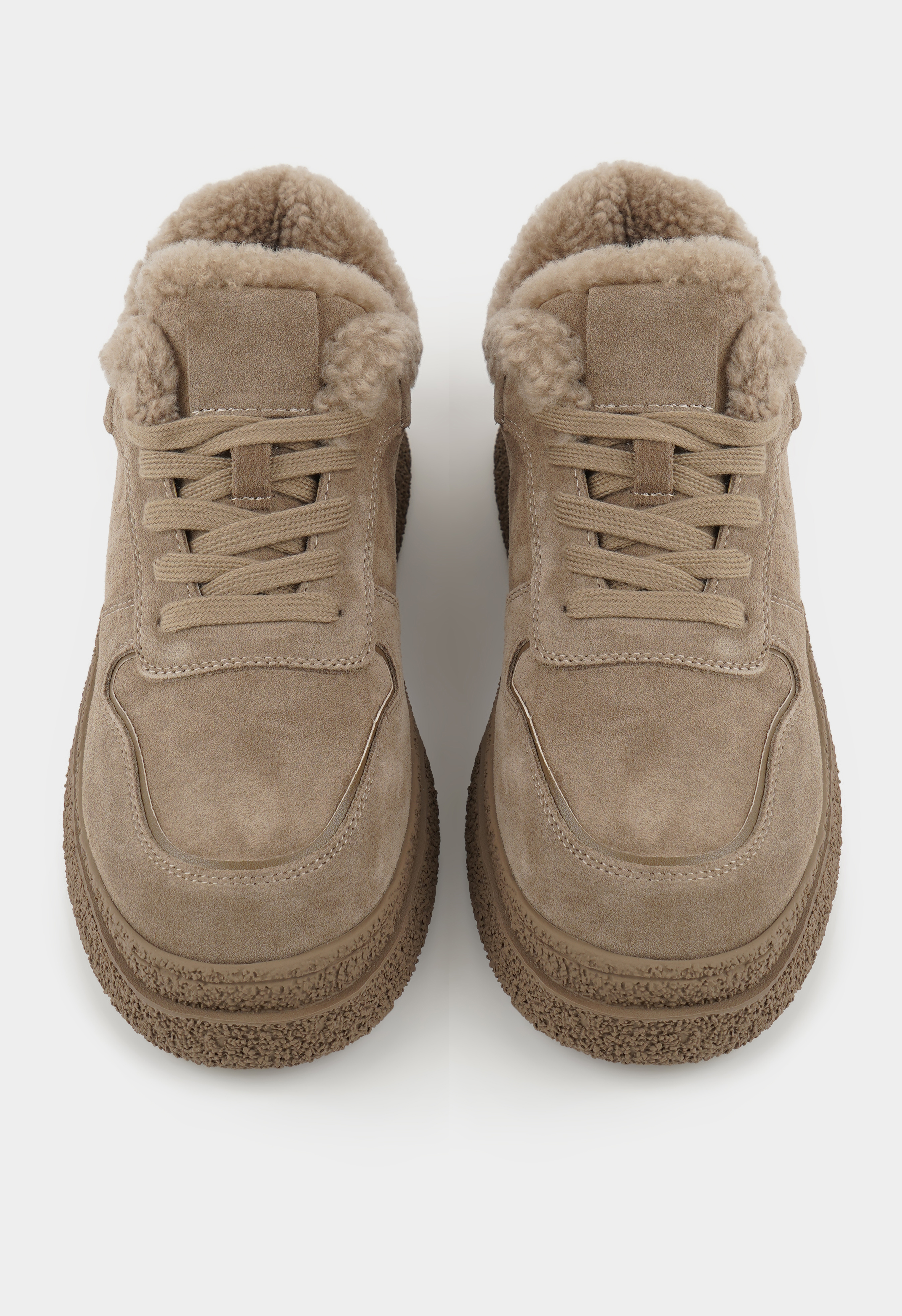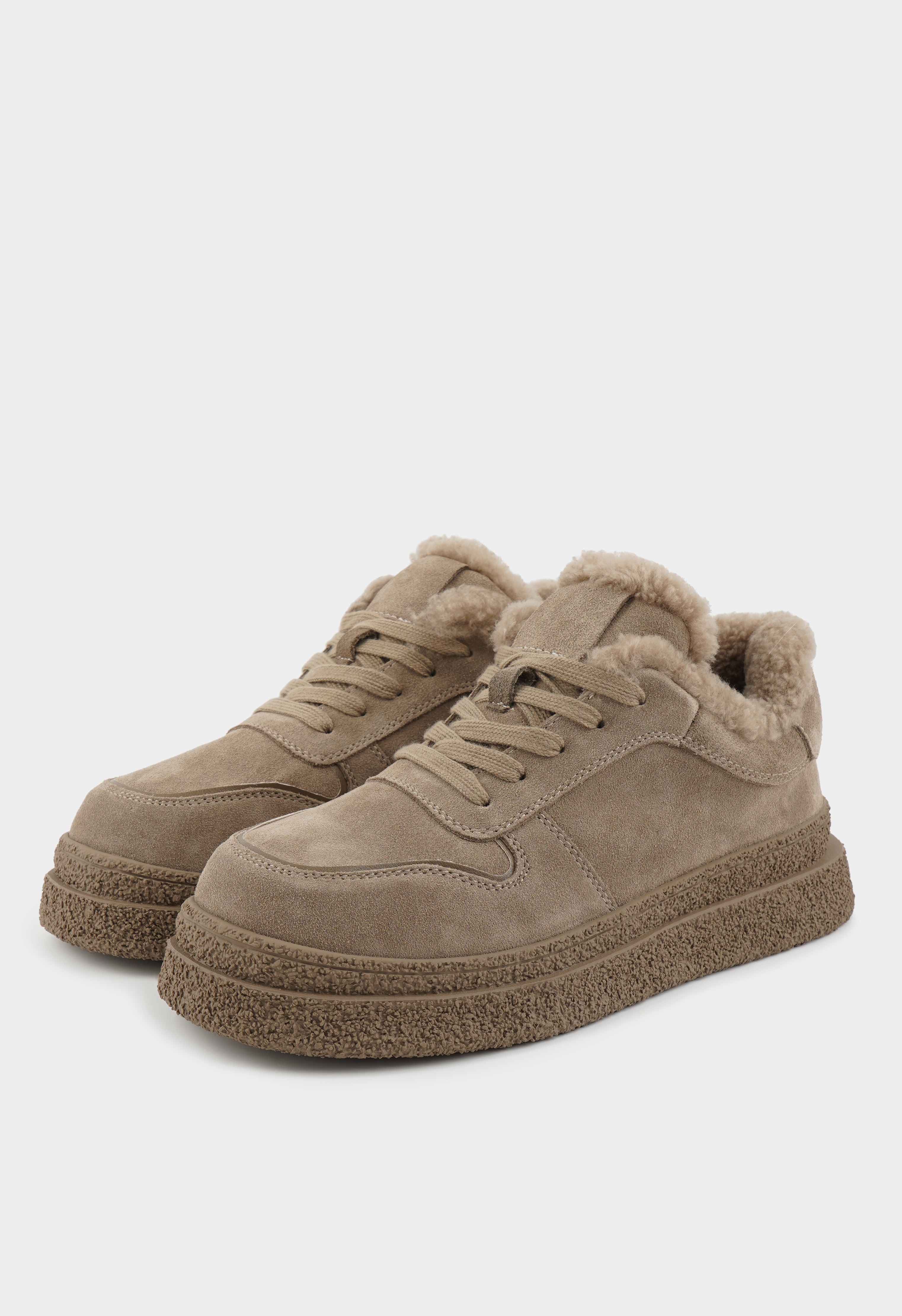 Аккуратные полуботинки светло-коричневого цвета – удачное сочетание комфорта, качества и стиля, созданное для тех, кто ценит практичность в повседневной обуви. Верх из натуральной замши придает модели мягкость и выразительность, в то время как внутренняя отделка из натуральной шерсти обеспечивает приятное ощущение тепла и уюта. Жесткая подошва делает шаг устойчивым, округлый мысок повышает комфорт при движении, а аккуратная шнуровка гарантирует надежную фиксацию. Платформа добавляет легкости походке и придает модели современный, сбалансированный силуэт.