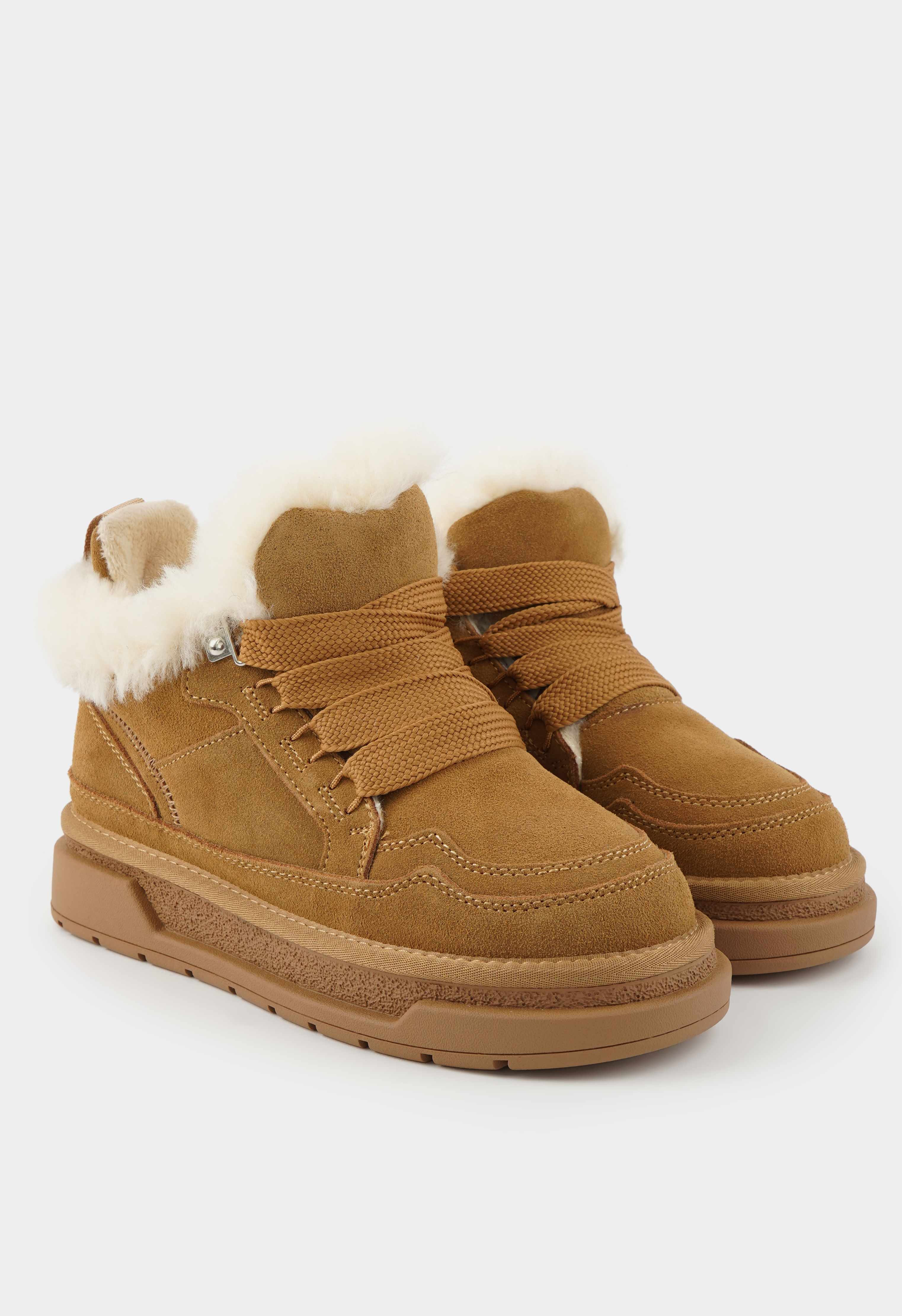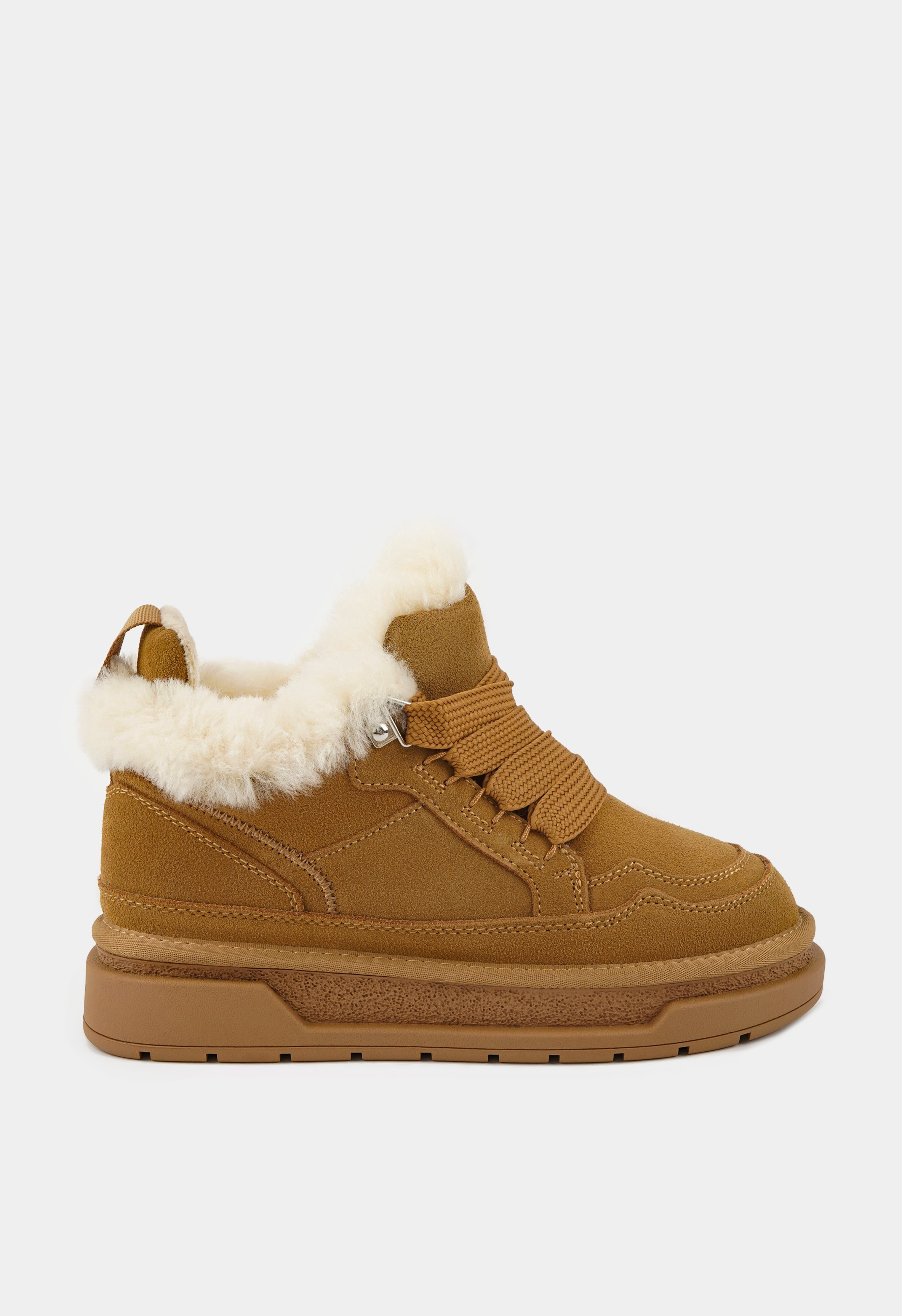 Универсальные ботинки в рыжем цвете станут надежным и стильным решением для холодного сезона. Верх выполнен из мягкой натуральной замши, которая подчеркивает практичность модели, внутренняя отделка из натуральной шерсти обеспечивает уют и комфорт при любой погоде. Жесткая подошва гарантирует устойчивость, округлый мысок делает обувь удобной для длительной носки, аккуратная шнуровка позволяет подогнать обувь по ноге, а серебряная фурнитура добавляет утонченный блеск. Платформа придает шагу легкость и уверенность, создавая гармоничное сочетание практичности и современного стиля.