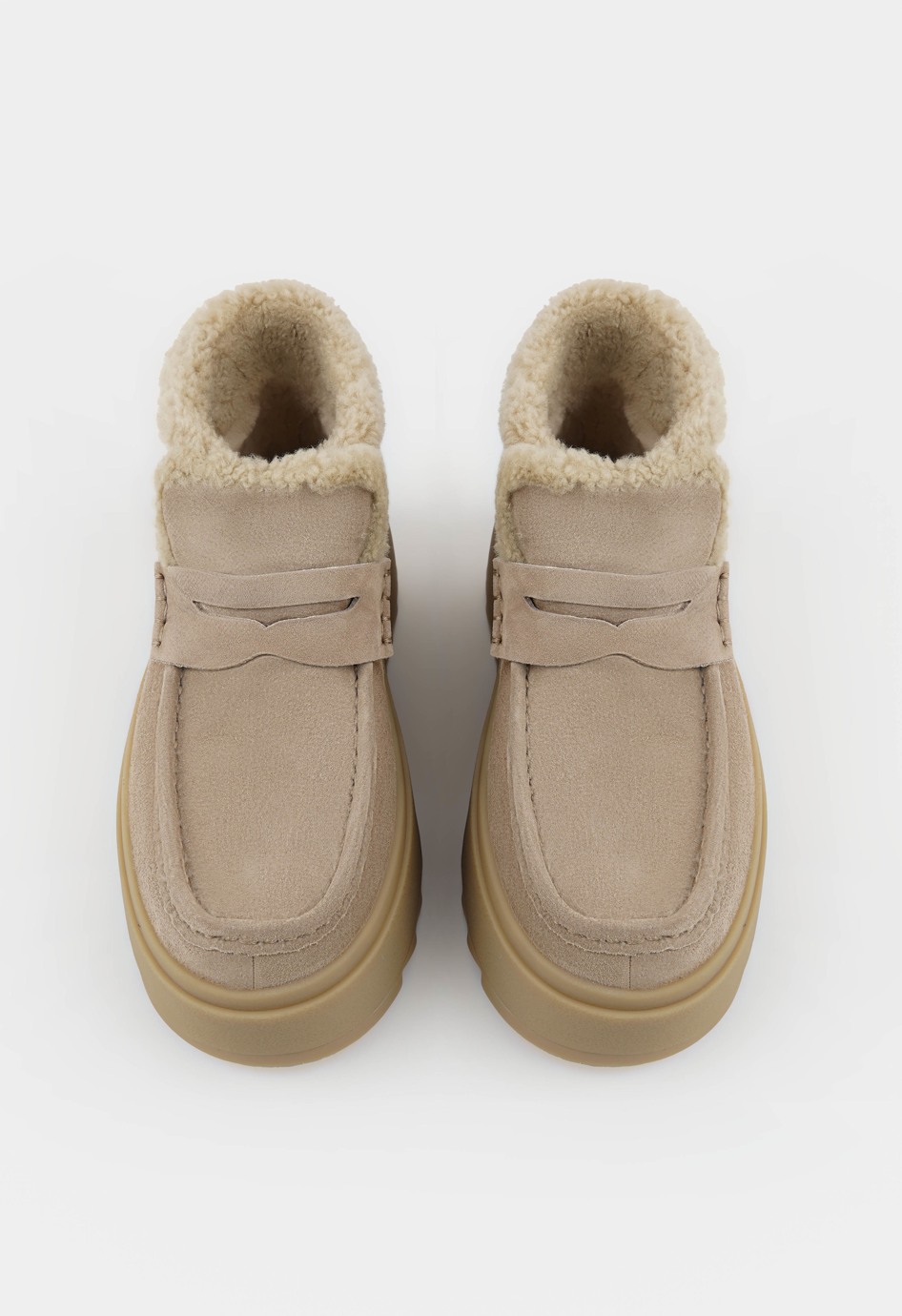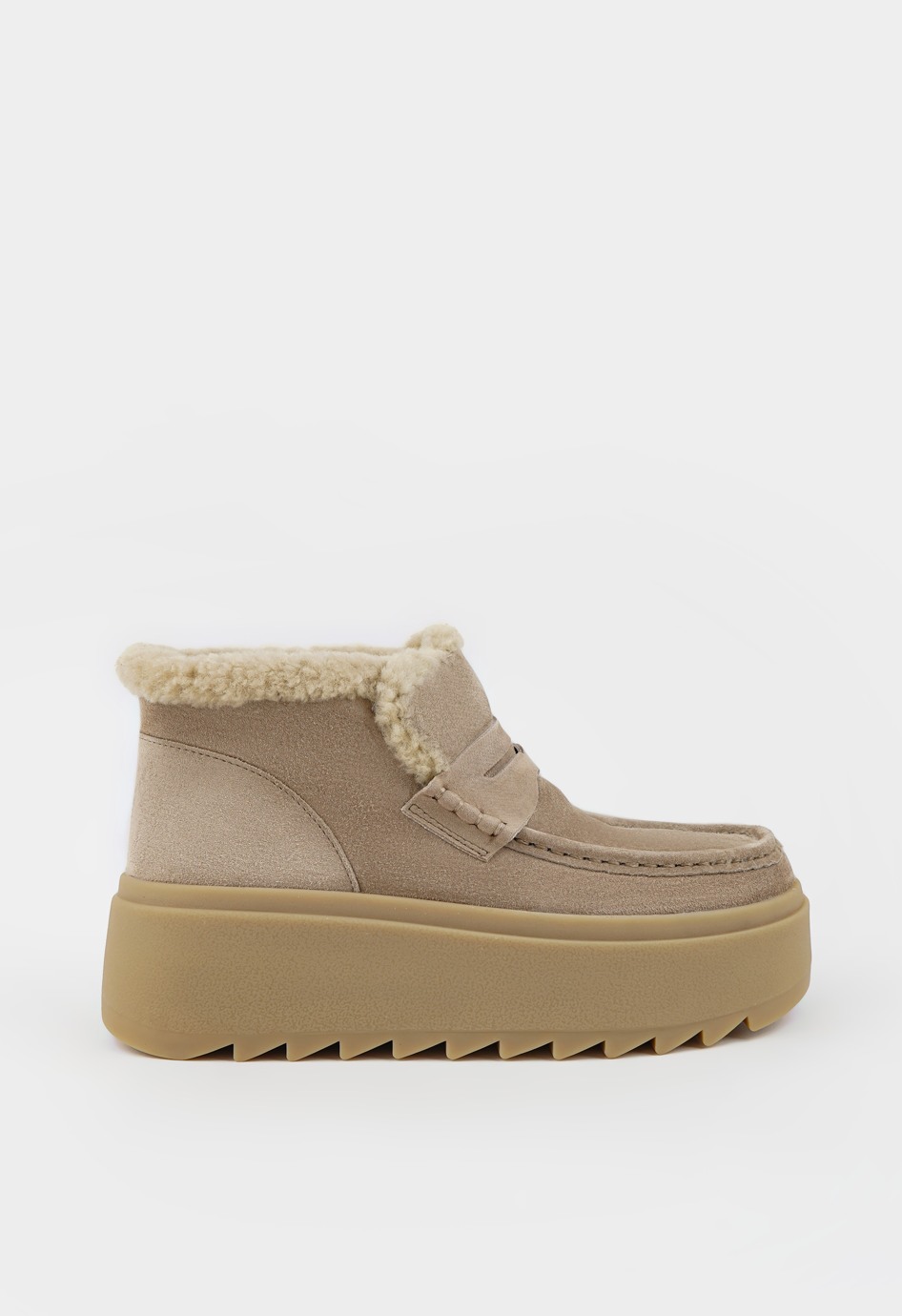 Идеальные ботинки для сурового сезона, созданные из роскошной бежевой замши с утеплением натуральным мехом, где каждая деталь подчинена гармонии комфорта и стиля: массивная платформа и жесткая подошва обеспечивают внушительную устойчивость на зимних улицах, а элегантный округлый мысок и аккуратные втачные резинки формируют изящный силуэт и идеальную посадку. Модель демонстрирует продуманную эстетику – теплое внутреннее покрытие становится надежной защитой от мороза, а благородный материал и лаконичный дизайн превращают эти ботинки в универсального спутника для повседневной носки, легко сочетаясь с трендовыми образами.