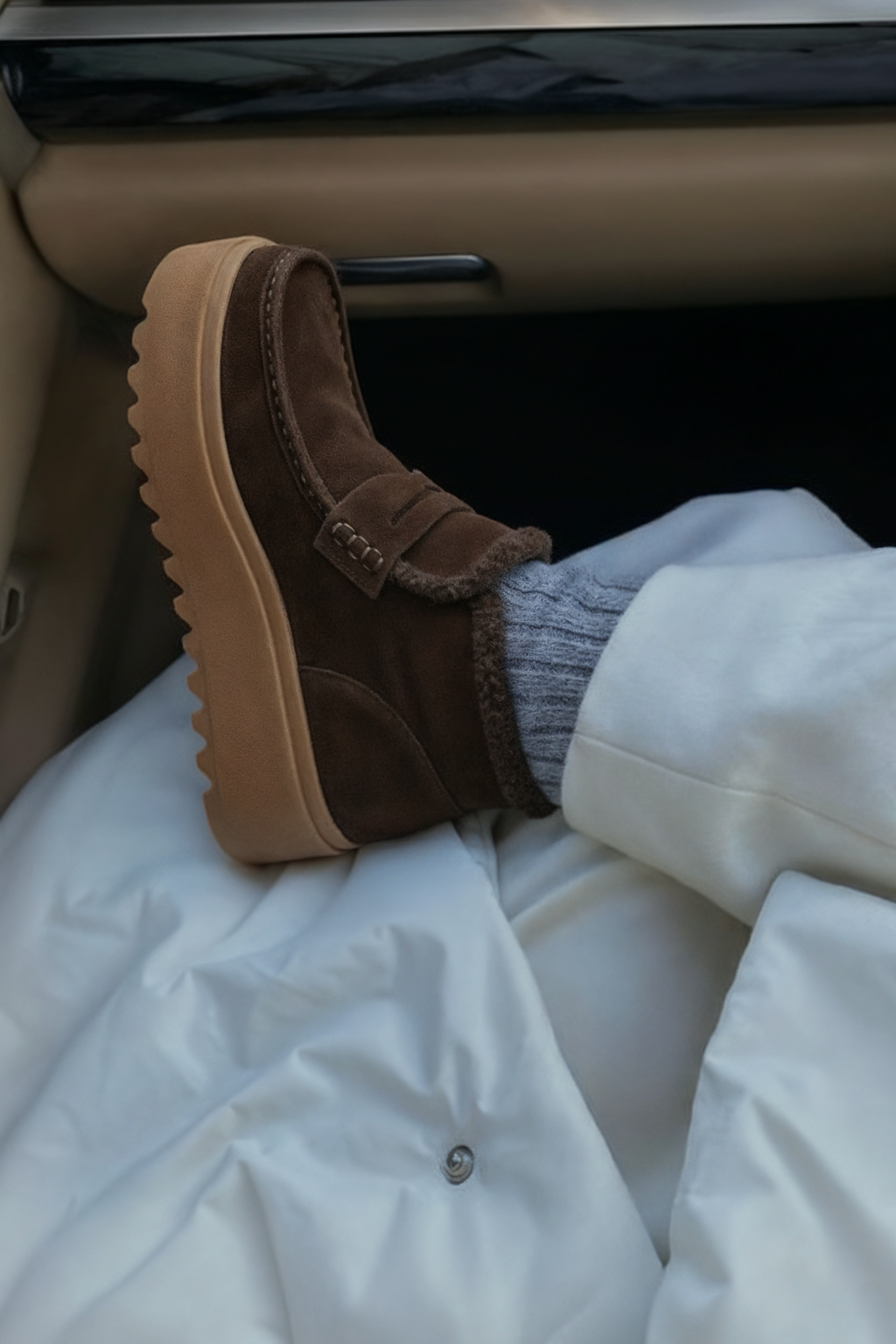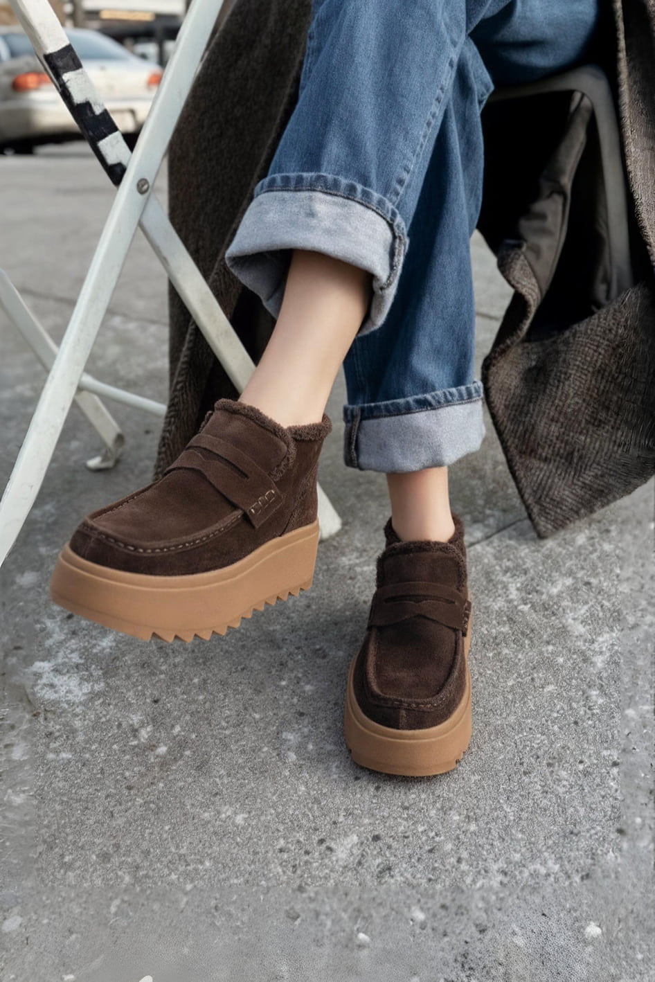 Идеальные ботинки для сурового сезона, созданные из роскошной коричневой замши с утеплением натуральным мехом, где каждая деталь подчинена гармонии комфорта и стиля: массивная платформа и жесткая подошва обеспечивают внушительную устойчивость на зимних улицах, а элегантный округлый мысок и аккуратные втачные резинки формируют изящный силуэт и идеальную посадку. Модель демонстрирует продуманную эстетику – теплое внутреннее покрытие становится надежной защитой от мороза, а благородный материал и лаконичный дизайн превращают эти ботинки в универсального спутника для повседневной носки, легко сочетаясь с трендовыми образами.