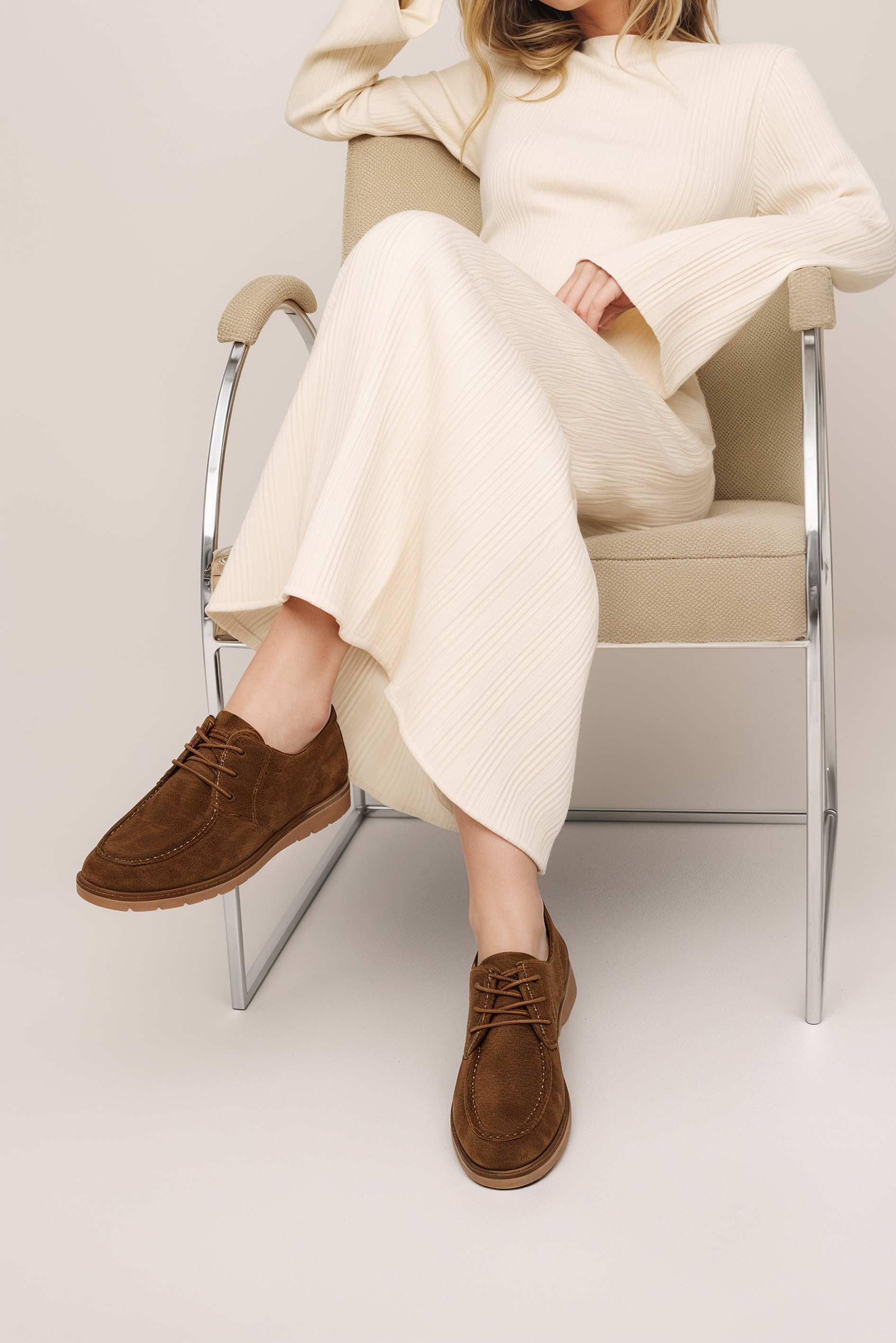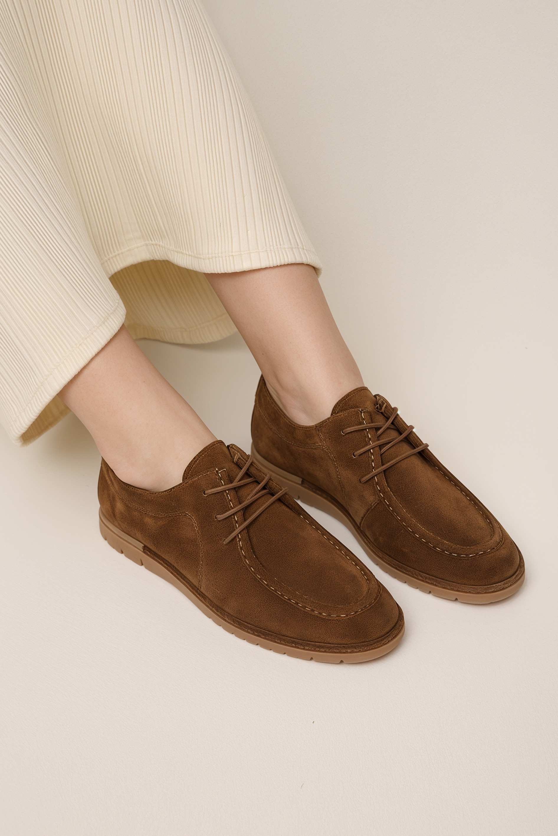 Полуботинки из натуральной замши в благородном коричневом цвете – универсальная обувь для тех, кто ценит стиль и комфорт каждый день. Мягкая замша создает ощущение уюта, а гибкая подошва и аккуратный округлый мысок дарят легкость и свободу движений. Классическая шнуровка подчеркивает аккуратный силуэт и позволяет идеально регулировать посадку. Эта модель легко вписывается в повседневный гардероб и становится гармоничным завершением как деловых, так и расслабленных образов.