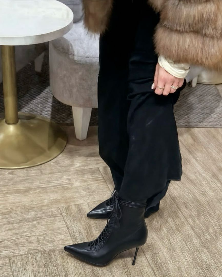 Дерзкие ботильоны из натуральной кожи с мягкой байкой внутри – смелое сочетание комфорта и яркого стиля. Черный цвет мгновенно притягивает взгляды, а заостренный мысок и изящная шпилька подчеркивают женственность и уверенность в себе. Гибкая подошва дарит легкость движений, в то время как удобная комбинация шнуровки и молнии обеспечивает идеальную посадку. Черная и металлическая фурнитура добавляют утонченного блеска, делая пару гармоничным акцентом в образе.
