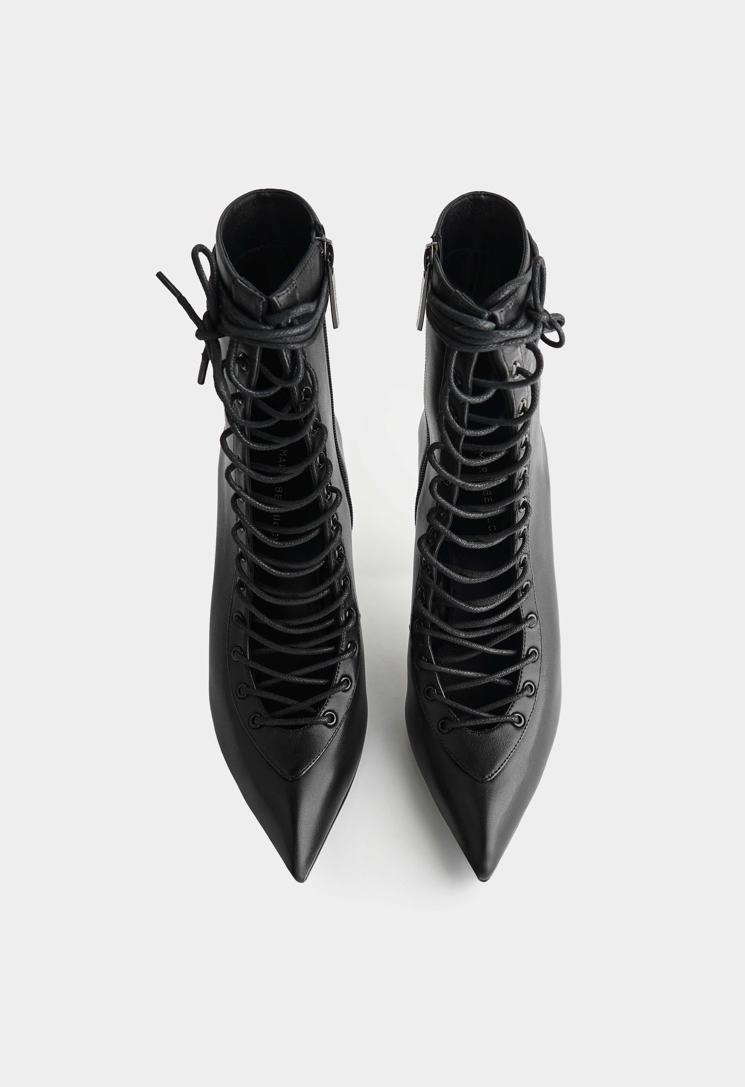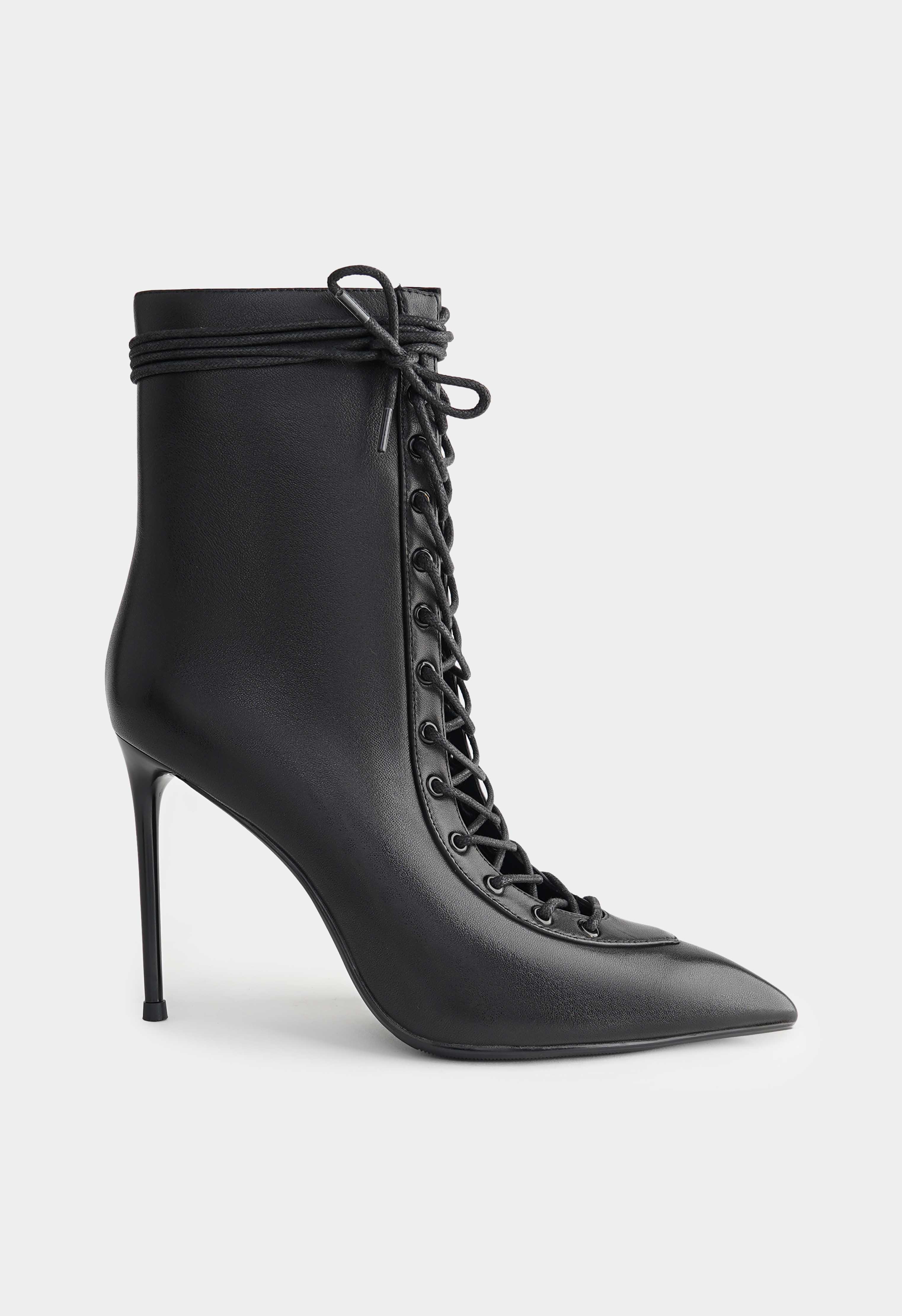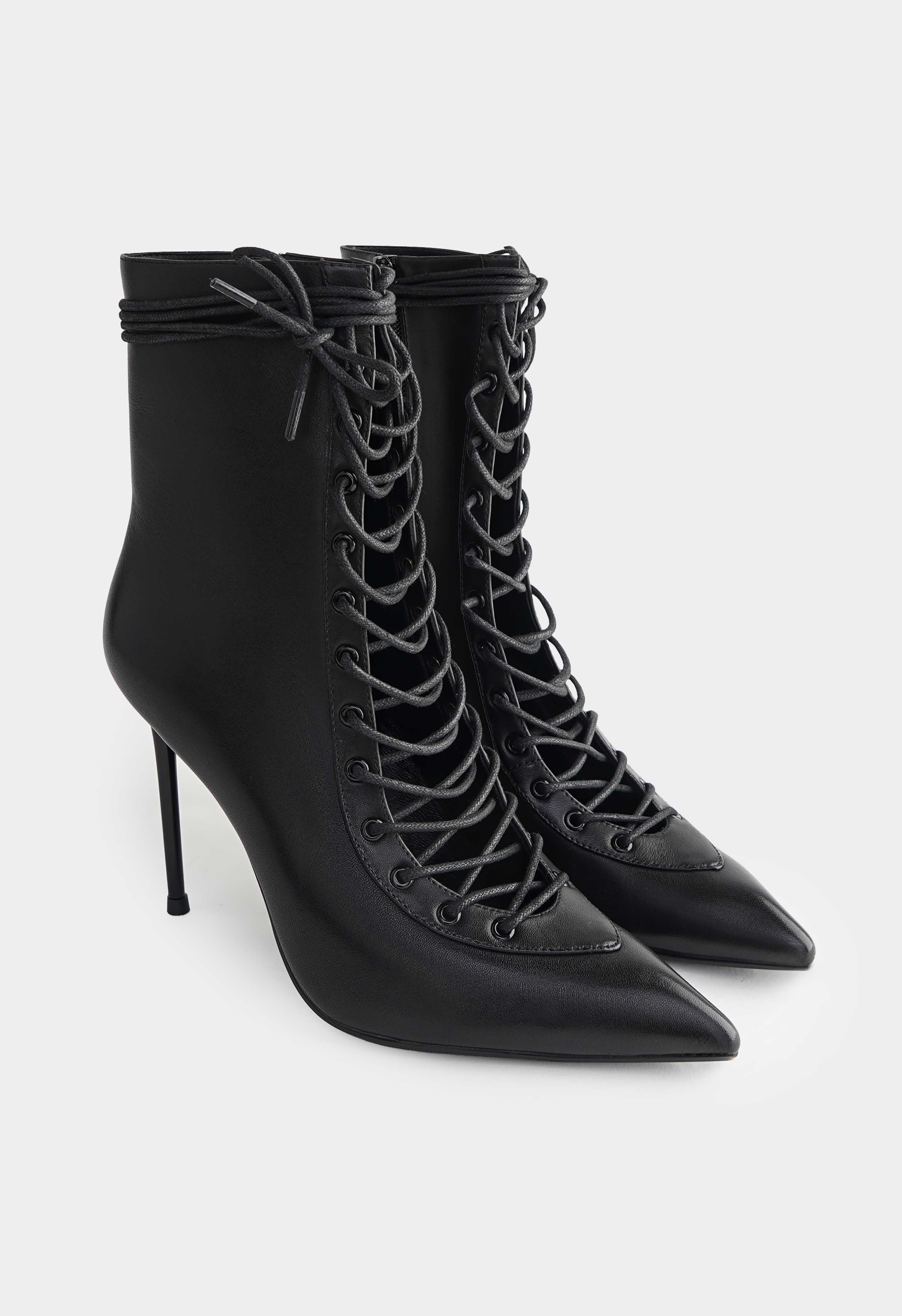 Эффектные ботильоны в классическом черном цвете – выбор для уверенных и стильных образов. Модель выполнена из натуральной кожи, которая мягко садится по ноге, а заостренный мысок визуально удлиняет силуэт и добавляет элегантности. Тонкая шпилька подчеркивает женственность, в то время как сочетание молнии и шнуровки обеспечивает идеальную посадку и удобство. Фурнитура в металлик и черном оттенке добавляет характерный акцент, гибкая подошва дарит комфорт даже при длительной носке.