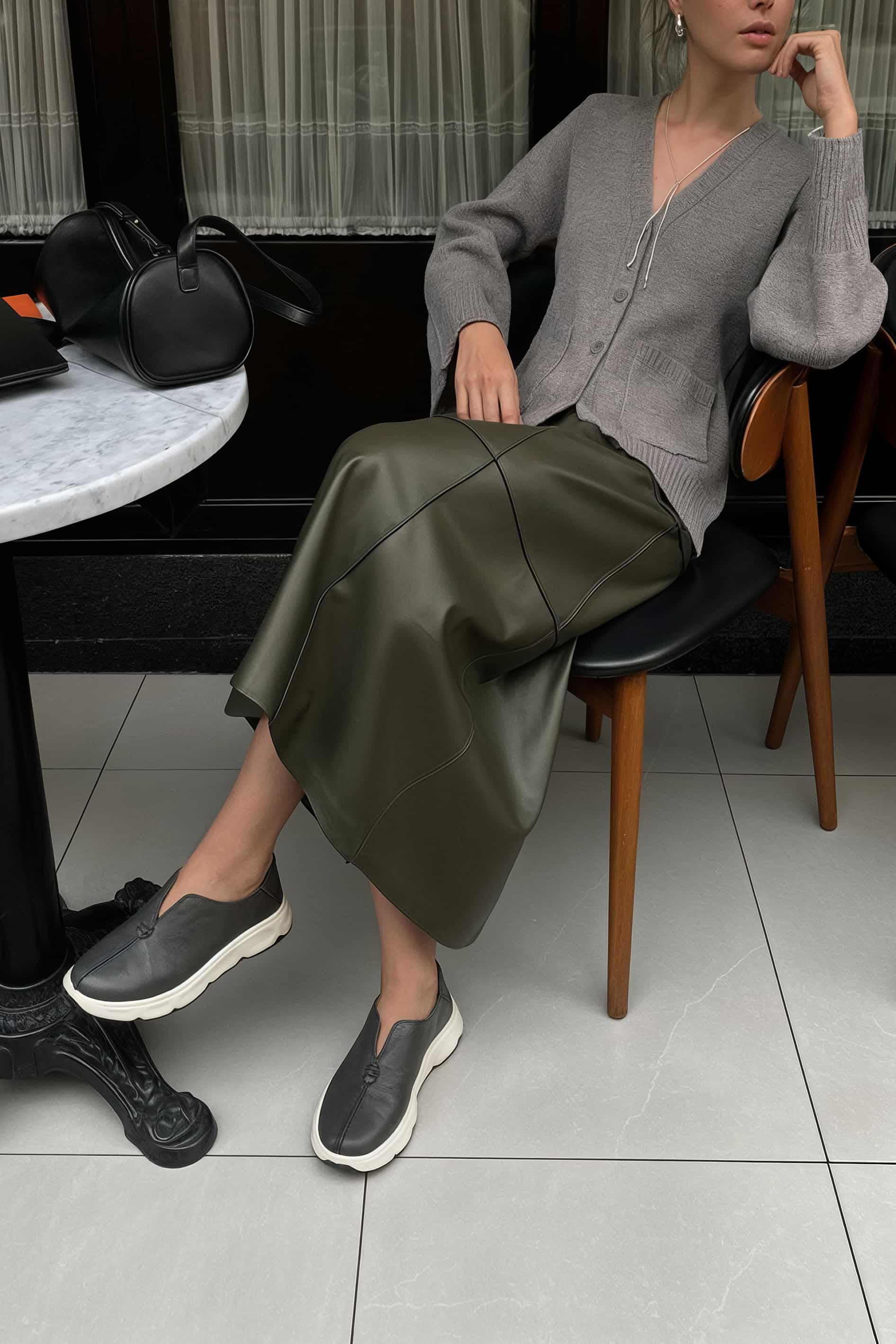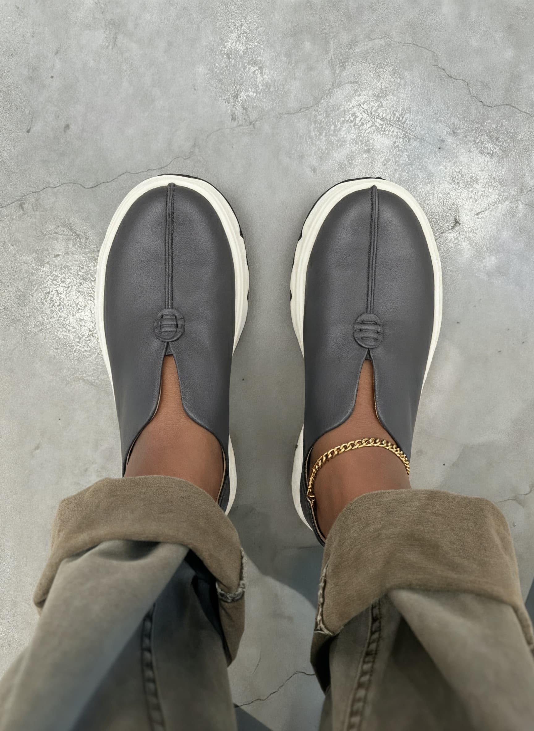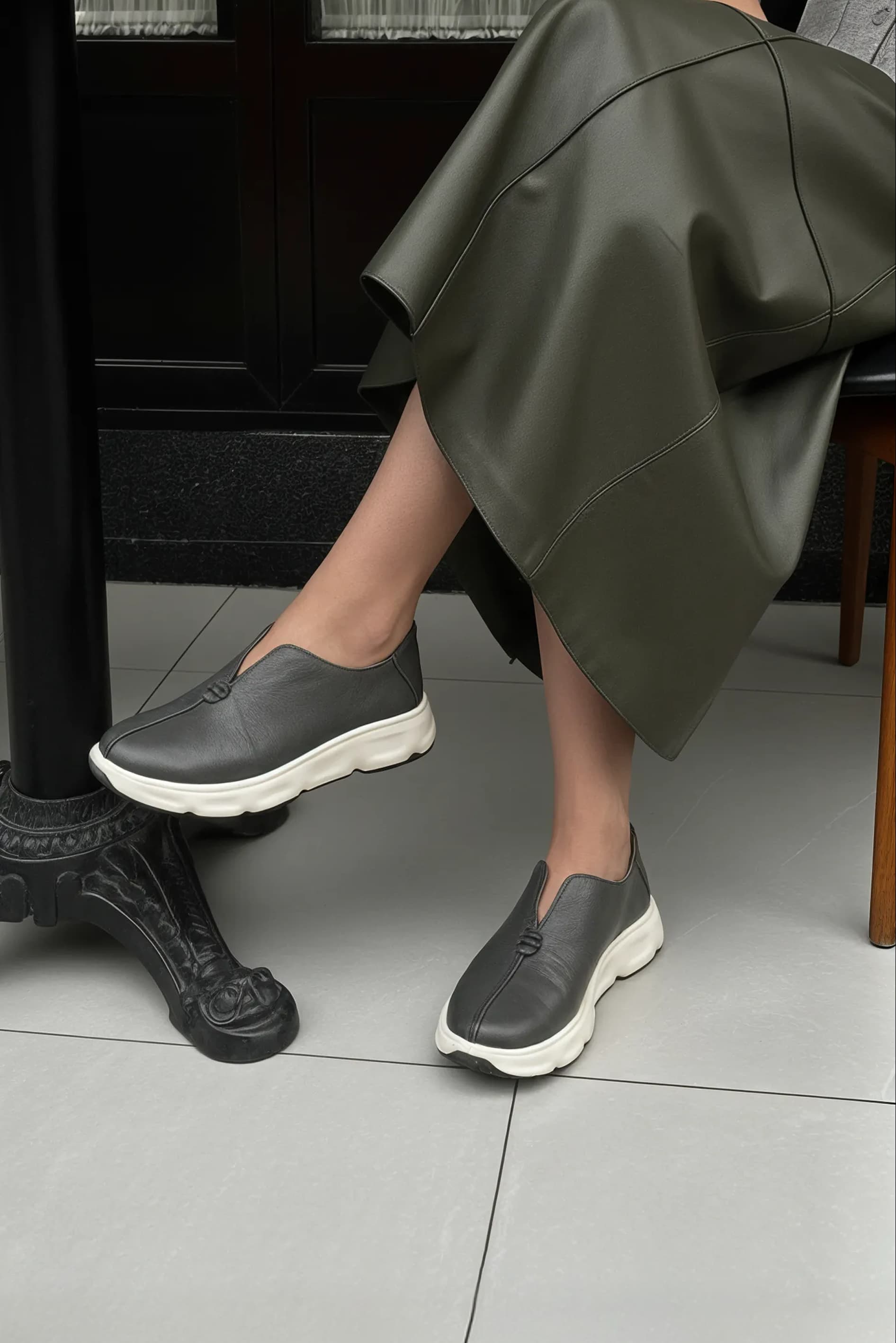 Повседневные слипперы из мягкой натуральной кожи в универсальном черном цвете – идеальный баланс стиля и комфорта для активных дней. Легкая белая платформа и гибкая подошва дарят ощущение невесомости при каждом шаге, а округлый мысок обеспечивает свободу и удобную посадку стопы. Лаконичный дизайн легко впишется как в повседневные, так и в более строгие образы, добавляя им современного акцента.