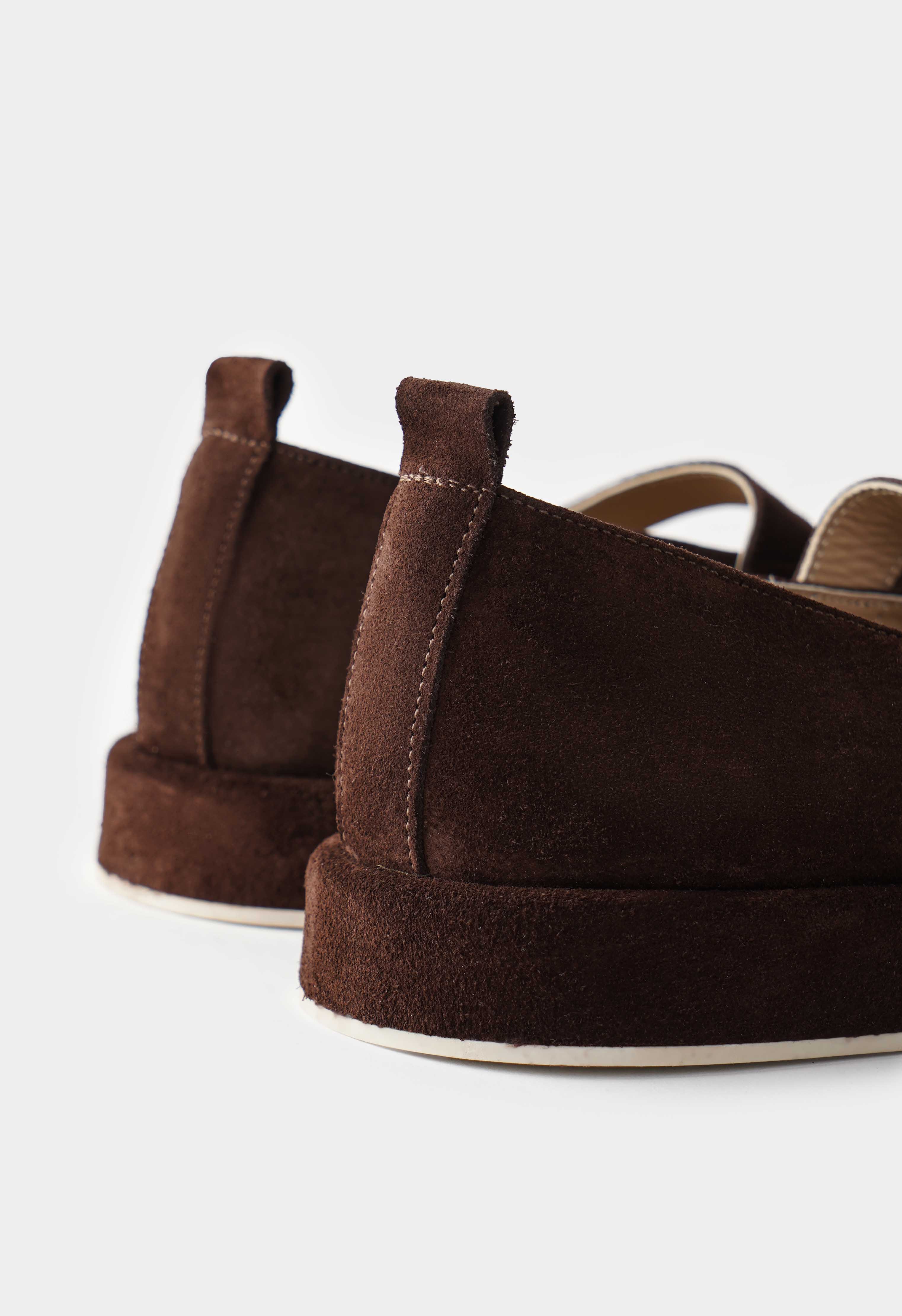 Стильные балетки в глубоком коричневом оттенке – идеальное сочетание комфорта и актуального дизайна. Верх из натуральной замши выглядит мягко и благородно, а округлый мысок обеспечивает удобную посадку на каждый день. Легкая платформа добавляет высоту и делает силуэт более выразительным. Акцентная золотая пряжка придает модели изысканность, в то время как жесткая подошва гарантирует устойчивость и долговечность.