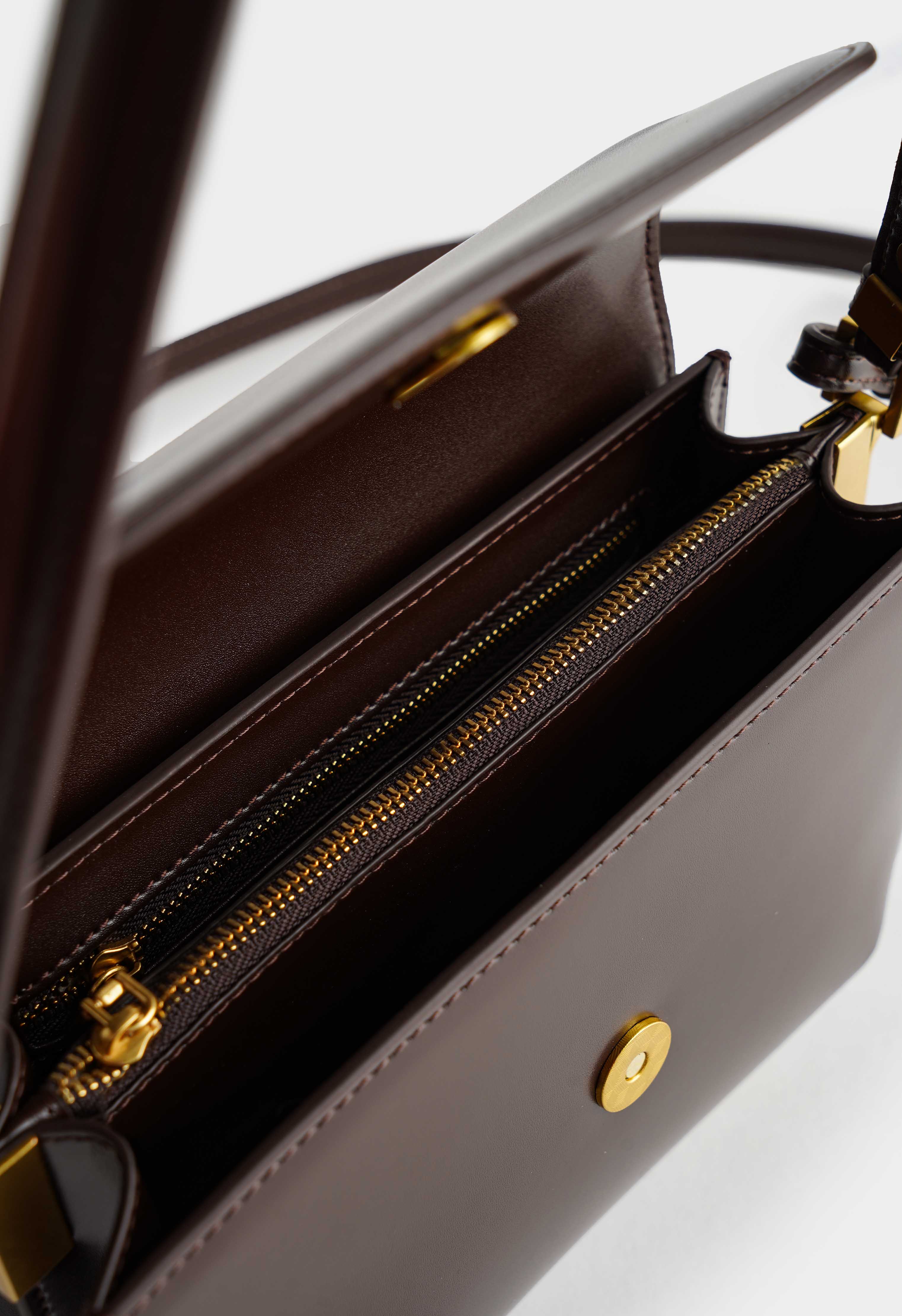 три отделения, одно на молнии, внутри — карман на молнии и открытый карман.