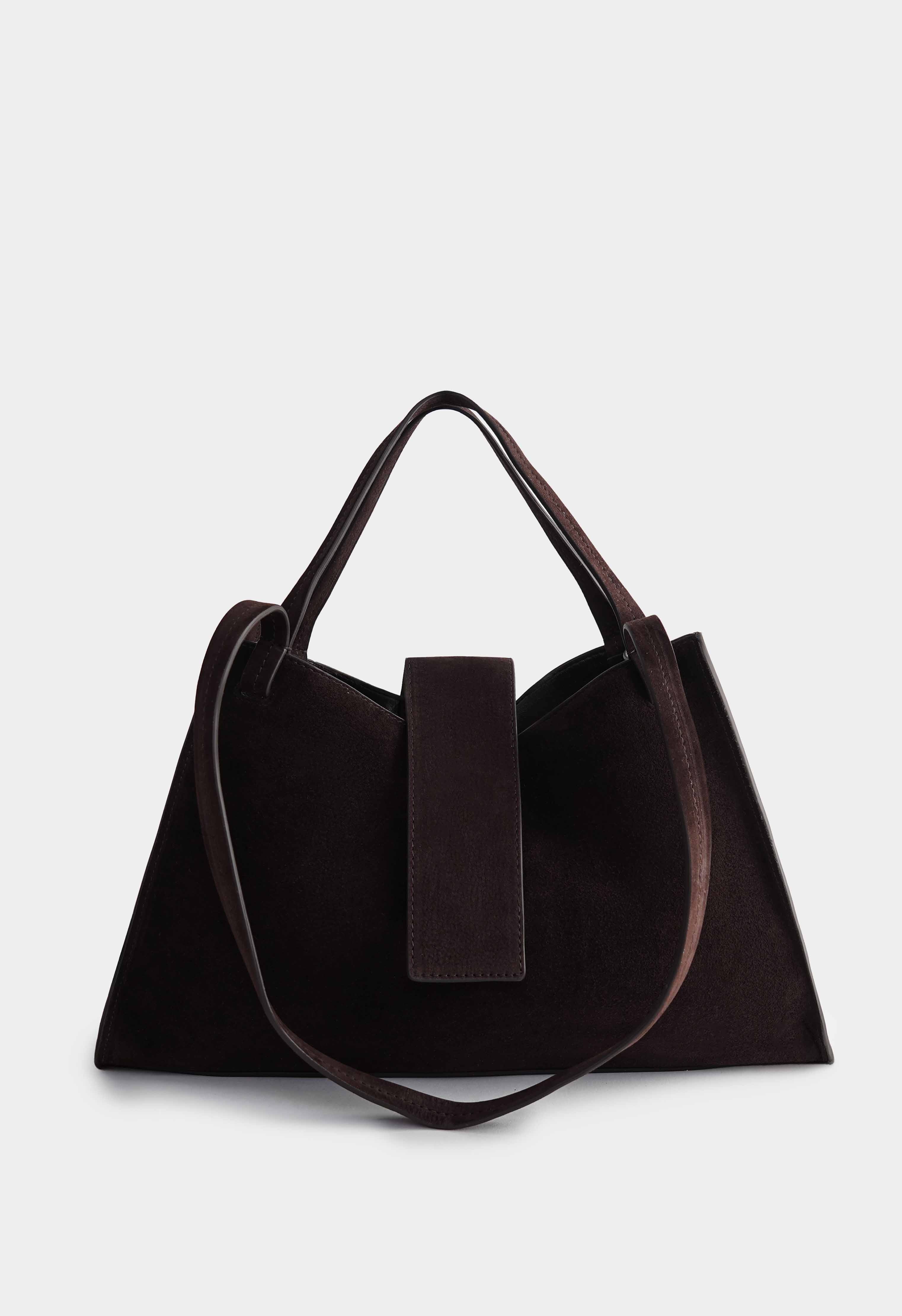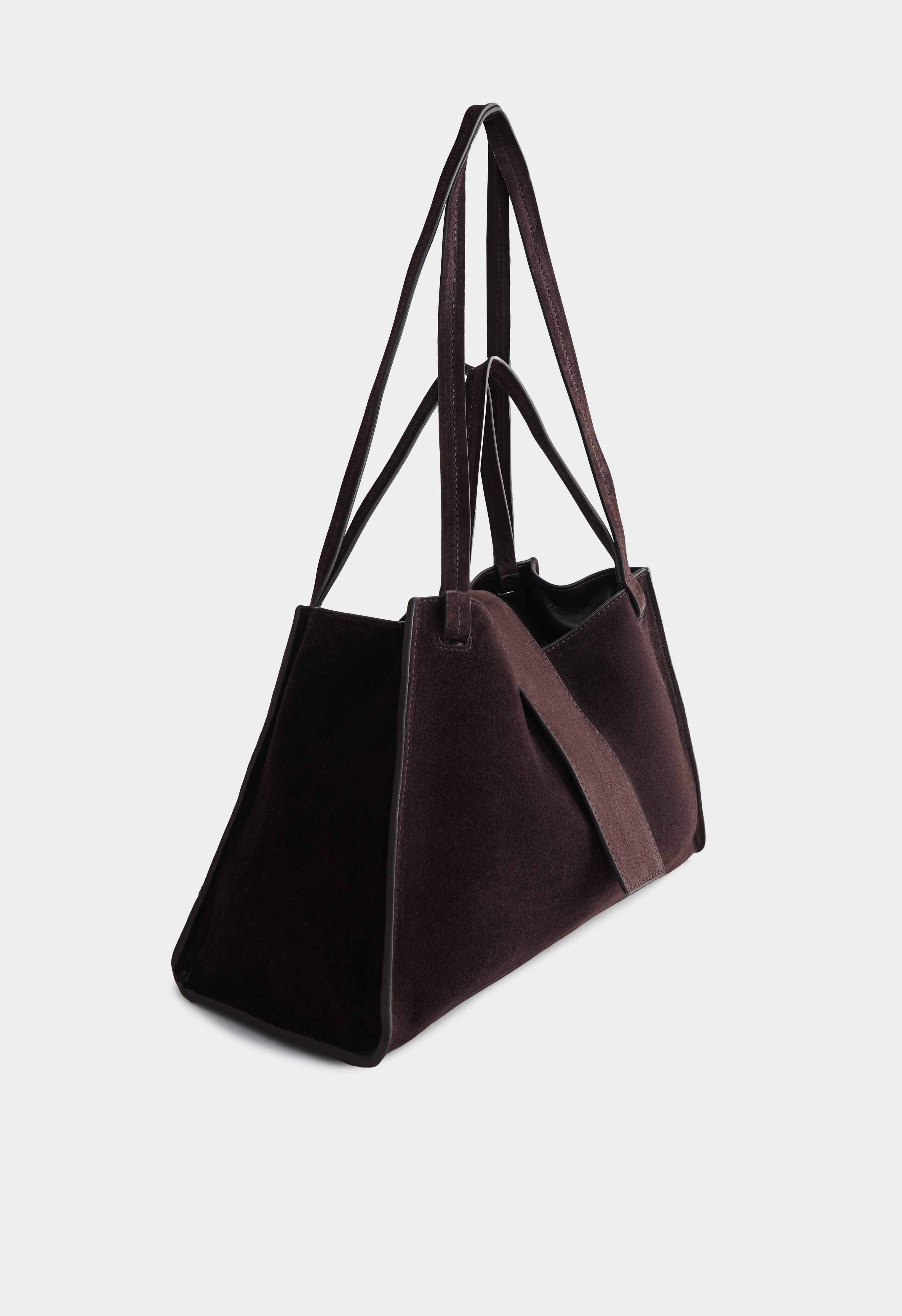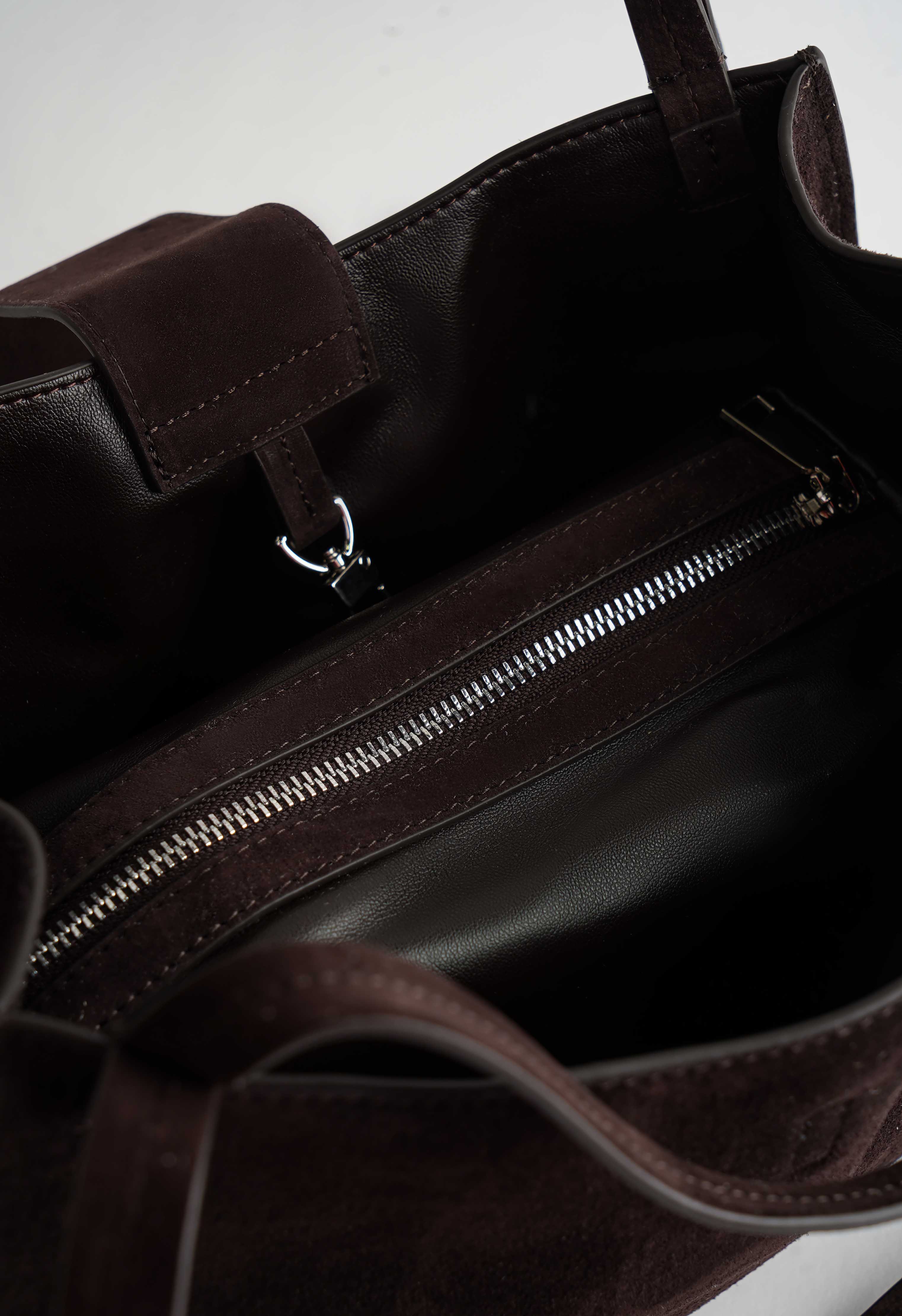 Стильная сумка в насыщенном темно-коричневом цвете из натуральной замши выглядит эффектно за счет мягкой бархатистой фактуры и архитектурной формы. Аккуратная серебряная фурнитура и карабин добавляют современный акцент и подчеркивают лаконичный дизайн. Внутри предусмотрены два кармана для мелочей, а кожаный вкладыш на молнии помогает хранить ценные вещи отдельно и поддерживать идеальный порядок.