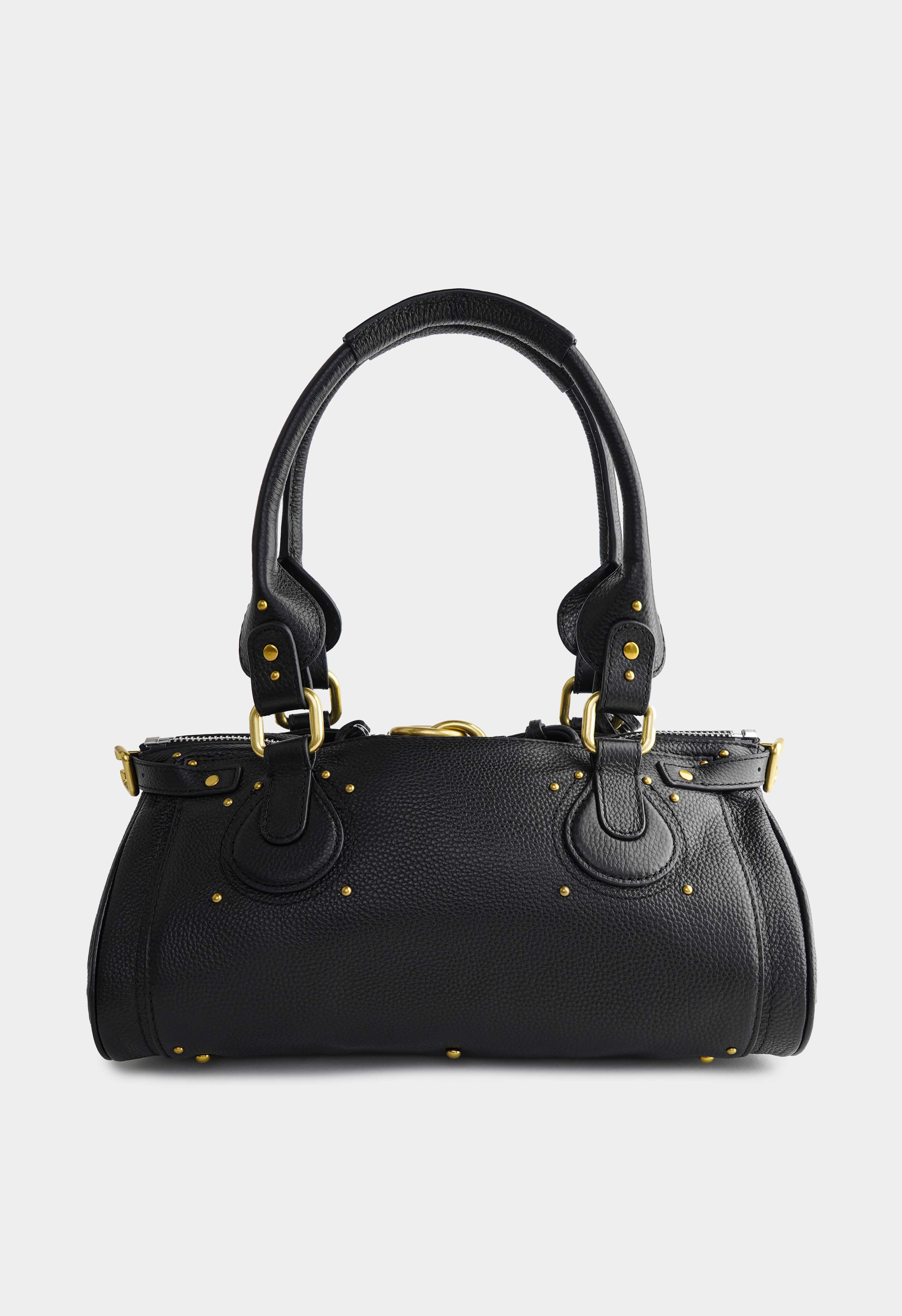 Трендовая сумка в черном цвете из натуральной зернистой кожи выглядит статусно и заметно за счет эффектной золотой фурнитуры. Аккуратная форма с плотными ручками и декоративным замком создает премиальный внешний вид модели, а надежная молния сохраняет содержимое в порядке. Внутри одно основное отделение с удобной организацией: карман на молнии для ценного и открытый карман для мелочей. Снаружи предусмотрены два внешних кармана. Компактный размер, выразительные детали и практичная компоновка делают сумку удачным выбором для города, встреч и активных дней.