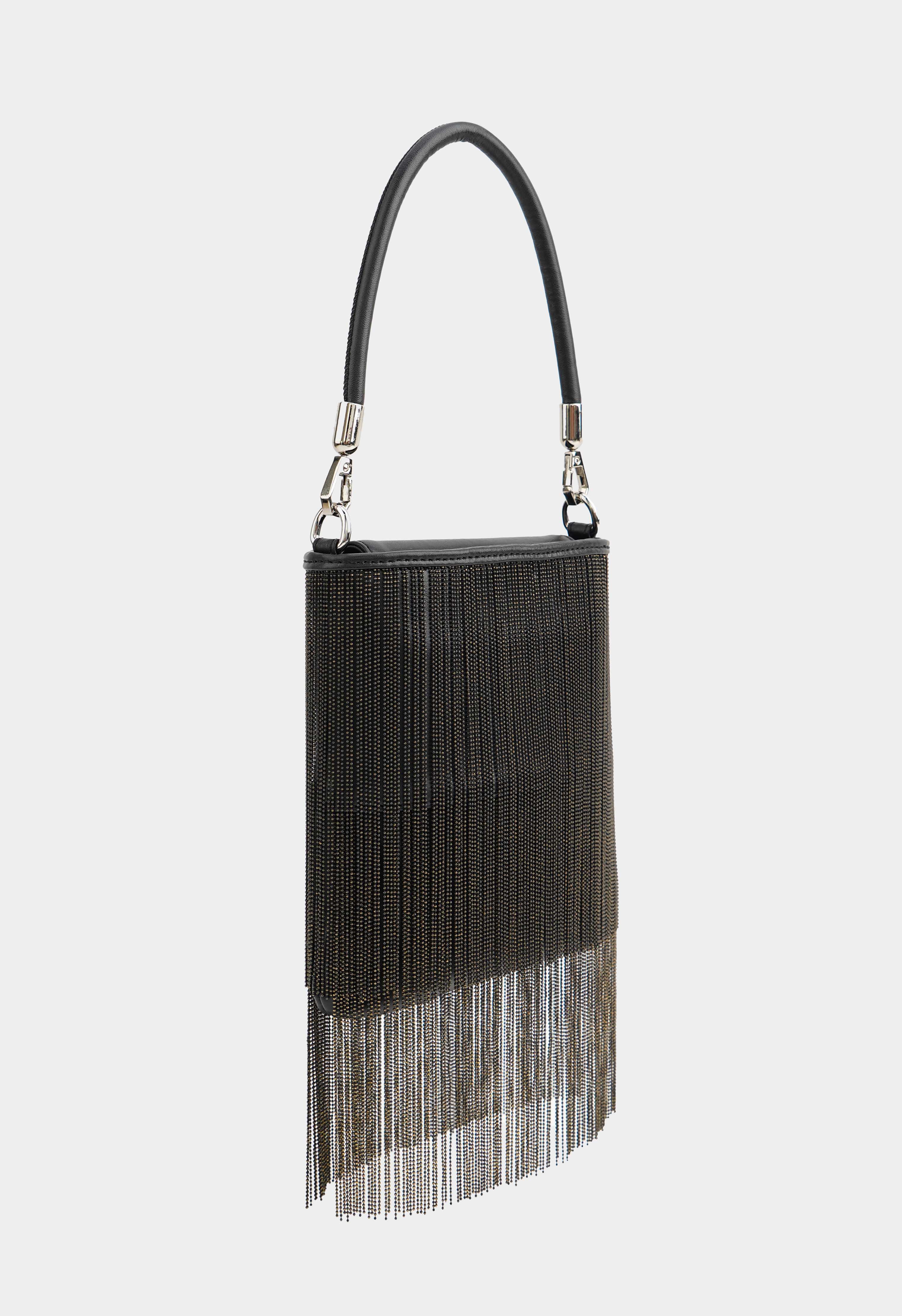 Сумка из черной натуральной кожи с бахромой – эффектный аксессуар, который добавляет образу движения и настроения: съемная ручка позволяет менять стиль носки, а плечевой ремень в комплекте делает ее удобной для города и вечера. Клапан аккуратно закрывает сумку, серебряная фурнитура подчеркивает современный характер модели и красиво сочетается с базовым черным оттенком.
