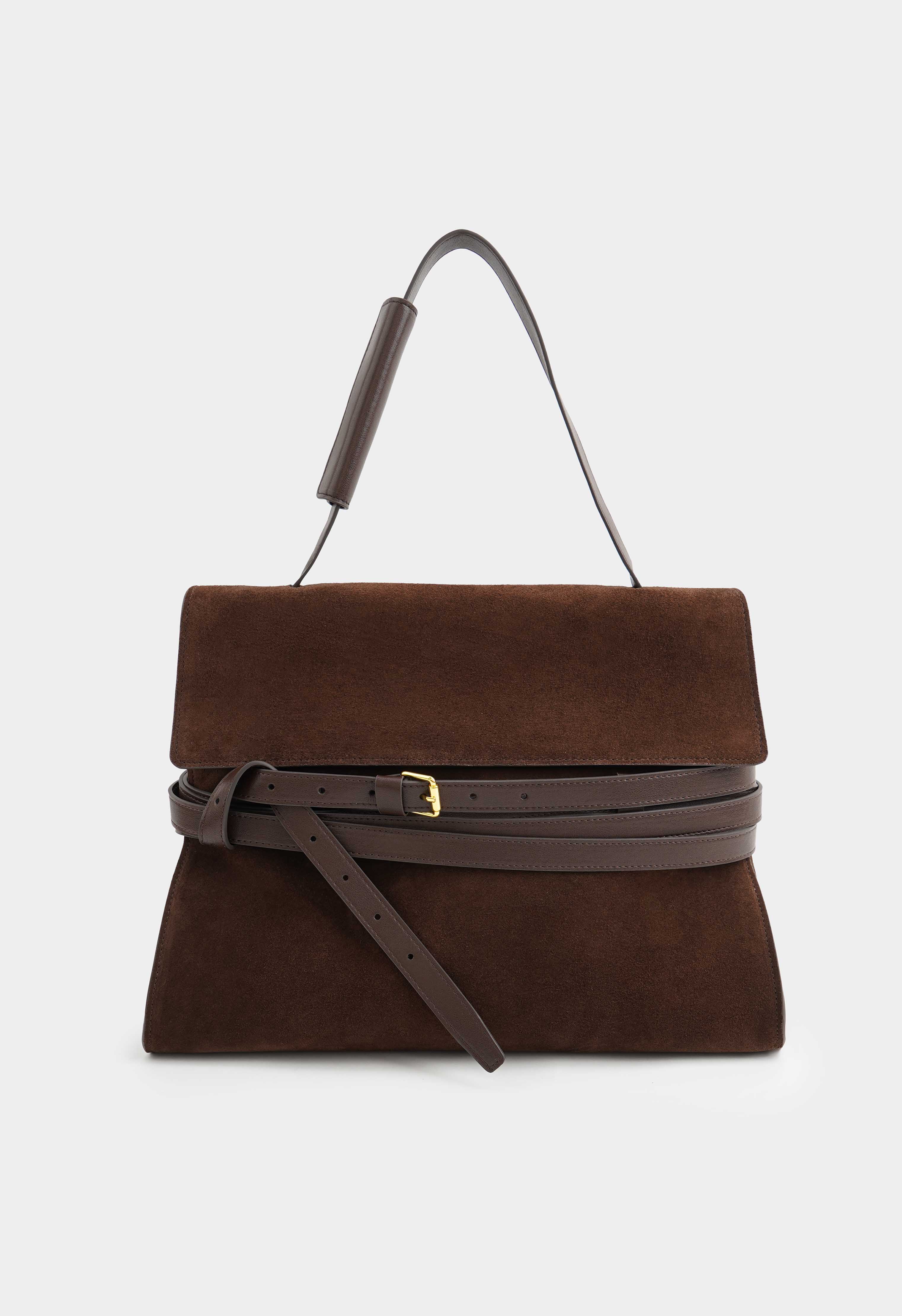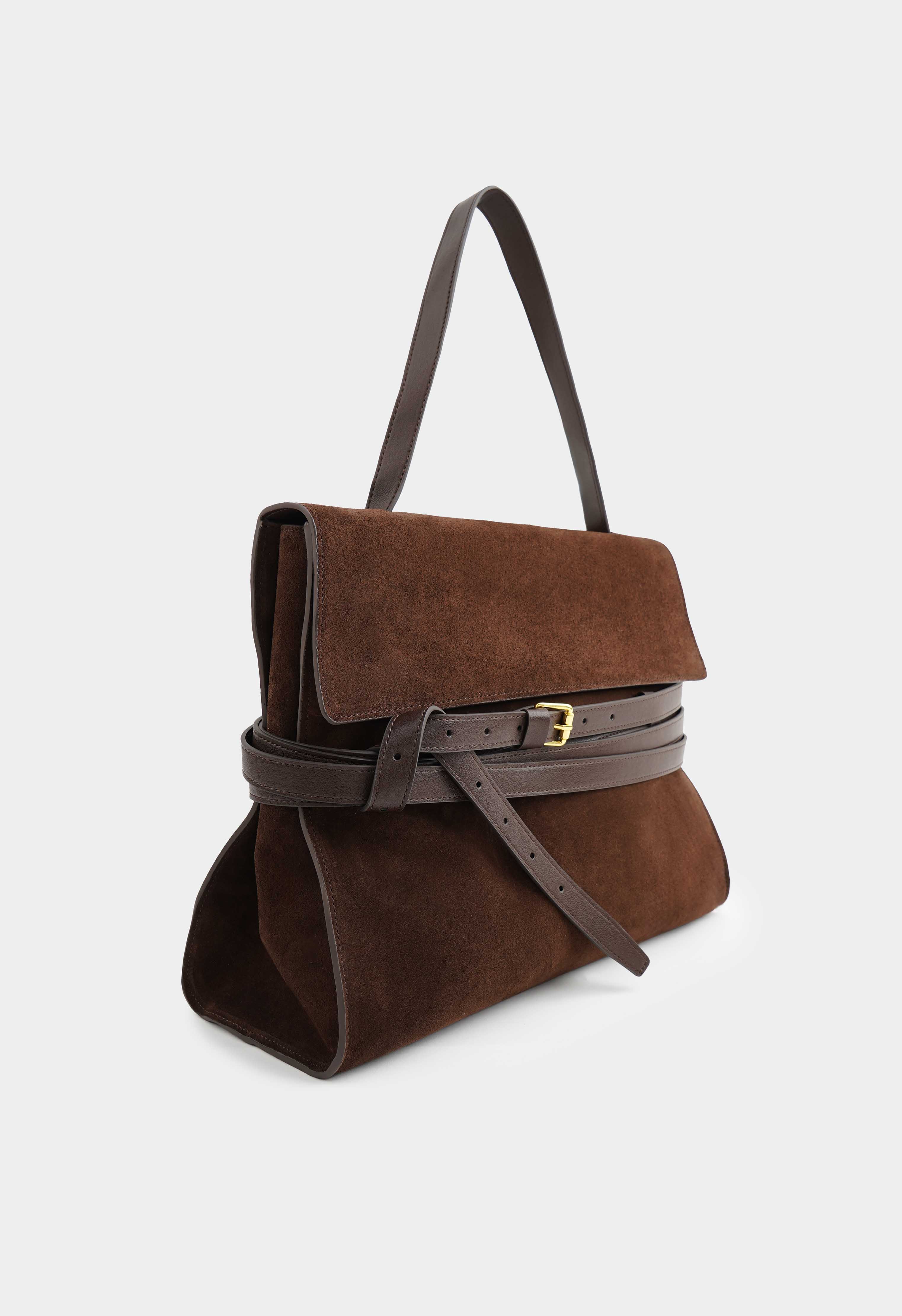 Большая коричневая сумка из натуральной замши – эффектный акцент в гардеробе и идеальный формат на каждый день: благородная фактура, стильный силуэт и один удобный плечевой ремень обеспечивают комфорт в носке, а золотая фурнитура добавляет образу дорогой блеск. Застежка на кнопке надежно закрывает сумку, внутри – два кармана для телефона, ключей и мелочей, чтобы все было аккуратно организовано и всегда под рукой.