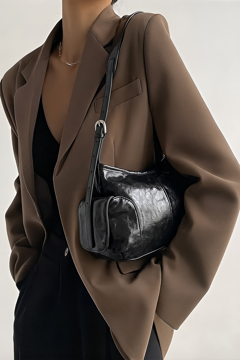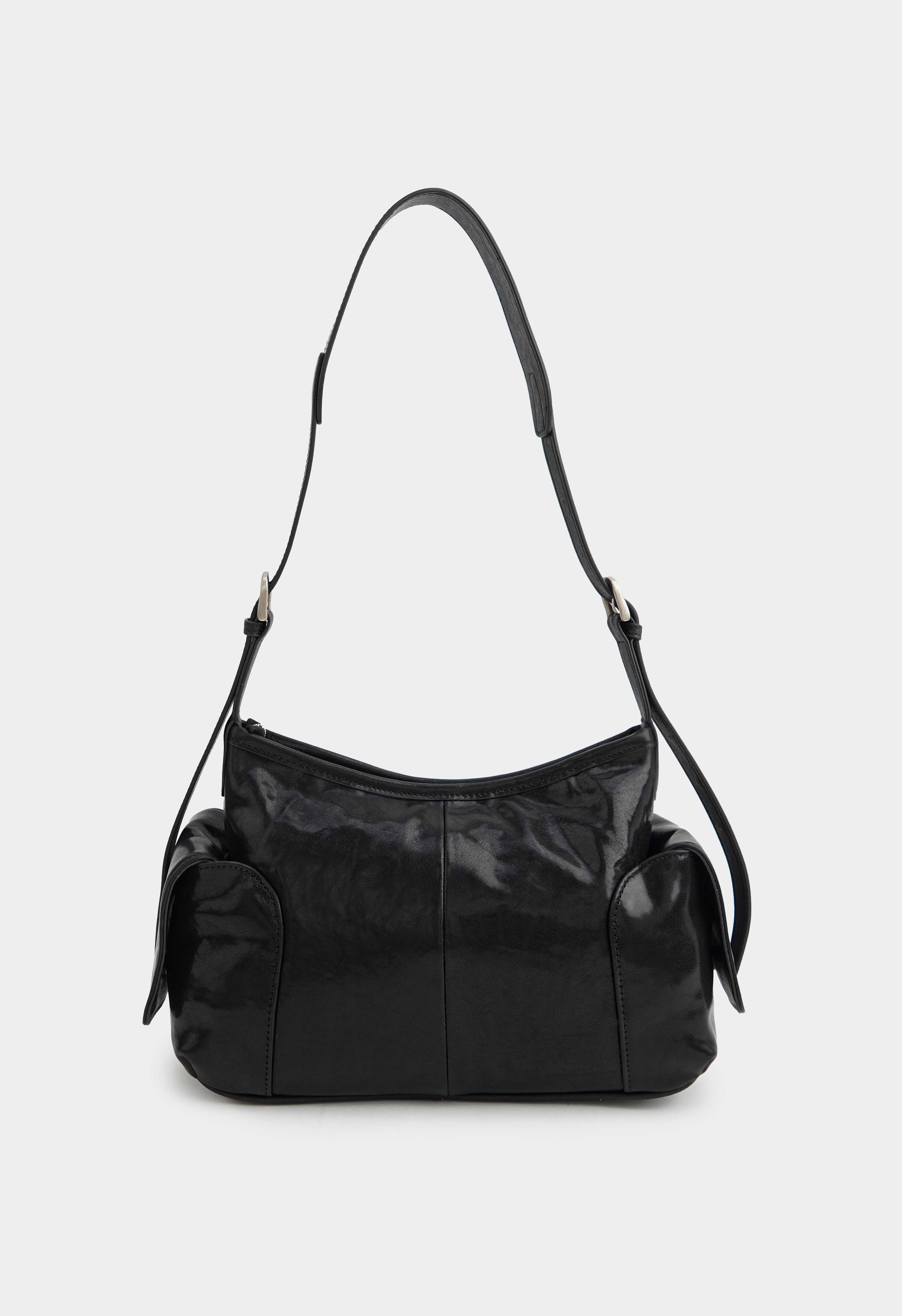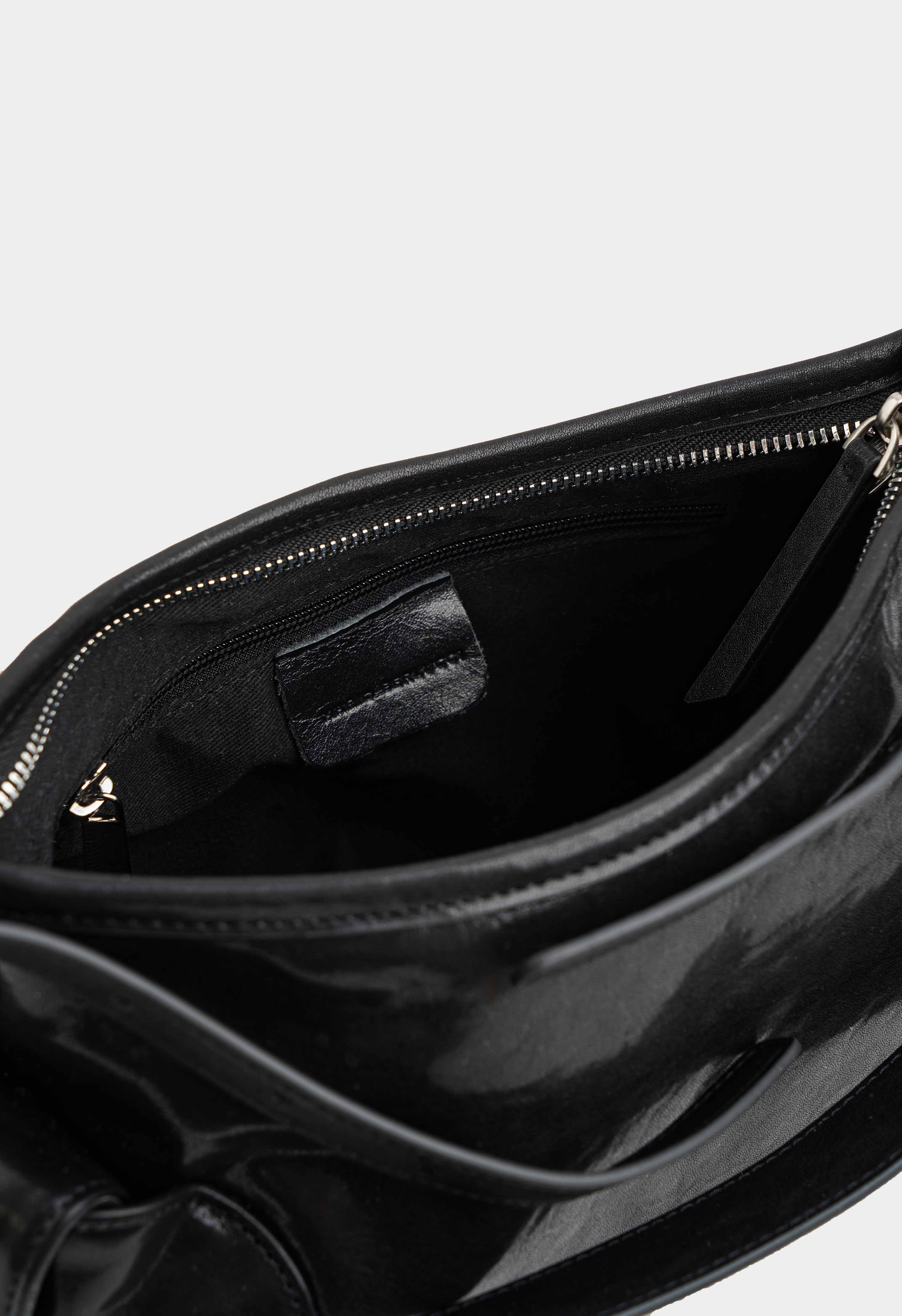 Стильная черная сумка из натуральной кожи – практичная и эффектная модель на каждый день: регулируемая ручка позволяет настроить идеальную посадку, аккуратная молния надежно закрывает содержимое, а серебряная фурнитура добавляет современный холодный блеск. Внутри предусмотрены два удобных кармана для мелочей, в то время как два внешних кармана помогают держать под рукой все самое нужное – красиво, функционально и максимально комфортно.