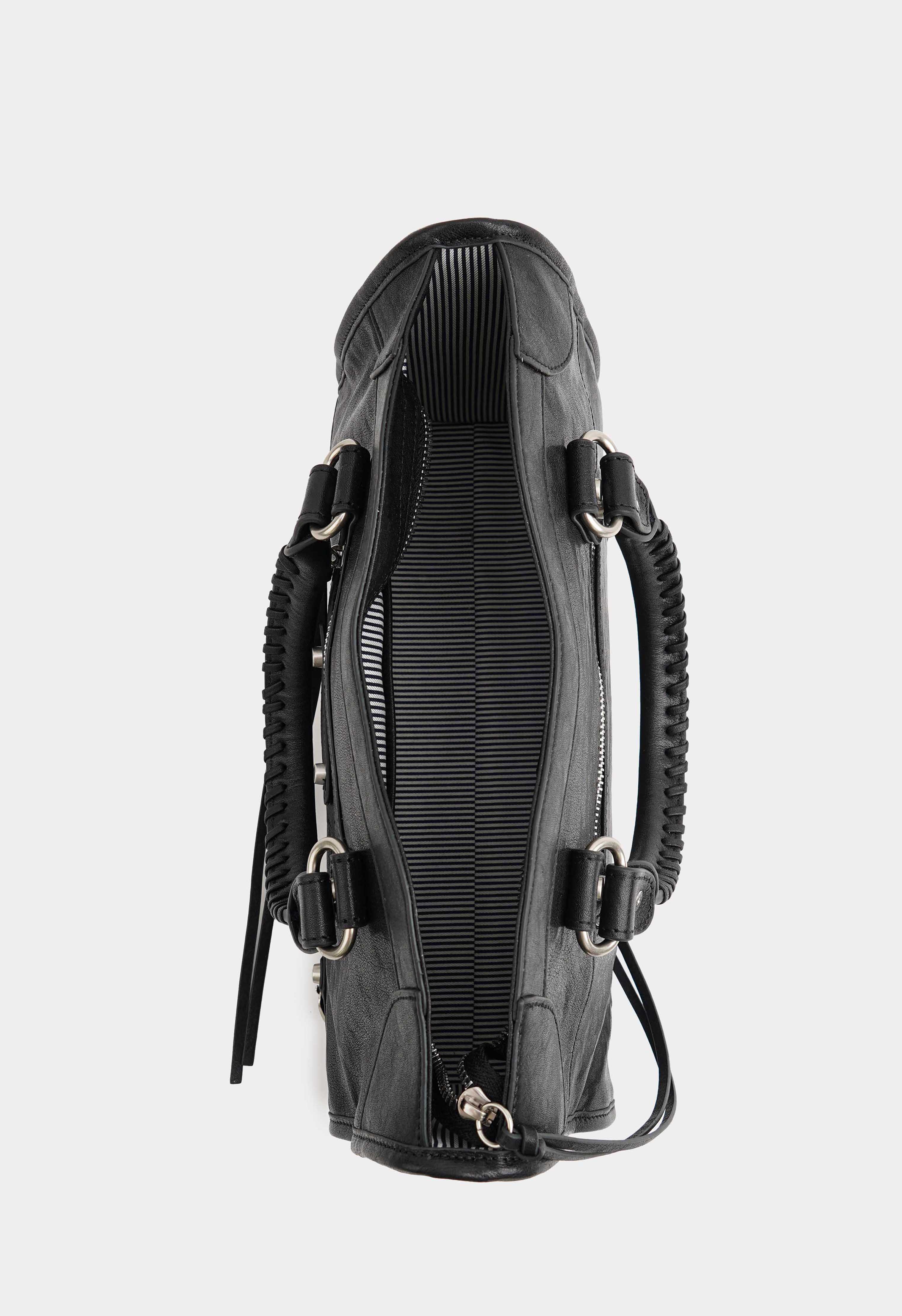 Актуальная черная сумка из натуральной кожи – эффектная городская модель с характером: плечевой ремень обеспечивает комфорт в носке, а обвес из кожаной тесьмы с зеркальцем добавляет практичную и модную деталь. Надежная молния закрывает содержимое, серебряная фурнитура подчеркивает дерзкий современный стиль, внутри предусмотрены два удобных кармана для мелочей, в то время как два внешних кармана помогают держать все самое нужное всегда под рукой.