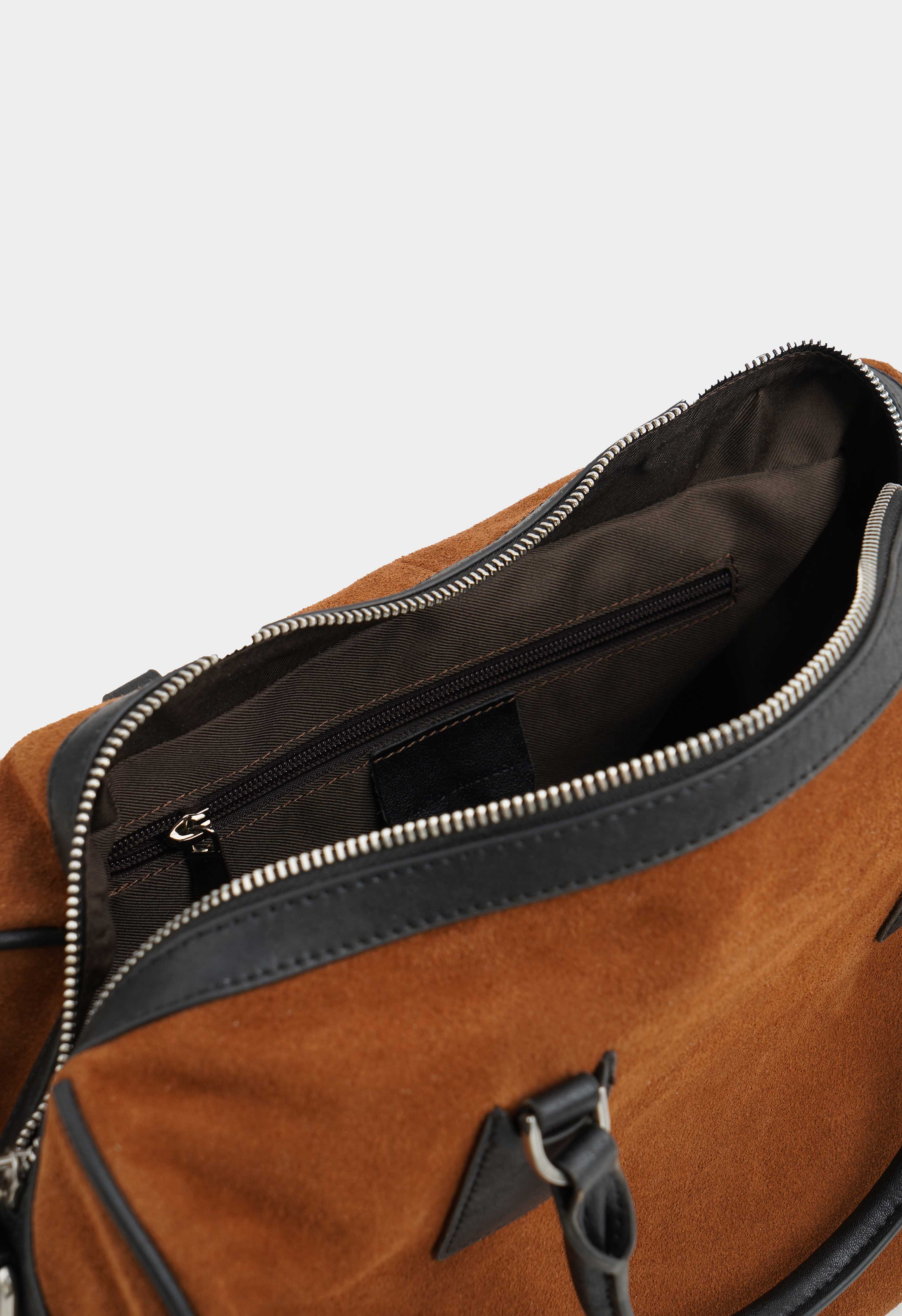 Стильная сумка из рыжей натуральной замши с вставками из черной кожи – эффектное сочетание теплого оттенка и строгих деталей, которое выглядит дорого и современно. Надежная молния аккуратно закрывает содержимое, серебряная фурнитура добавляет холодный блеск, а внутри предусмотрены два удобных кармана, чтобы мелочи всегда были разложены по местам и легко находились.