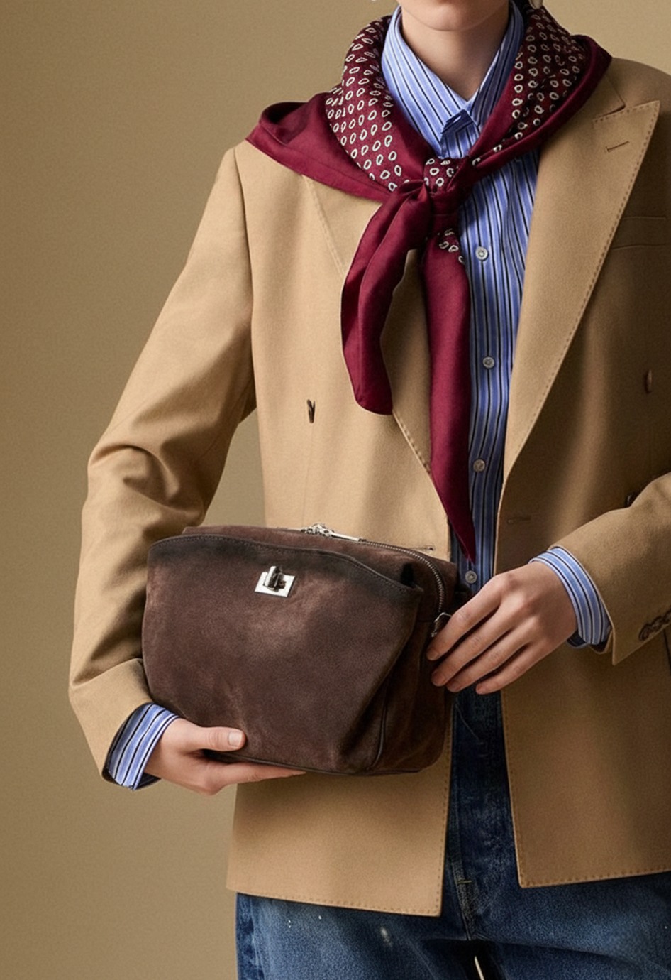 Базовая коричневая сумка из натуральной замши – благородный акцент для повседневных образов: плечевой ремень обеспечивает комфорт, а съемная ручка позволяет легко менять формат носки. Серебряная фурнитура смотрится современно и подчеркивает фактуру замши, молния надежно закрывает содержимое, внутри предусмотрен один карман для мелочей, а три внешних кармана делают сумку максимально практичной – все нужное всегда под рукой и аккуратно организовано.