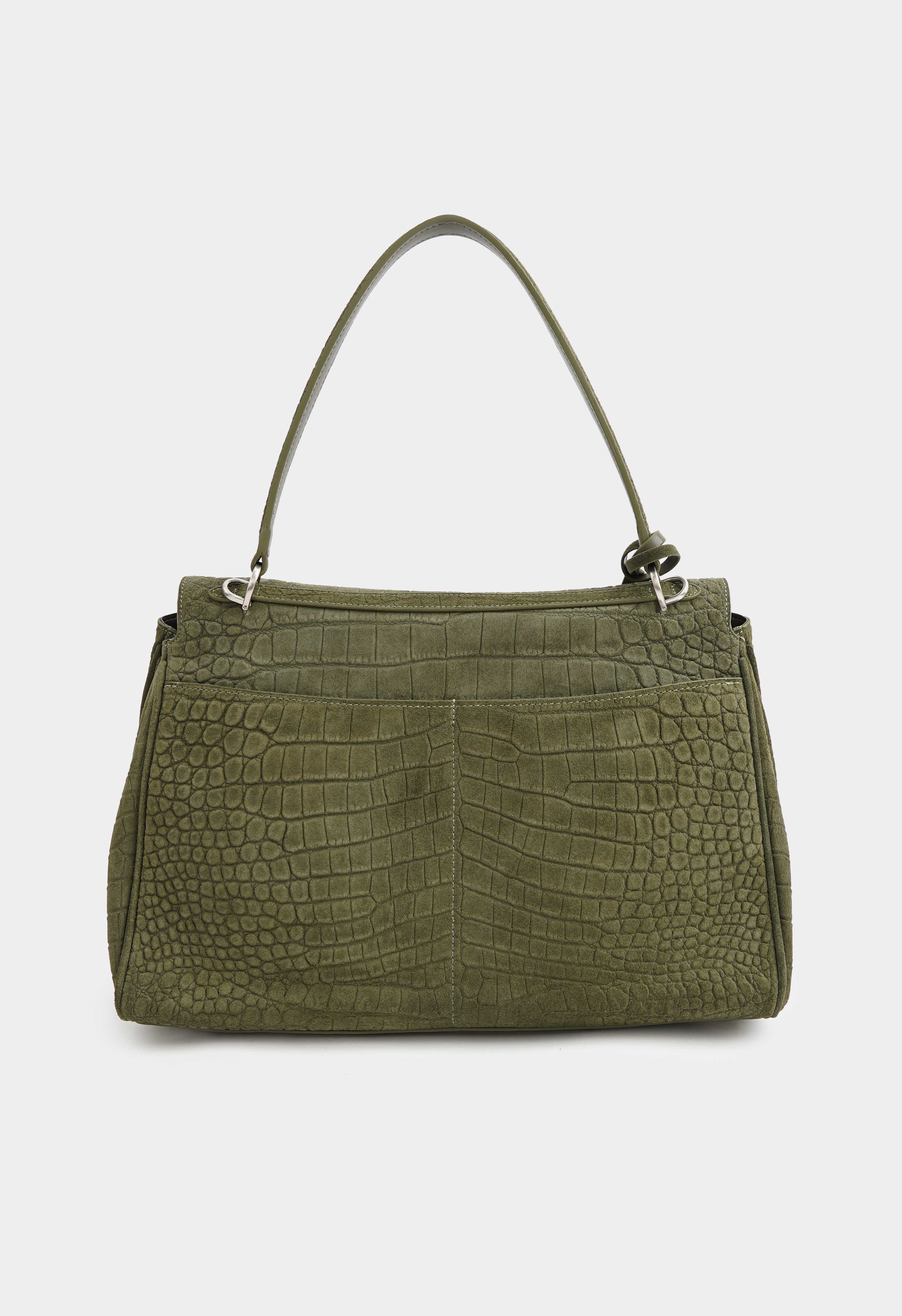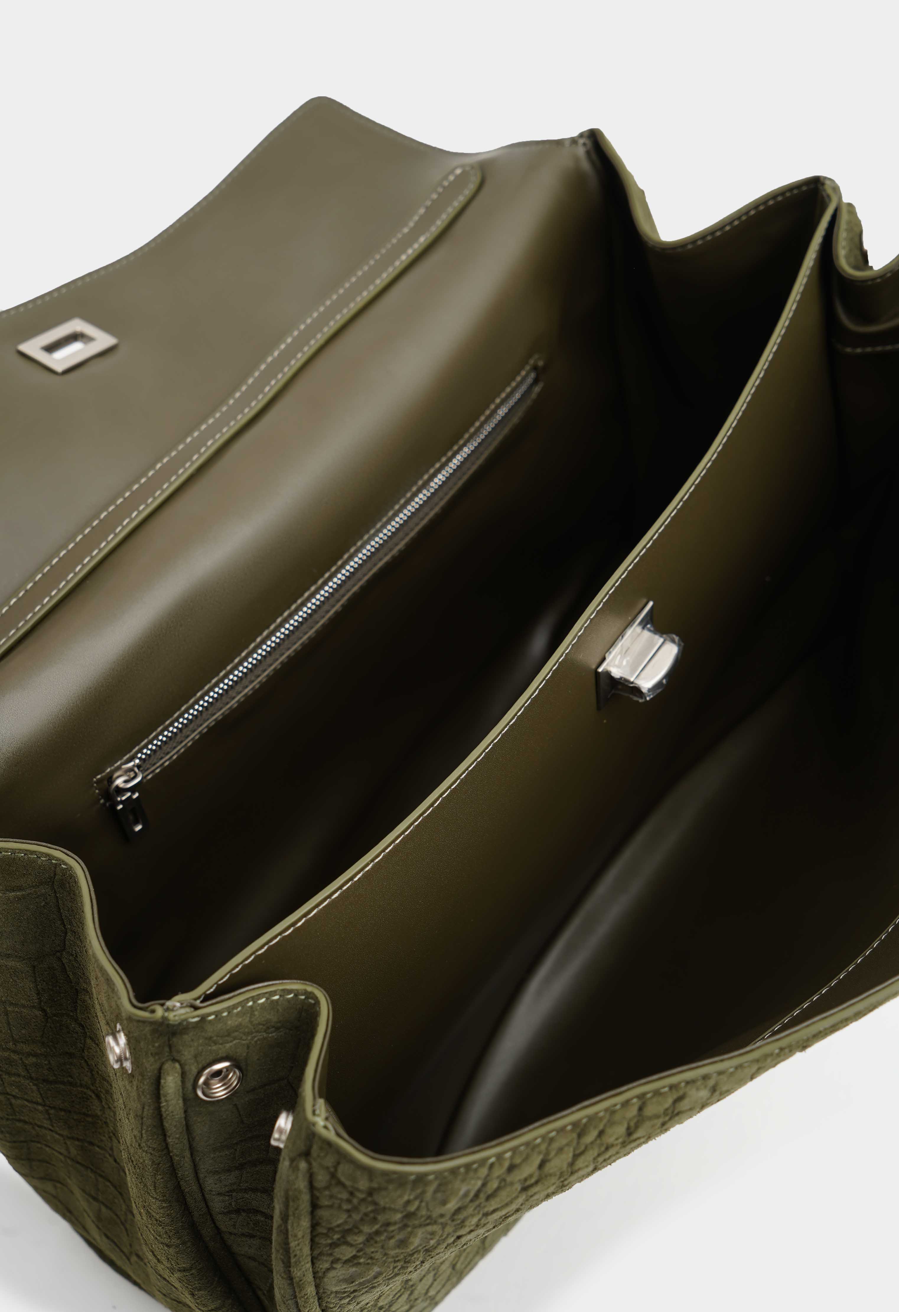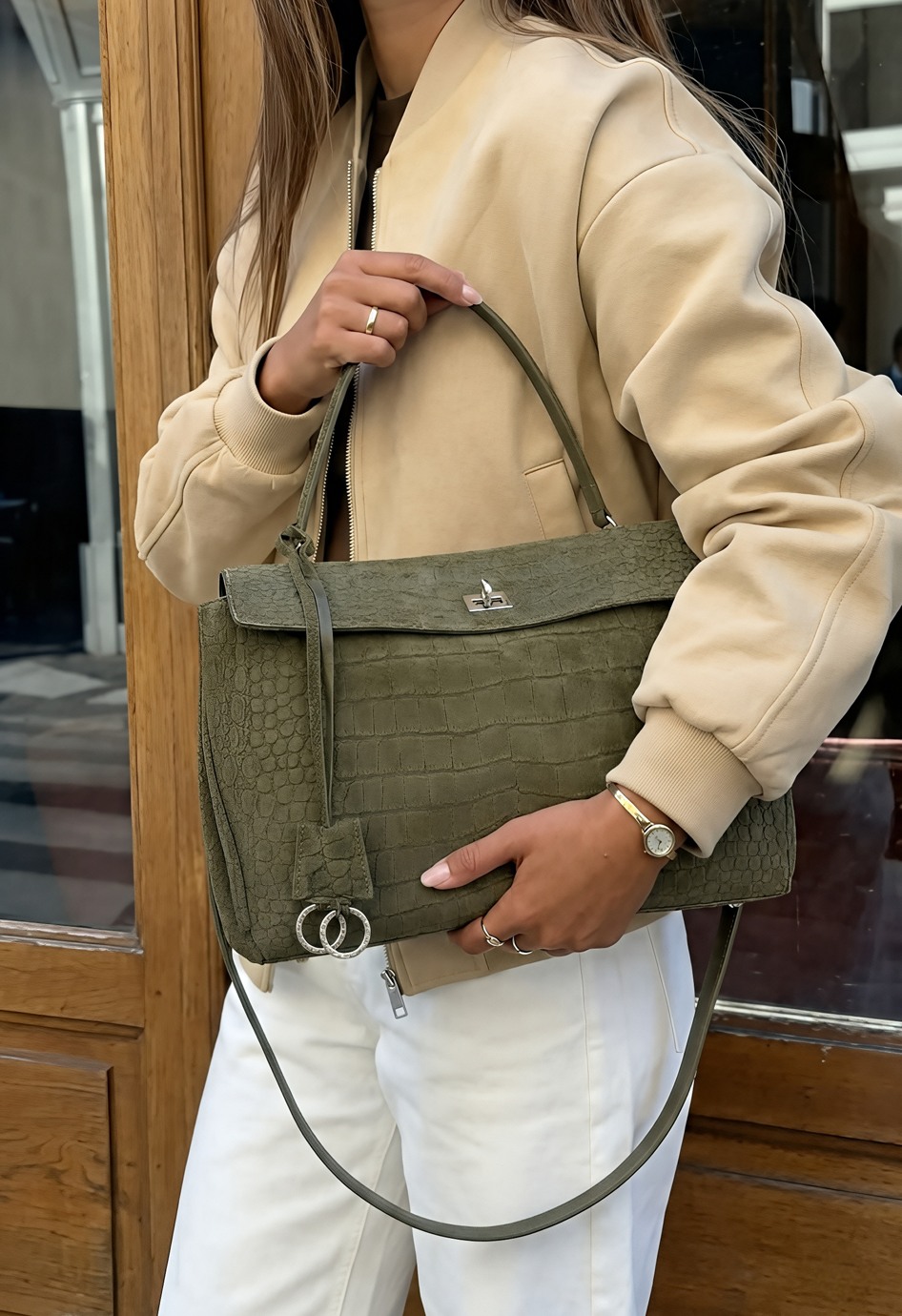 Зеленая сумка из натуральной замши – стильный акцент, который освежает любой образ и выглядит по-настоящему благородно: плечевой ремень удобно садится на плечо, а обвес из кожаной тесьмы добавляет характер и модную деталь. Серебряная фурнитура и аккуратная пряжка подчеркивают современный стиль модели, внутри предусмотрен один карман для мелочей, а два внешних кармана помогают держать под рукой всё самое нужное.