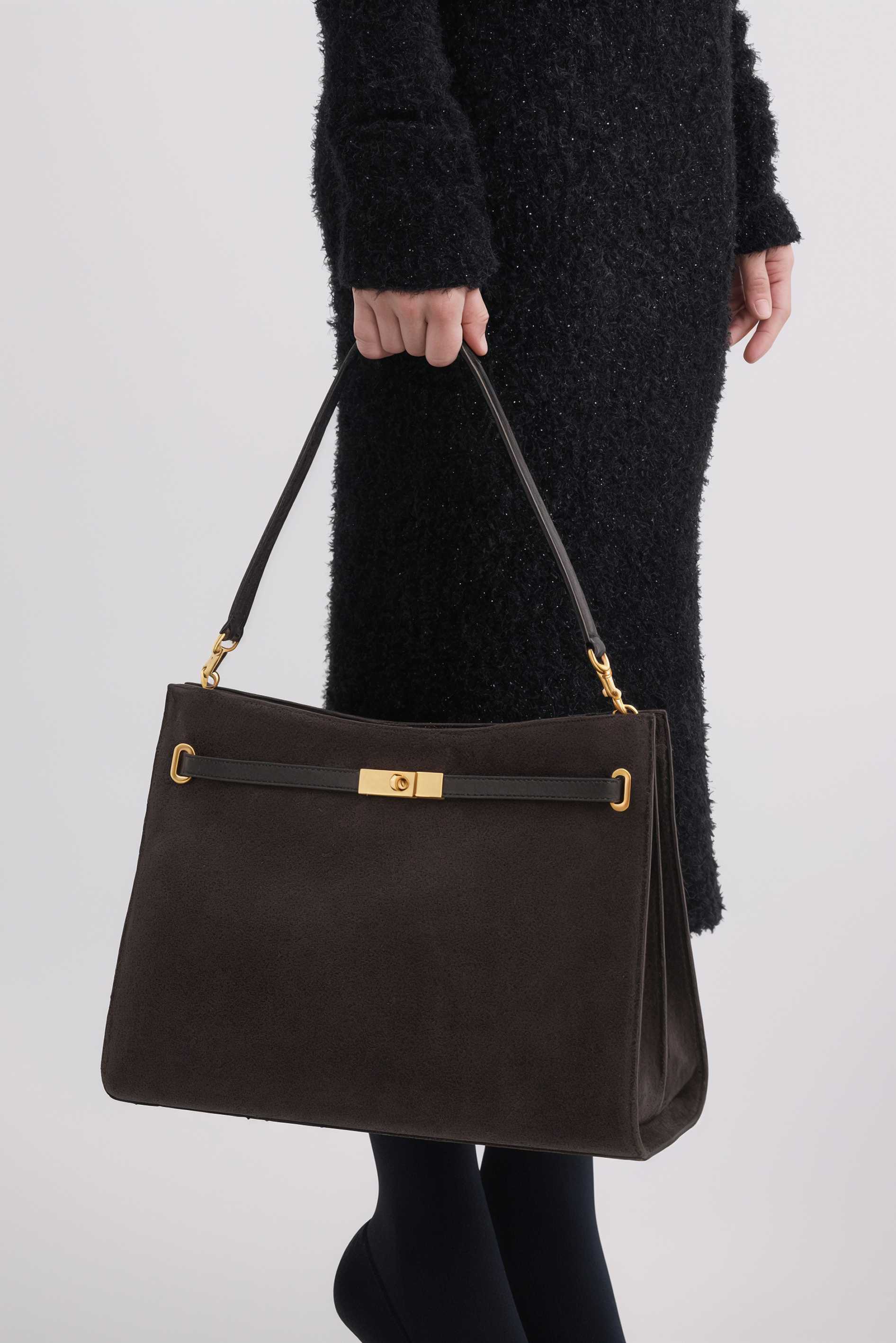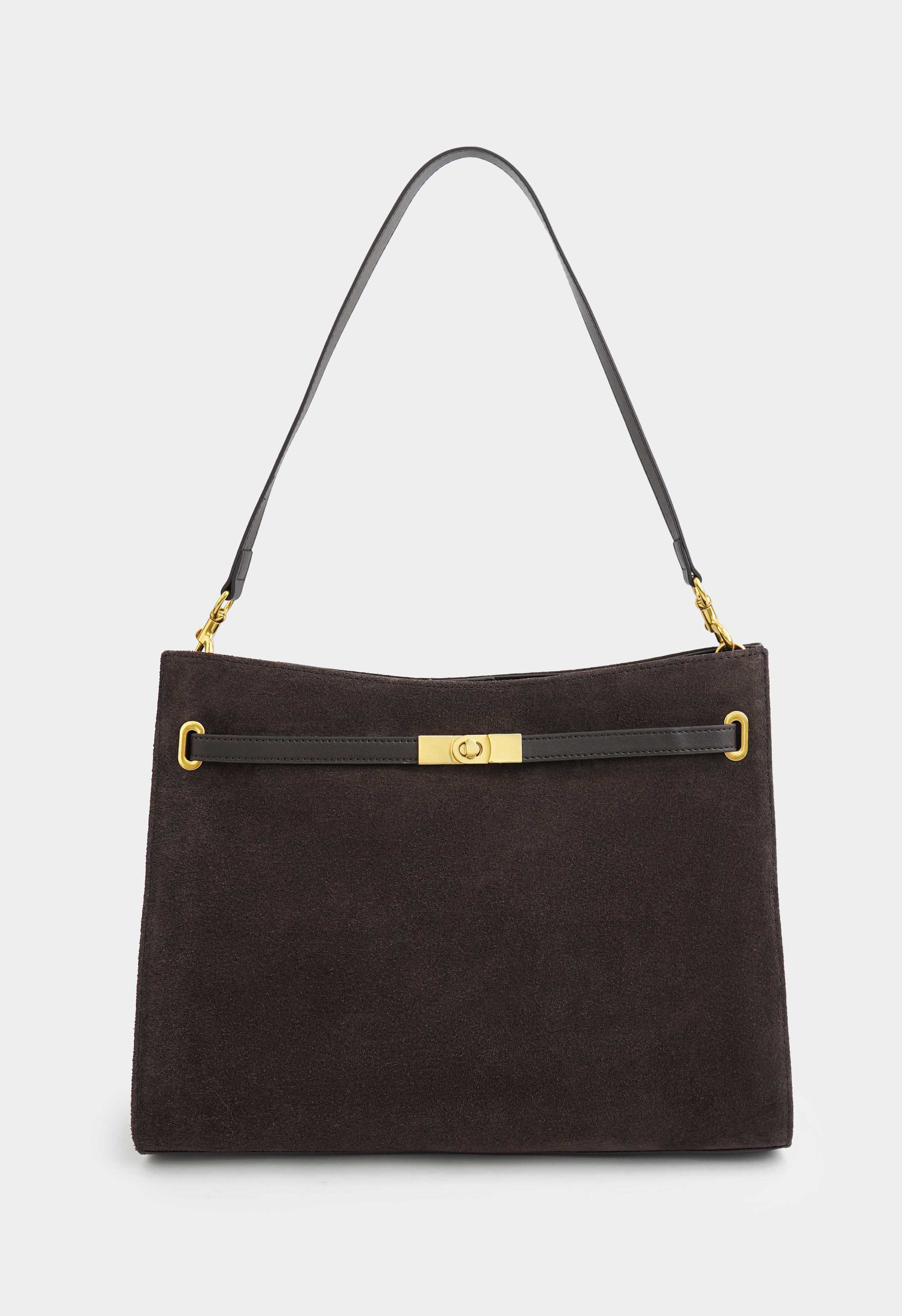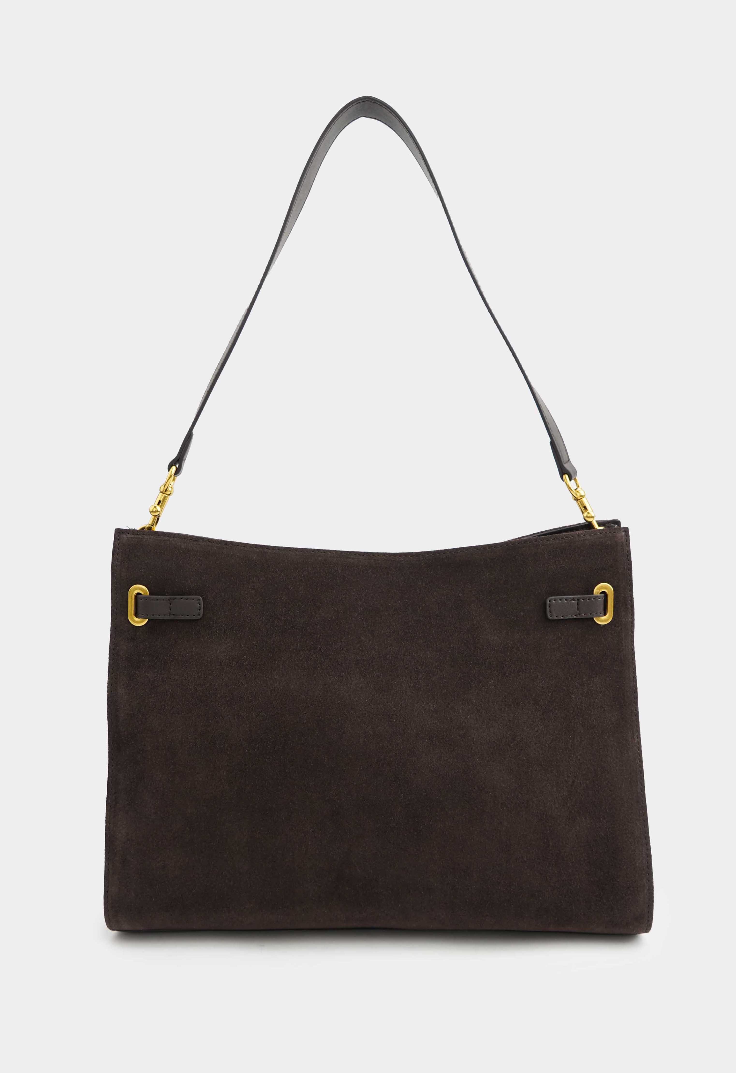 Коричневая сумка из натуральной замши – та самая базовая модель, которая выглядит дорого и будет служить каждый день: плечевой ремень удобно сидит на плече, а съемная ручка позволяет быстро сменить стиль носки. Золотая фурнитура и изящная пряжка придают образу элегантность, застежка на кнопке и молнии делает сумку максимально надежной. Внутри предусмотрены два отделения и два кармана, чтобы легко держать все в идеальном порядке.