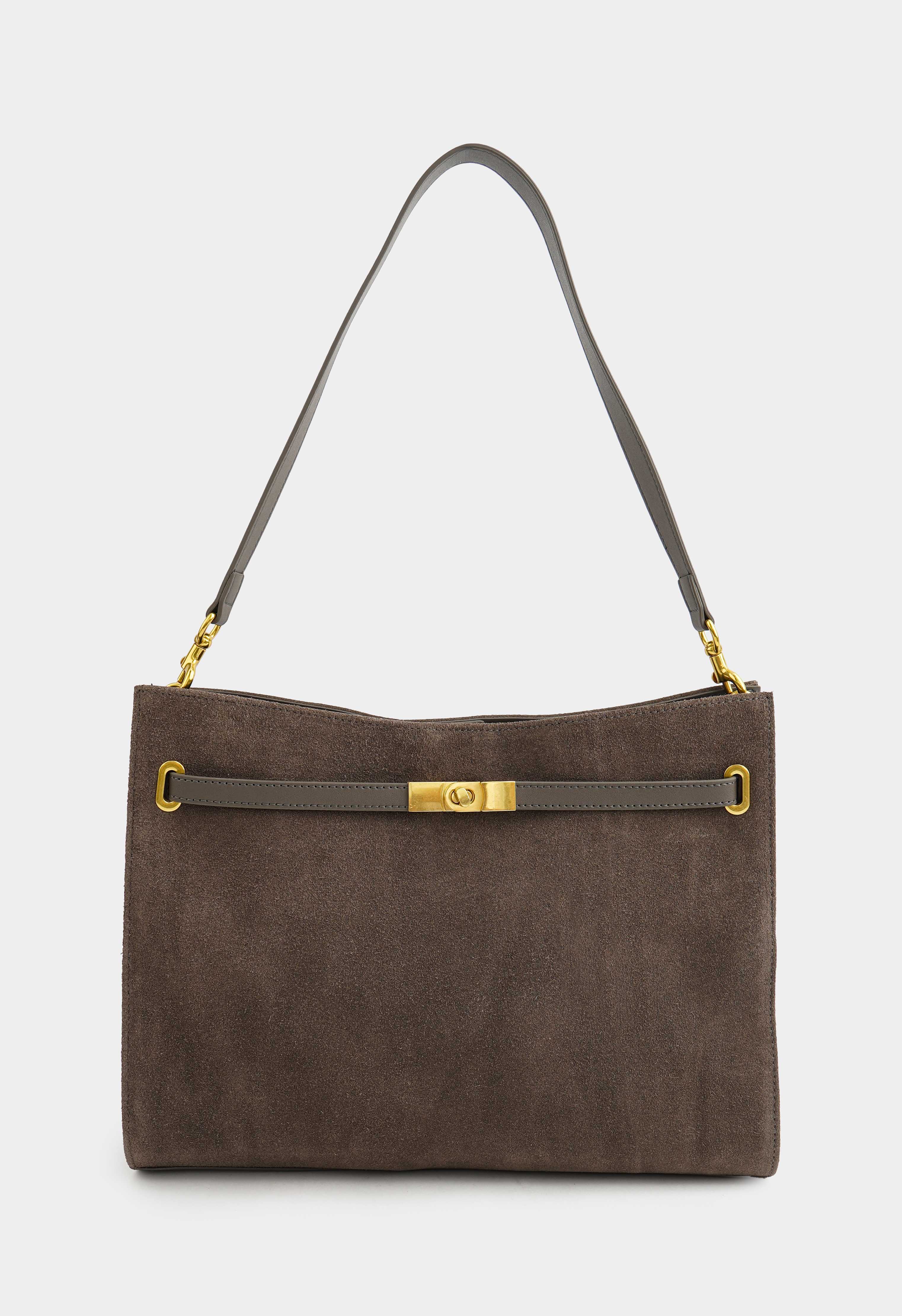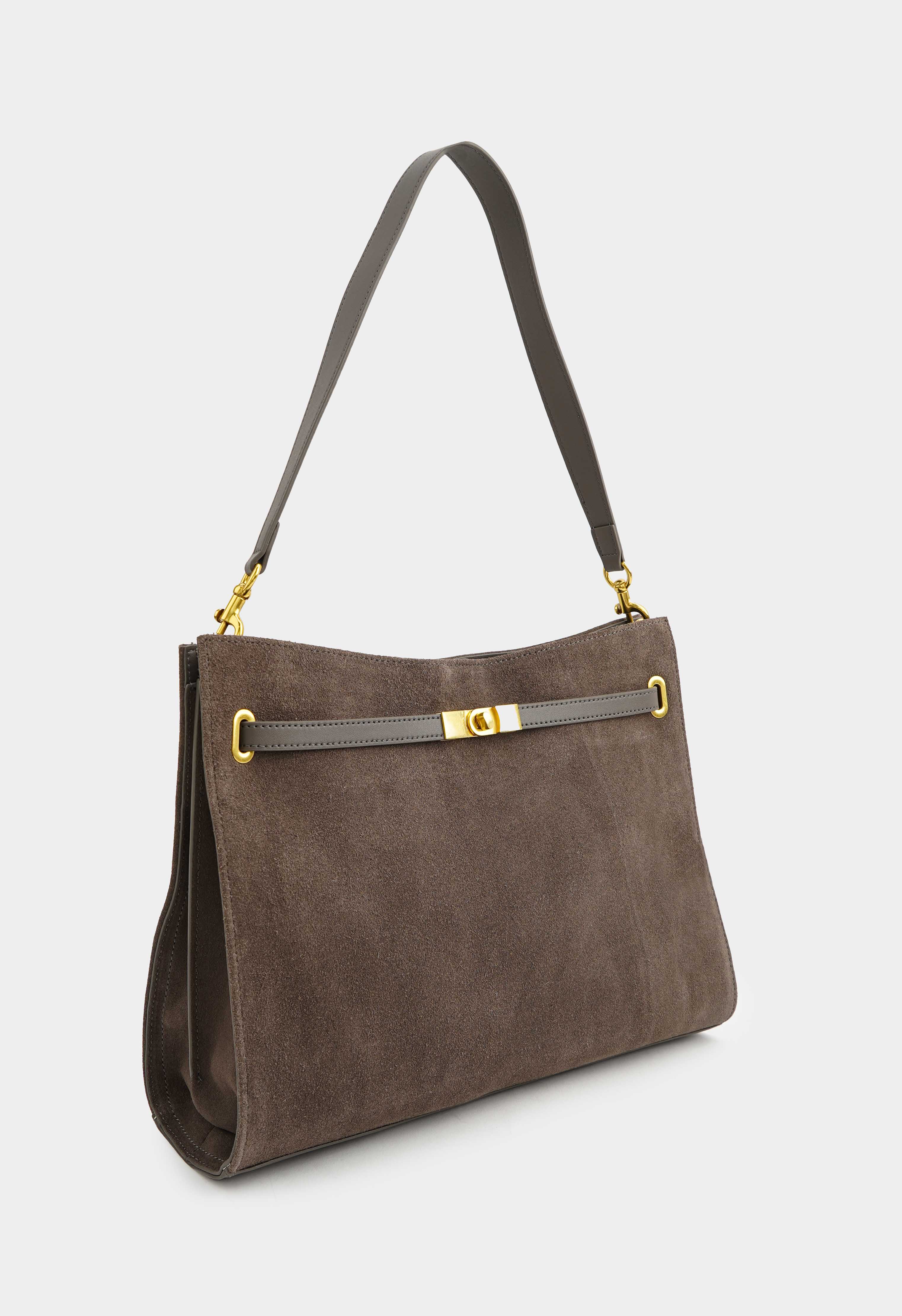 Серая сумка из натуральной замши – та самая базовая модель, которая выглядит дорого и будет служить каждый день: плечевой ремень удобно сидит на плече, а съемная ручка позволяет быстро сменить стиль носки. Золотая фурнитура и изящная пряжка придают образу элегантность, застежка на кнопке и молнии делает сумку максимально надежной. Внутри предусмотрены два отделения и два кармана, чтобы легко держать все в идеальном порядке.
