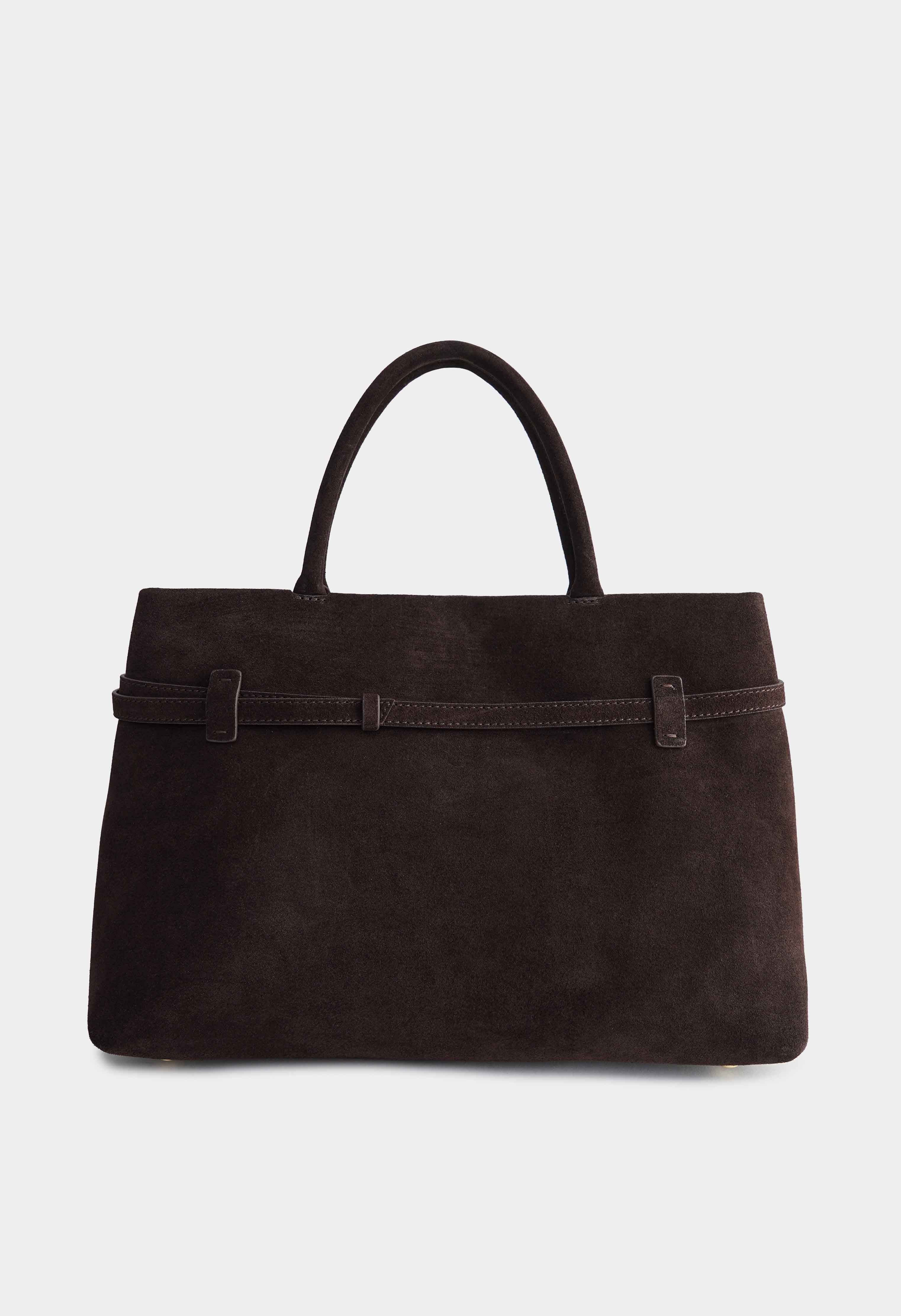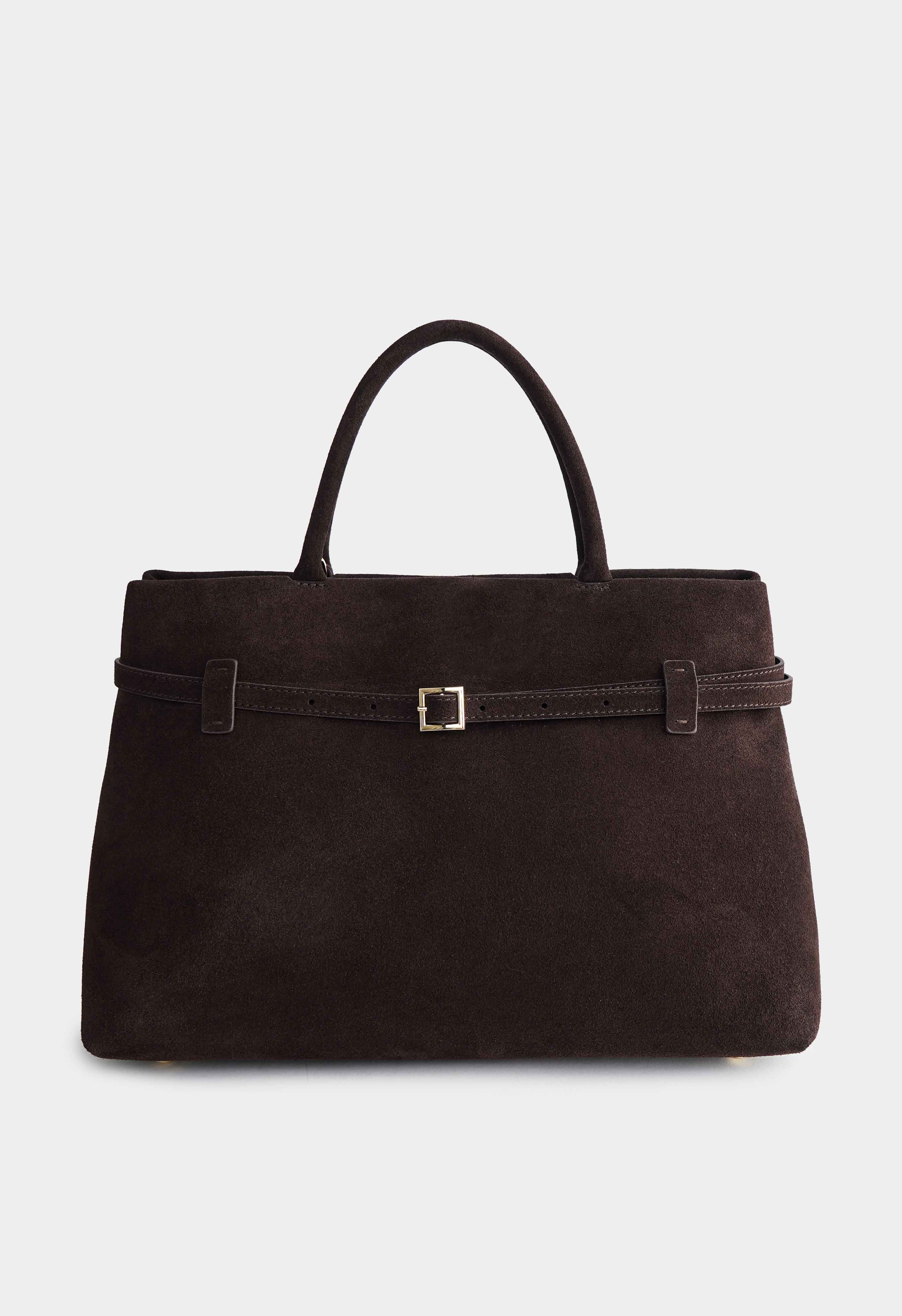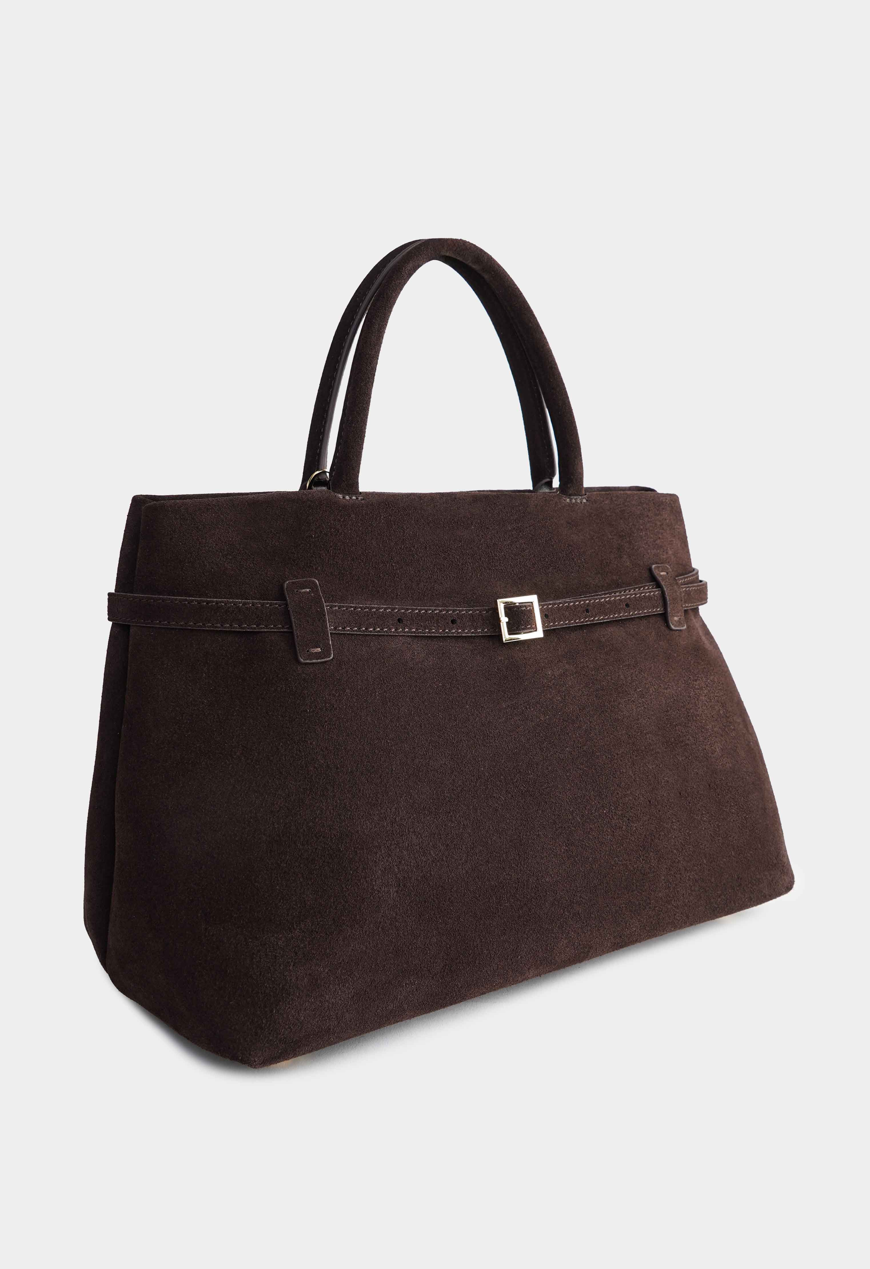 Аккуратная сумка из натуральной замши коричневого цвета – элегантная и практичная модель на каждый день: мягкая бархатистая фактура подчёркивает премиальный стиль, декоративный ремешок с пряжкой на передней части добавляет акцент, застёжка на кнопку обеспечивает удобство, золотая фурнитура придаёт изысканный блеск, в комплекте есть плечевой ремень для носки на плече или через плечо, а внутри предусмотрен 1 карман для мелочей, чтобы всё необходимое было под рукой.