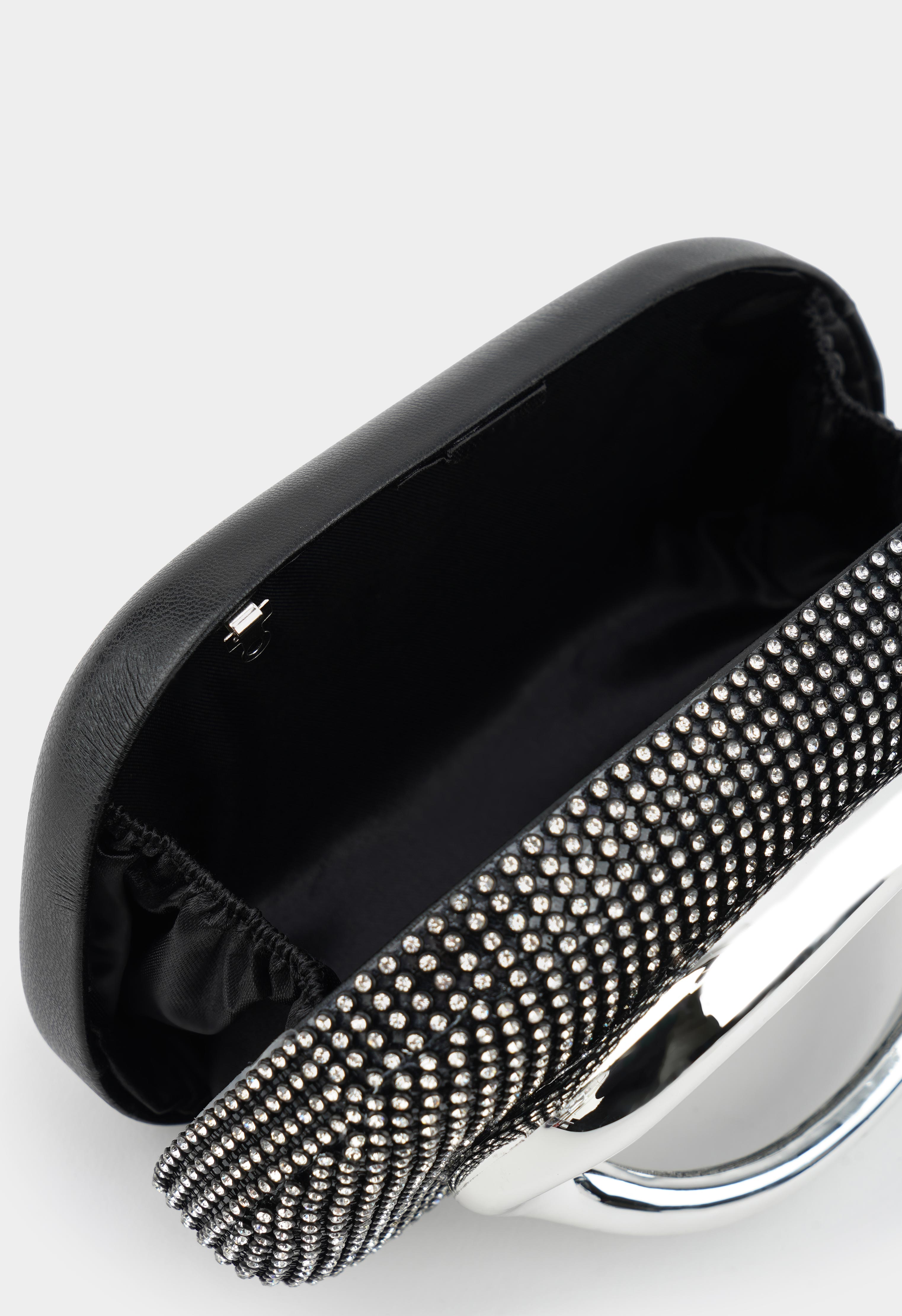 Сияющий черный клатч с серебристыми стразами и эффектной зеркальной ручкой-скобой – тот самый акцент, который мгновенно делает образ праздничным: переливы красиво ловят свет, гладкая серебряная фурнитура добавляет современный вид, а удобная форма комфортно лежит в руке и притягивает взгляды. Внутри аккуратная подкладка и достаточно места для самых нужных мелочей, при этом клатч держит форму и позволяет выглядеть безупречно весь вечер. В комплекте идет удобная съемная цепочка, чтобы можно было носить клатч разными способами.
