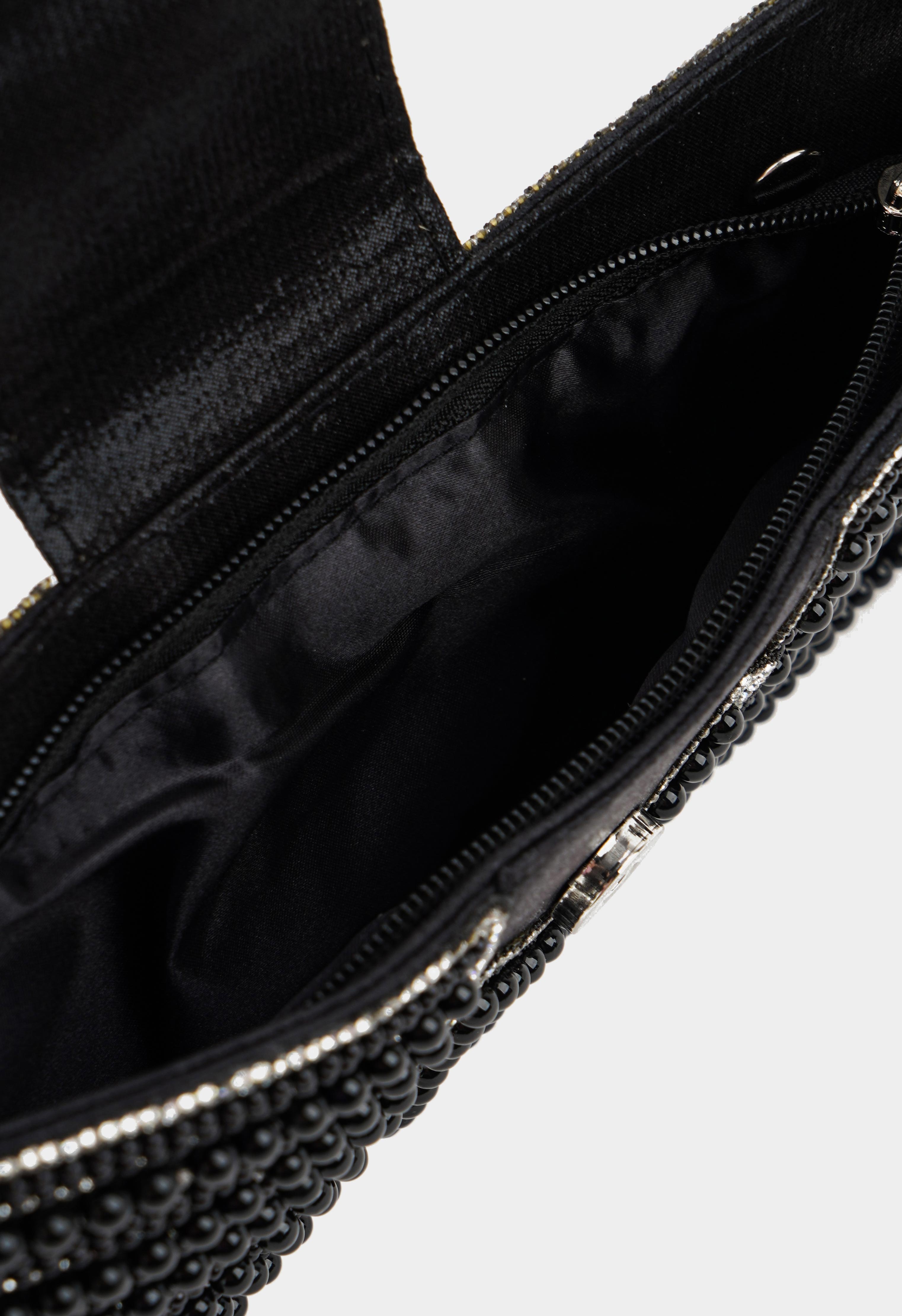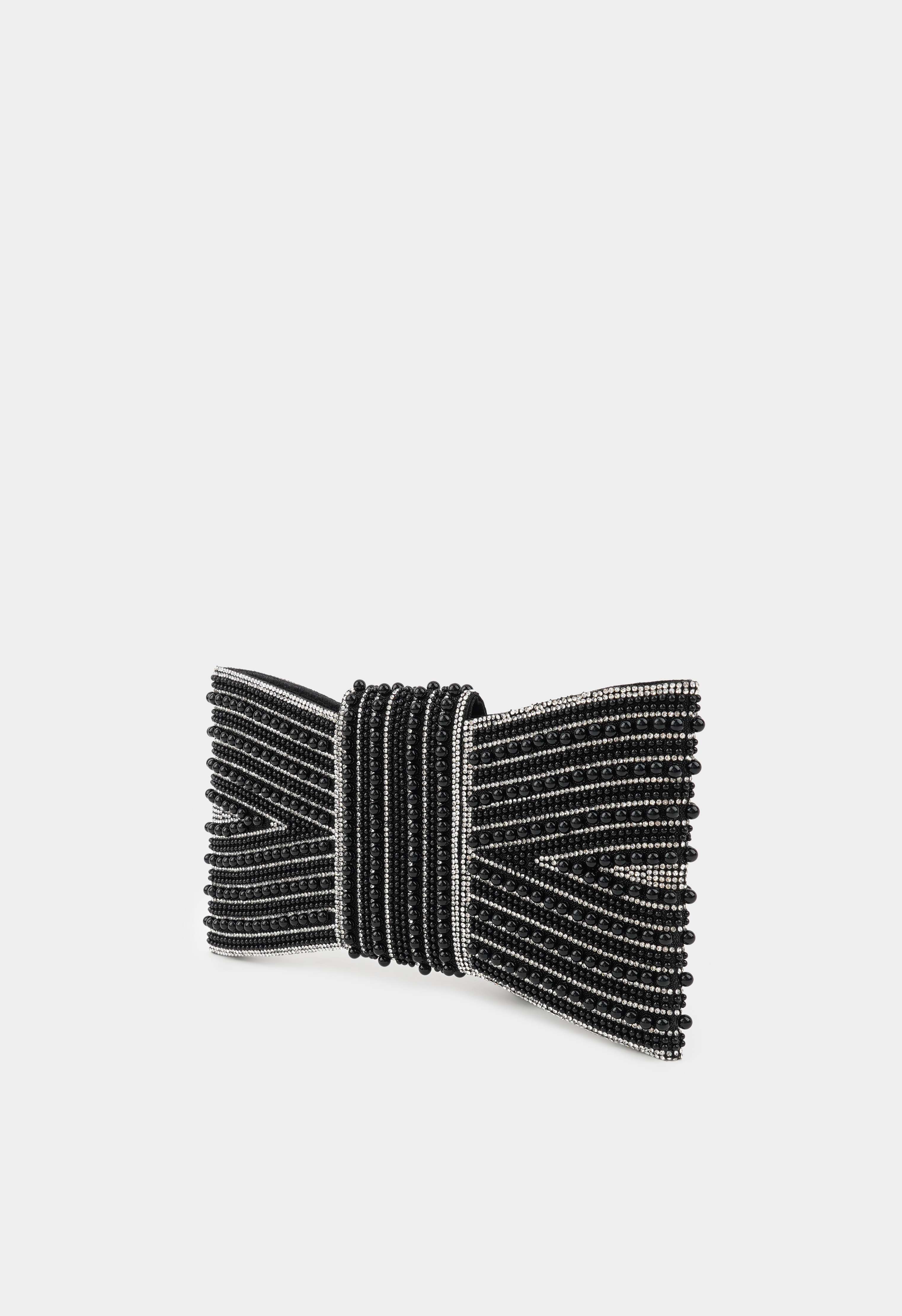 Черный клатч в форме эффектного банта – ваш готовый акцент для вечера: текстильная основа украшена декоративными темными бусинами и сияющими стразами, которые красиво переливаются при каждом движении и мгновенно притягивают взгляды. Удобная застежка на кнопке надежно фиксирует содержимое, а цепочка в комплекте позволяет носить клатч через плечо, оставляя руки свободными.