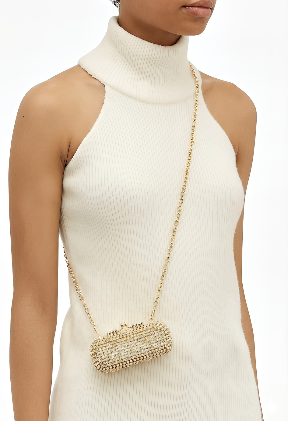 Роскошный золотой клатч, полностью усыпанный сияющими стразами, создан для тех случаев, когда хочется блистать: он эффектно переливается при любом свете и моментально превращает даже самый базовый образ в вечерний. Жесткая форма держит идеальный вид, а защелкивающаяся застежка сохраняет содержимое в безопасности. В комплекте есть золотая цепочка, чтобы вы могли носить клатч на плече или в руках, оставаясь свободной и уверенной весь вечер.