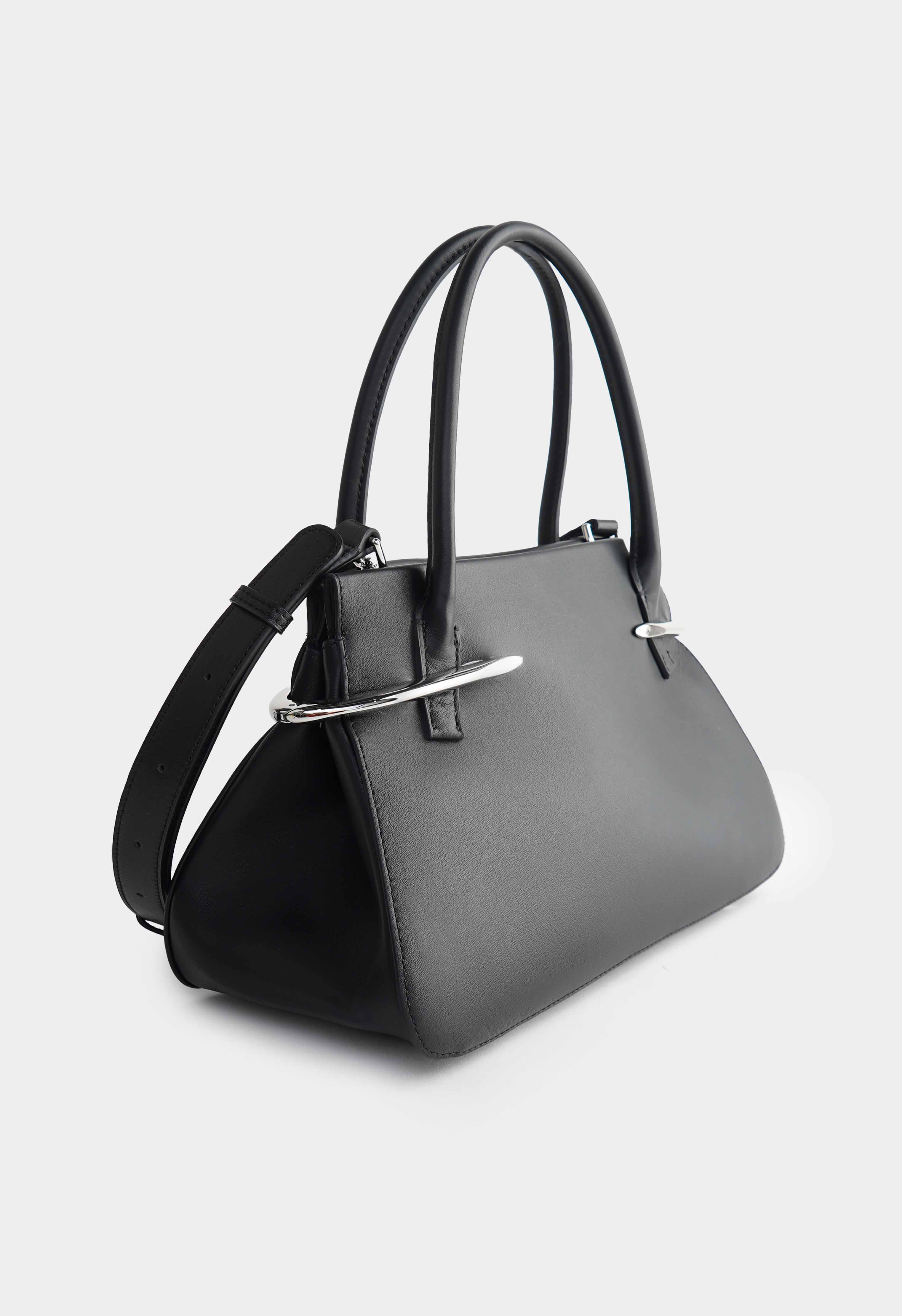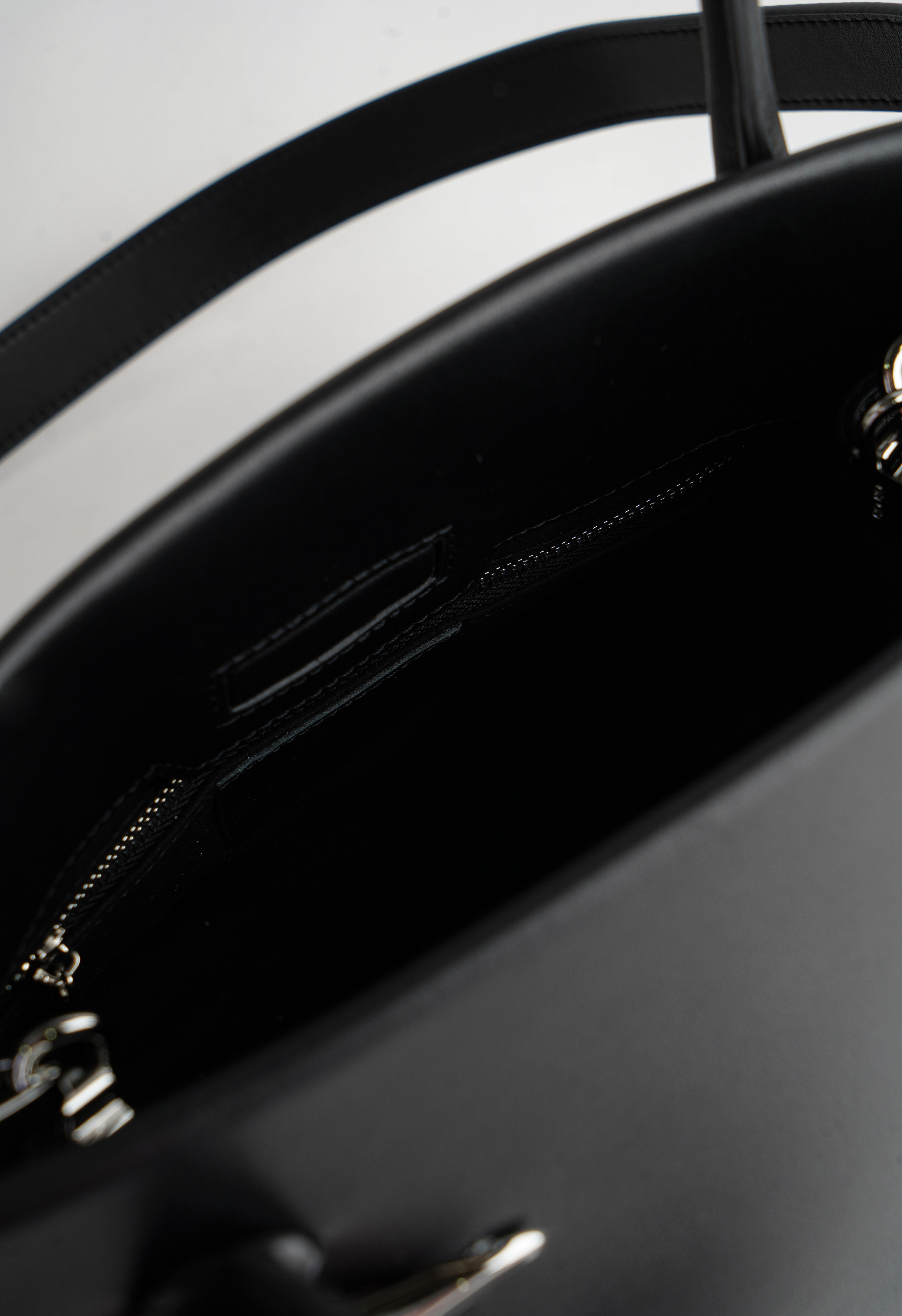 Черная сумка из натуральной кожи выглядит свежо, элегантно и очень аккуратно благодаря мягко округленной форме и чистым линиям. Застежка на магните закрывается легко и держит содержимое надежно, а серебряная фурнитура добавляет сдержанный современный акцент. Внутри предусмотрены два кармана для удобной организации, в комплекте есть плечевой ремень, благодаря которому сумку удобно носить в руке за ручки или через плечо.