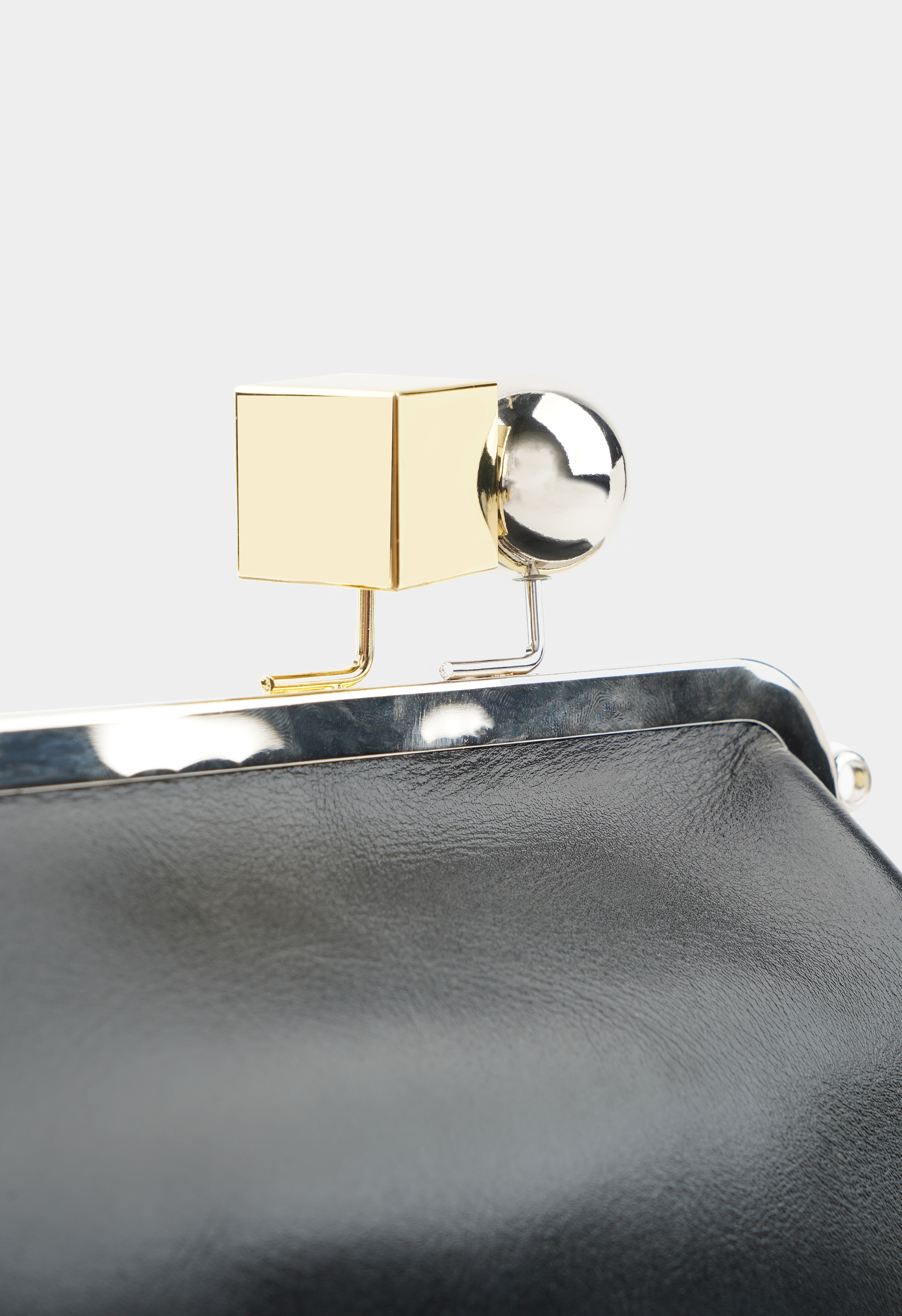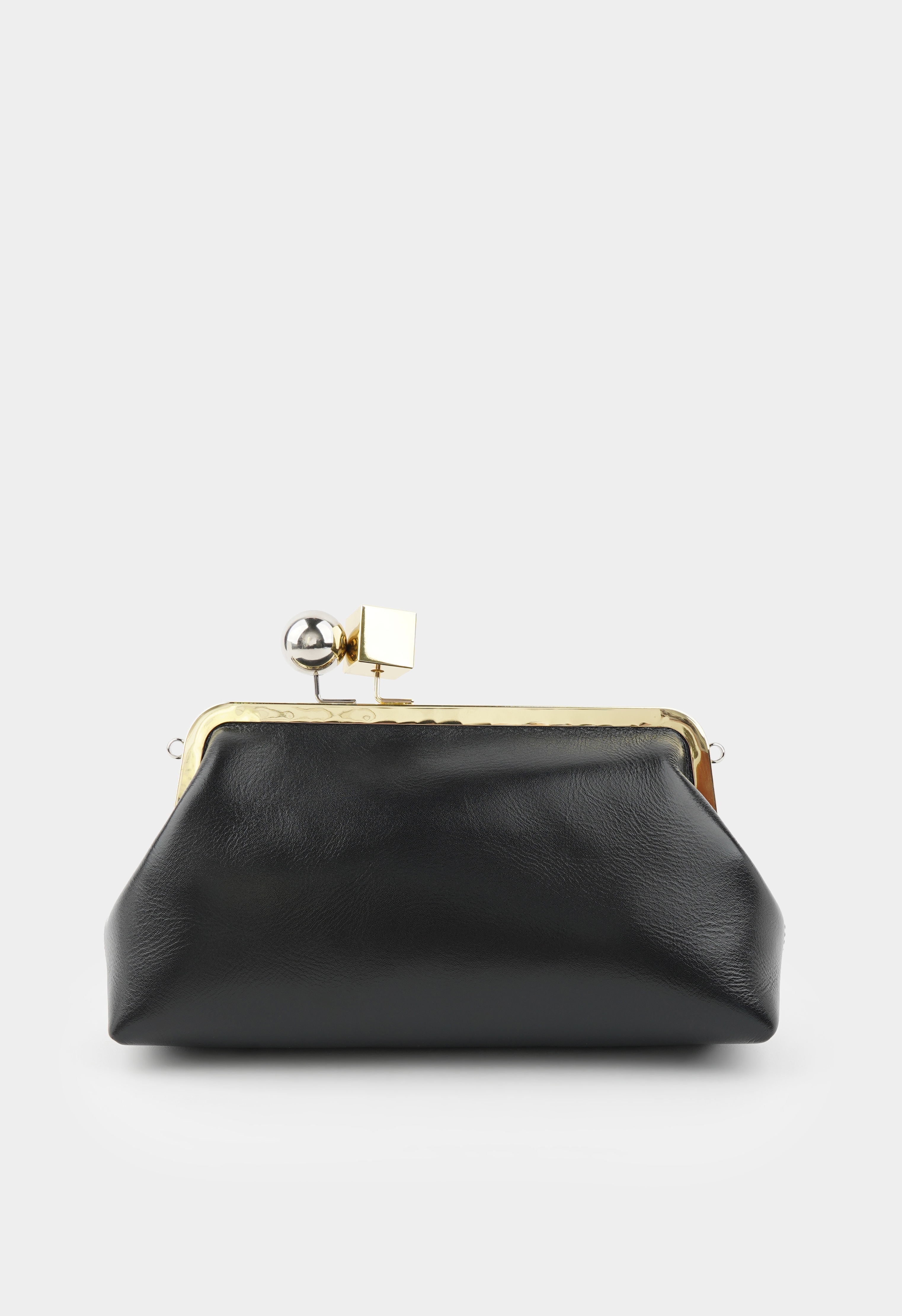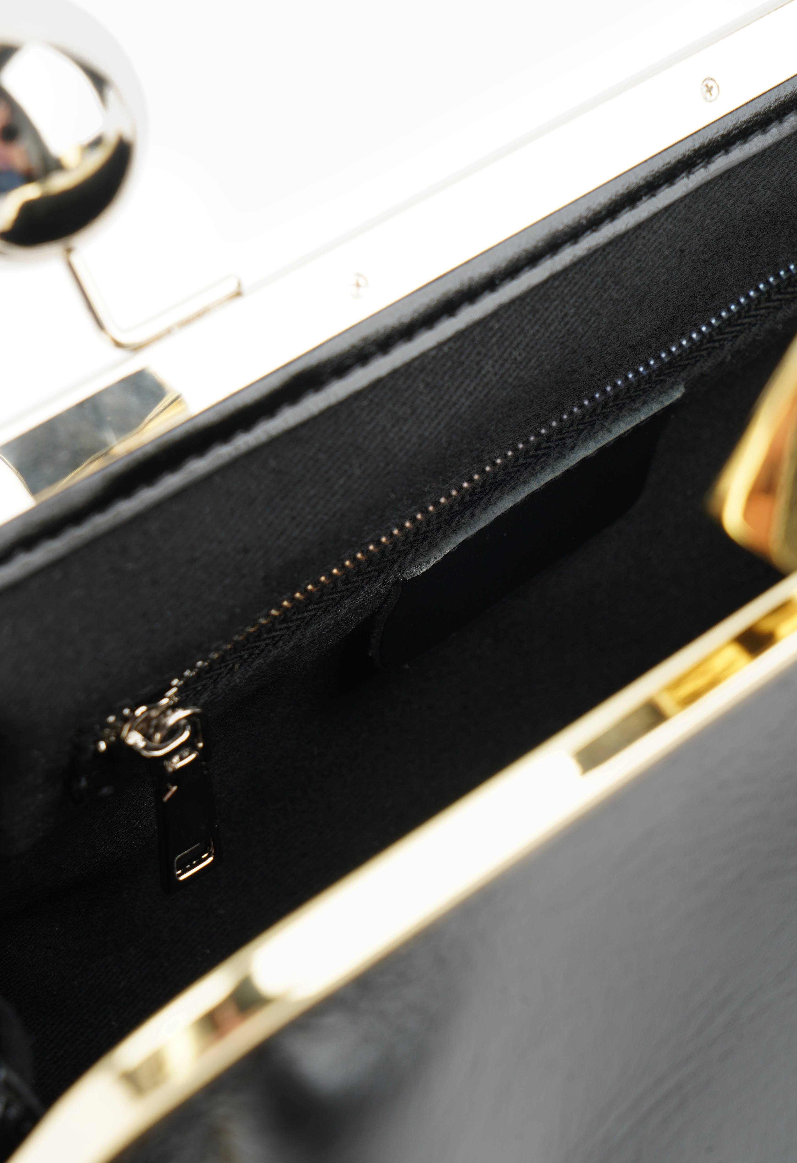 Эта маленькая сумка из натуральной кожи в классическом черном цвете – воплощение элегантности и практичности. Застежка фермуар с сочетанием серебряной и золотой фурнитуры придает модели современный, стильный акцент, а два внутренних кармана помогают держать вещи в порядке. Один плечевой ремень и съемная ручка делают сумку универсальной: можно носить ее через плечо или в руках, выбирая удобный вариант для повседневных дел или особых событий. Компактная, но функциональная модель станет ярким и утонченным дополнением к любому образу.