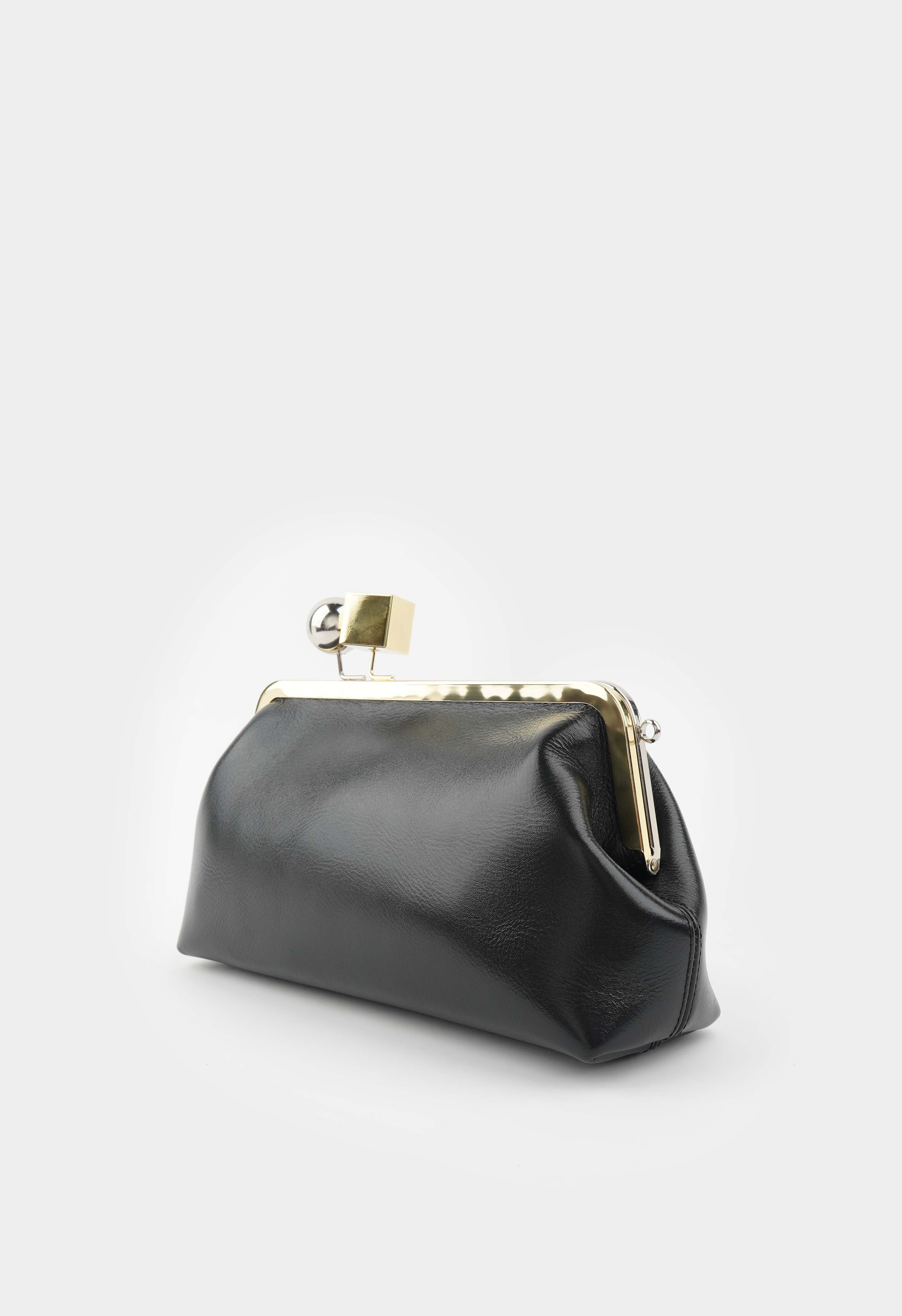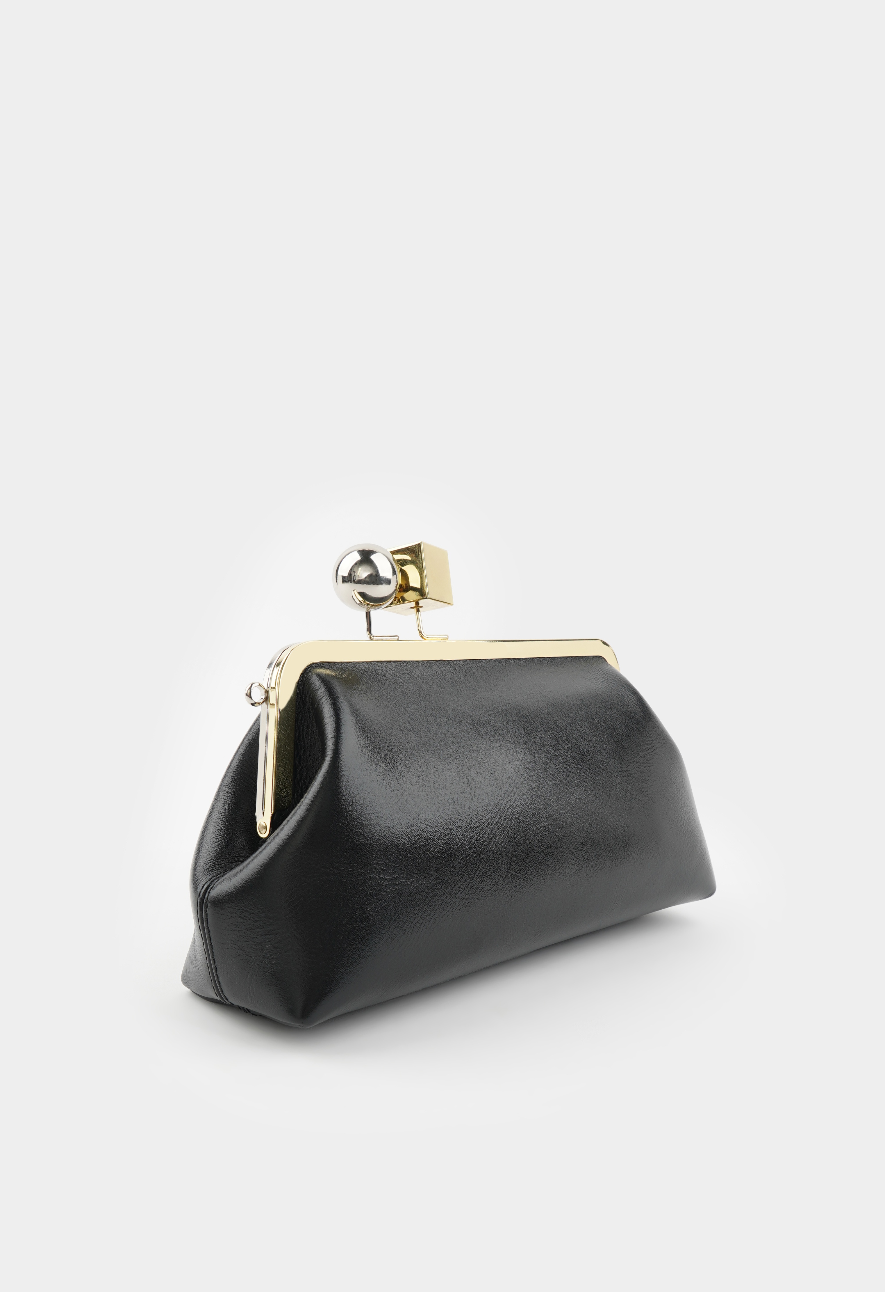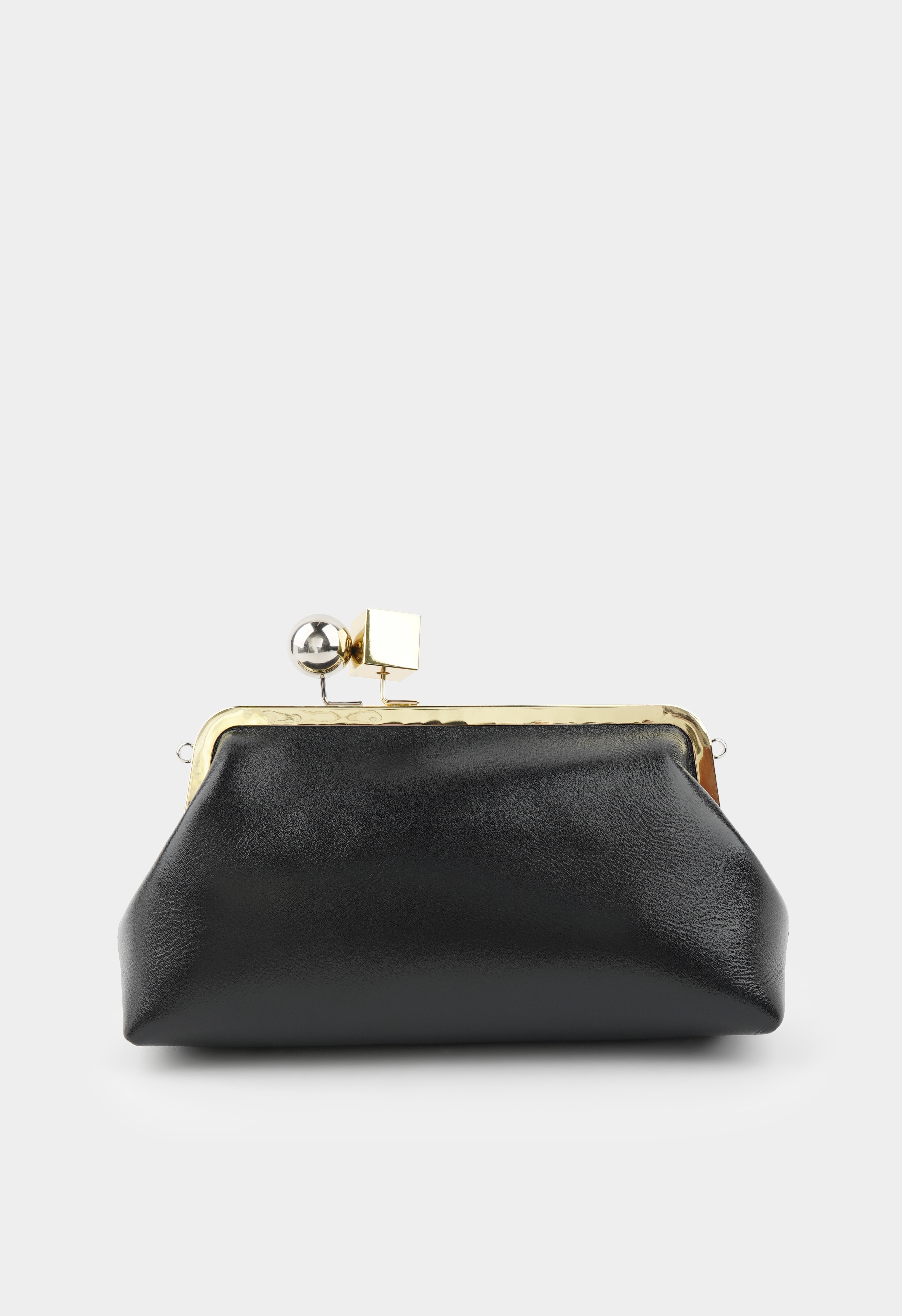 Эта маленькая сумка из натуральной кожи в классическом черном цвете – воплощение элегантности и практичности. Застежка фермуар с сочетанием серебряной и золотой фурнитуры придает модели современный, стильный акцент, а два внутренних кармана помогают держать вещи в порядке. Один плечевой ремень и съемная ручка делают сумку универсальной: можно носить ее через плечо или в руках, выбирая удобный вариант для повседневных дел или особых событий. Компактная, но функциональная модель станет ярким и утонченным дополнением к любому образу.