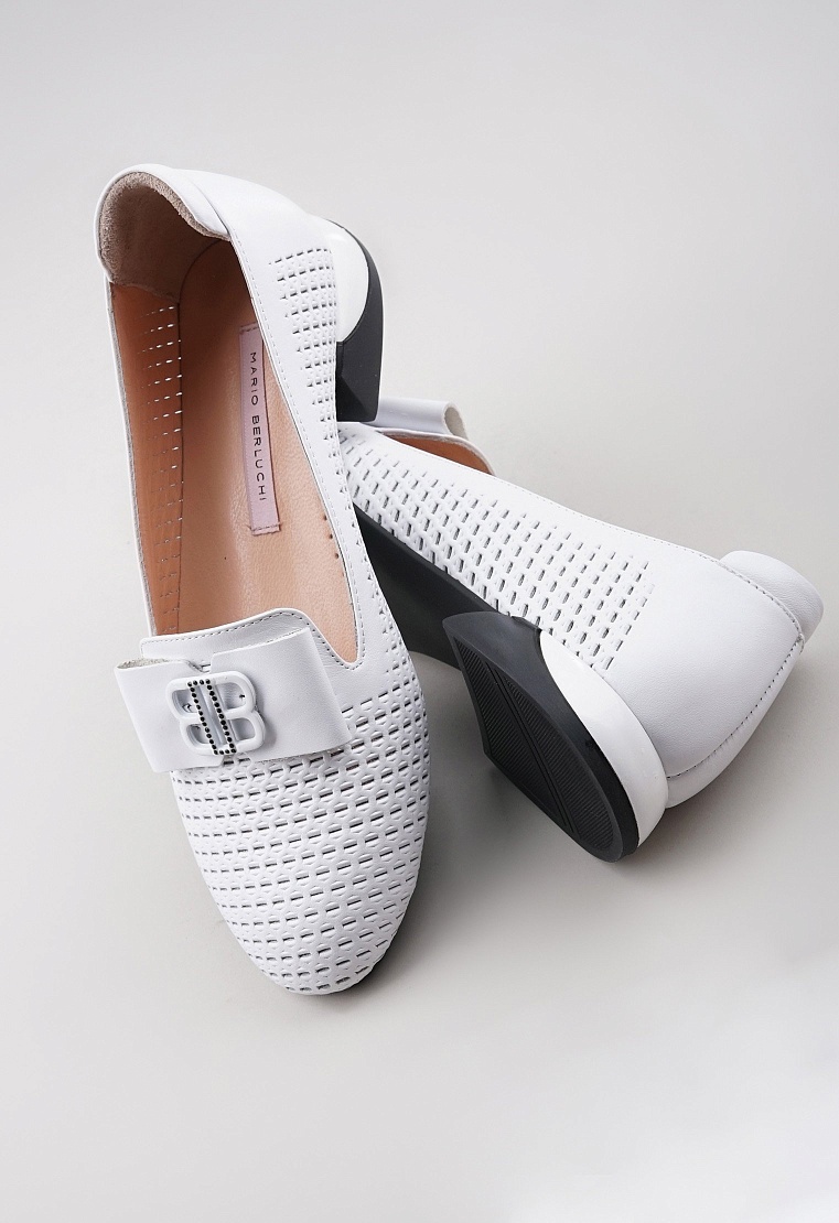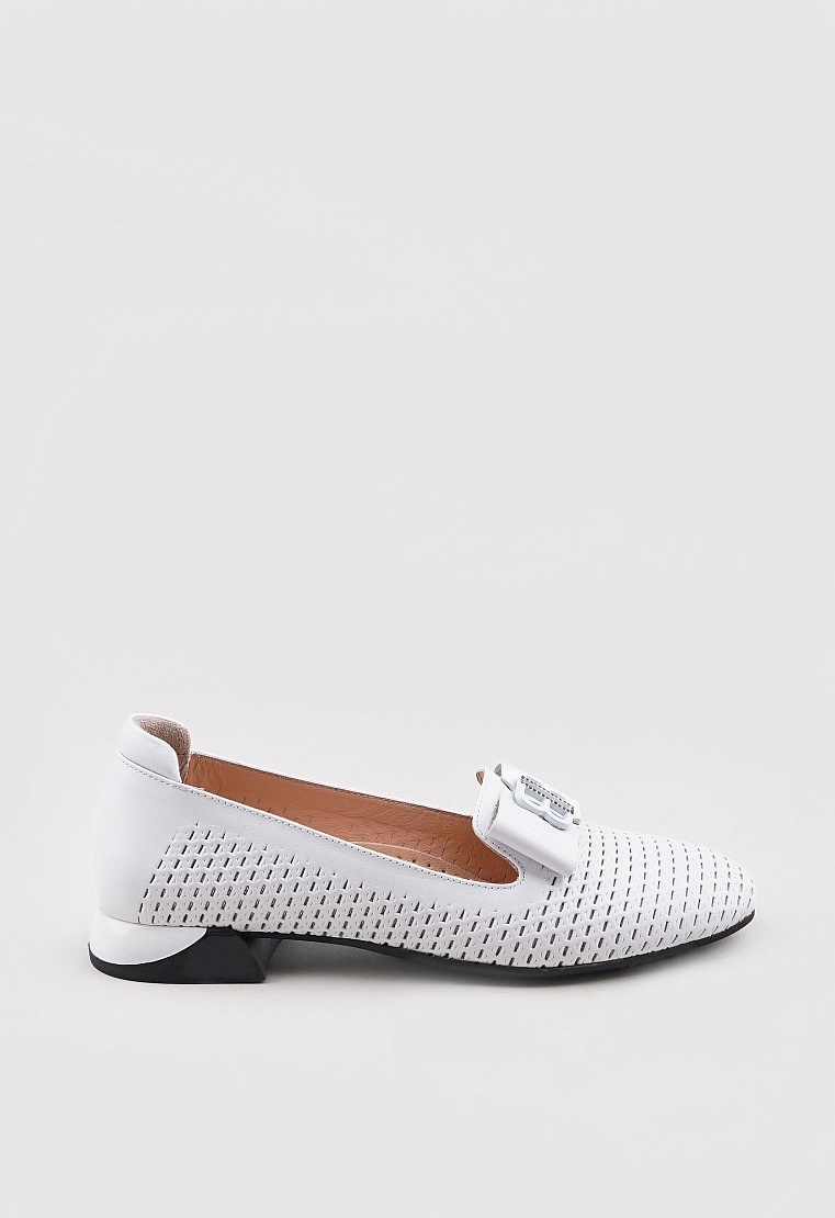 Обратите внимание: данная модель идёт в размер и отлично подходит для ног с узкой полнотой стопы. Советуем проконсультироваться с менеджером по выбору наиболее подходящего Вам размера. Стильные туфли из новой коллекции выполнены из натуральной кожи белого цвета и декорированы изящной перфорацией. Изделие дополнено подошвой на широком каблуке, что позволяет равномерно распределить нагрузку на стопу. Анатомическая кожаная стелька подарит комфорт на весь день. Современная модель превосходно впишется в женственный летний гардероб.