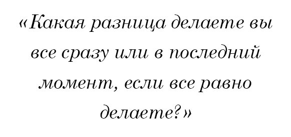 Также прокрастинация может быть вашим способом организации времени. Наверняка, каждый из вас сталкивался с тем, что доделывал проект или какую-то работу в последний момент, при этом никаким образом от этого не пострадал. Так какая разница - делаете вы все вовремя или в последний момент, если все равно делаете?