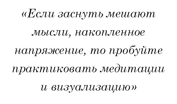 Если заснуть мешают мысли, накопленное напряжение, то пробуйте практиковать медитации и визуализацию.