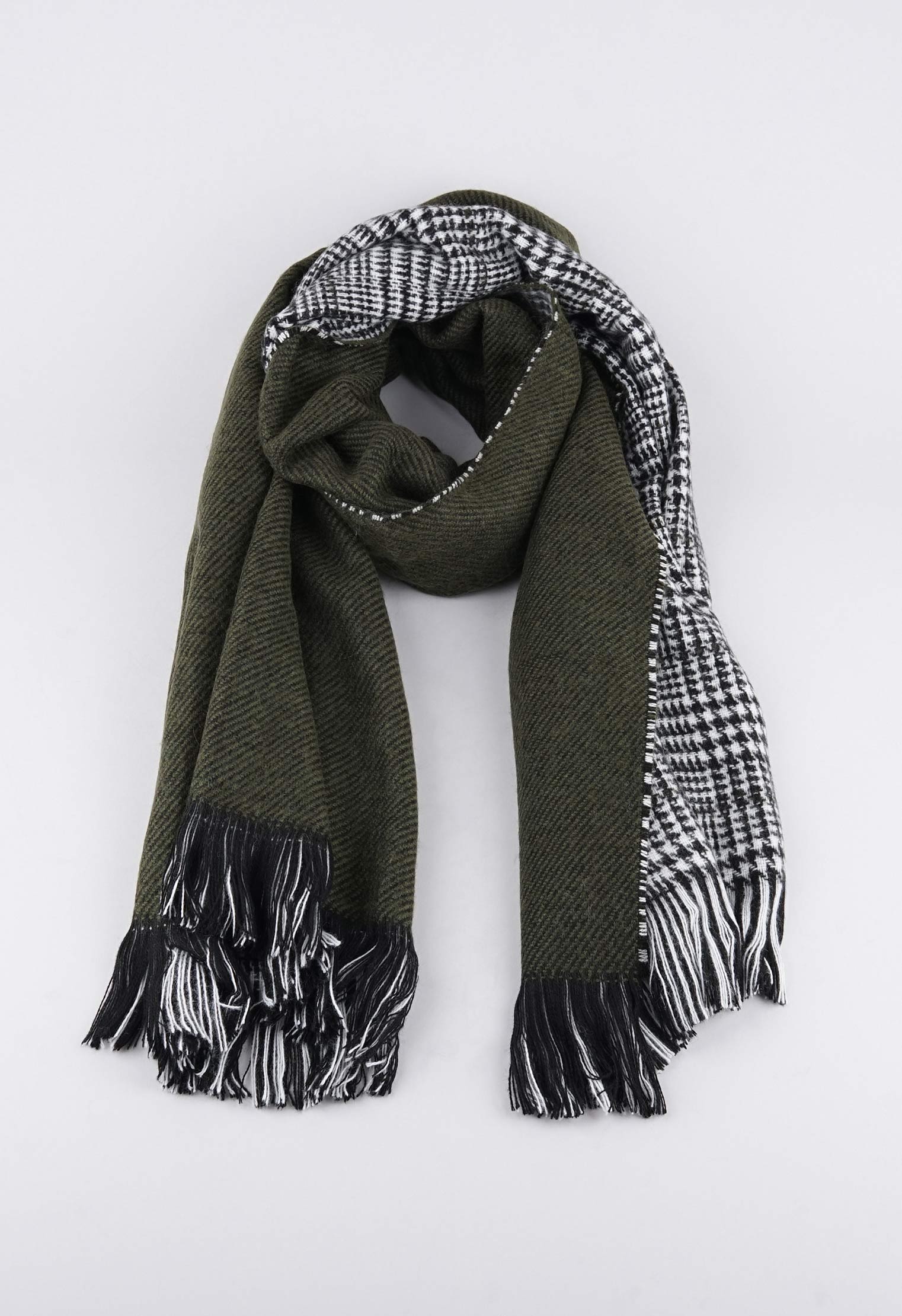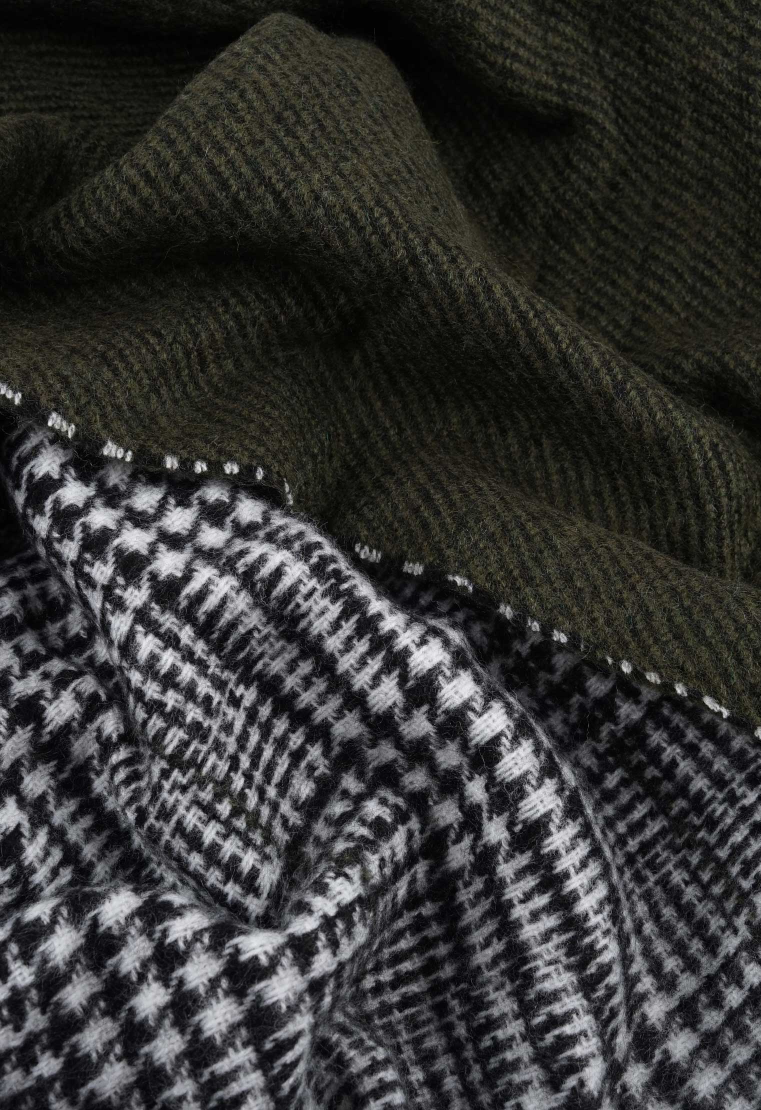 Подбирала так чтобы максимально вписался, цвет темный зеленый смотрится благородно и красиво, что порадовало можно ность любой стороной, если надо поярче, если надо потемнее более классический стиль сразу получается. Состав шерсть/вискоза, довольно плотный. Рекомендую!!!