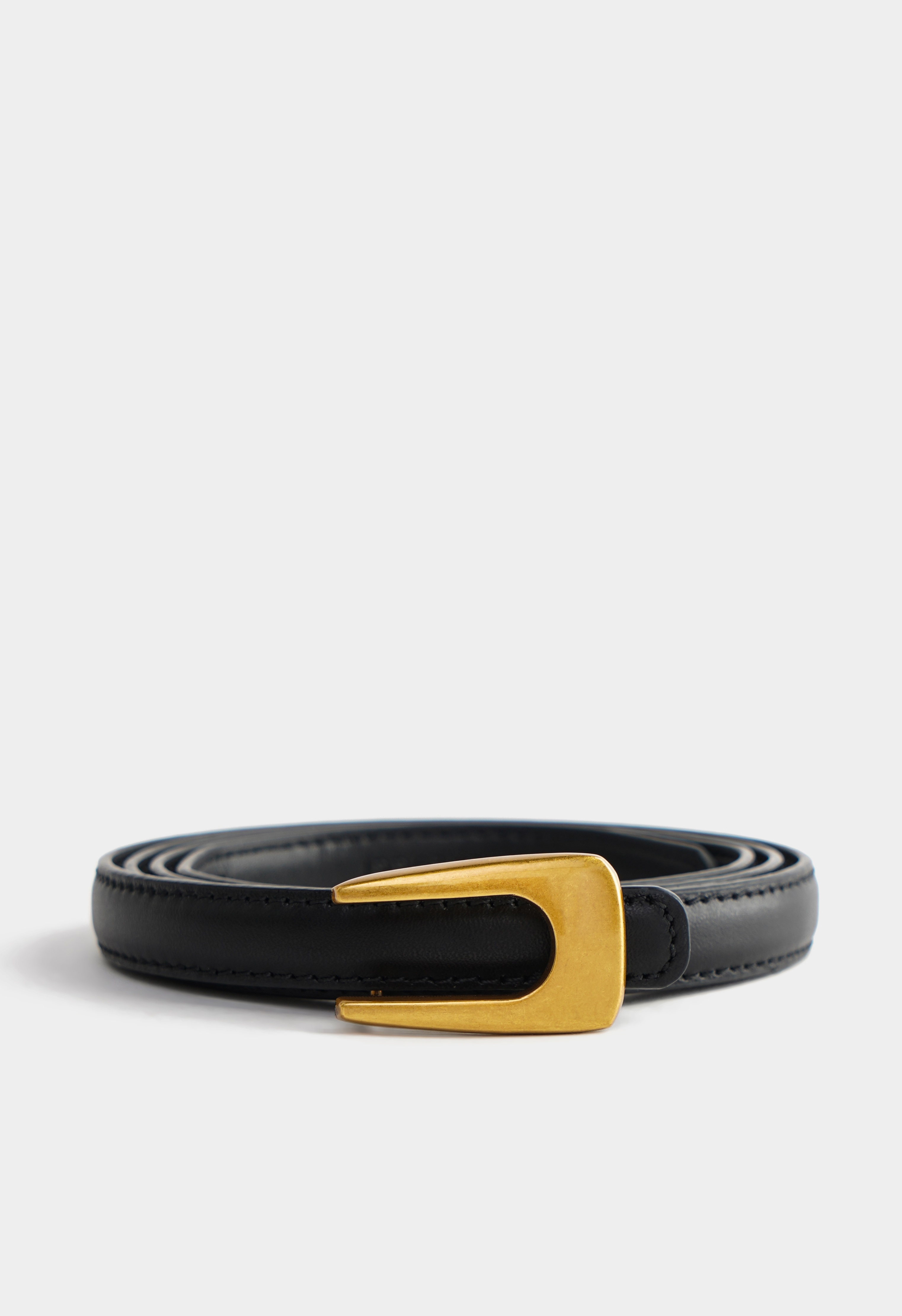 Черный ремень из натуральной кожи – универсальный акцент, который подчеркивает талию и придает образу собранный, дорогой вид. Золотая пряжка лаконичной формы добавляет элегантный блеск и легко сочетается с любой одеждой – от денима до классики.