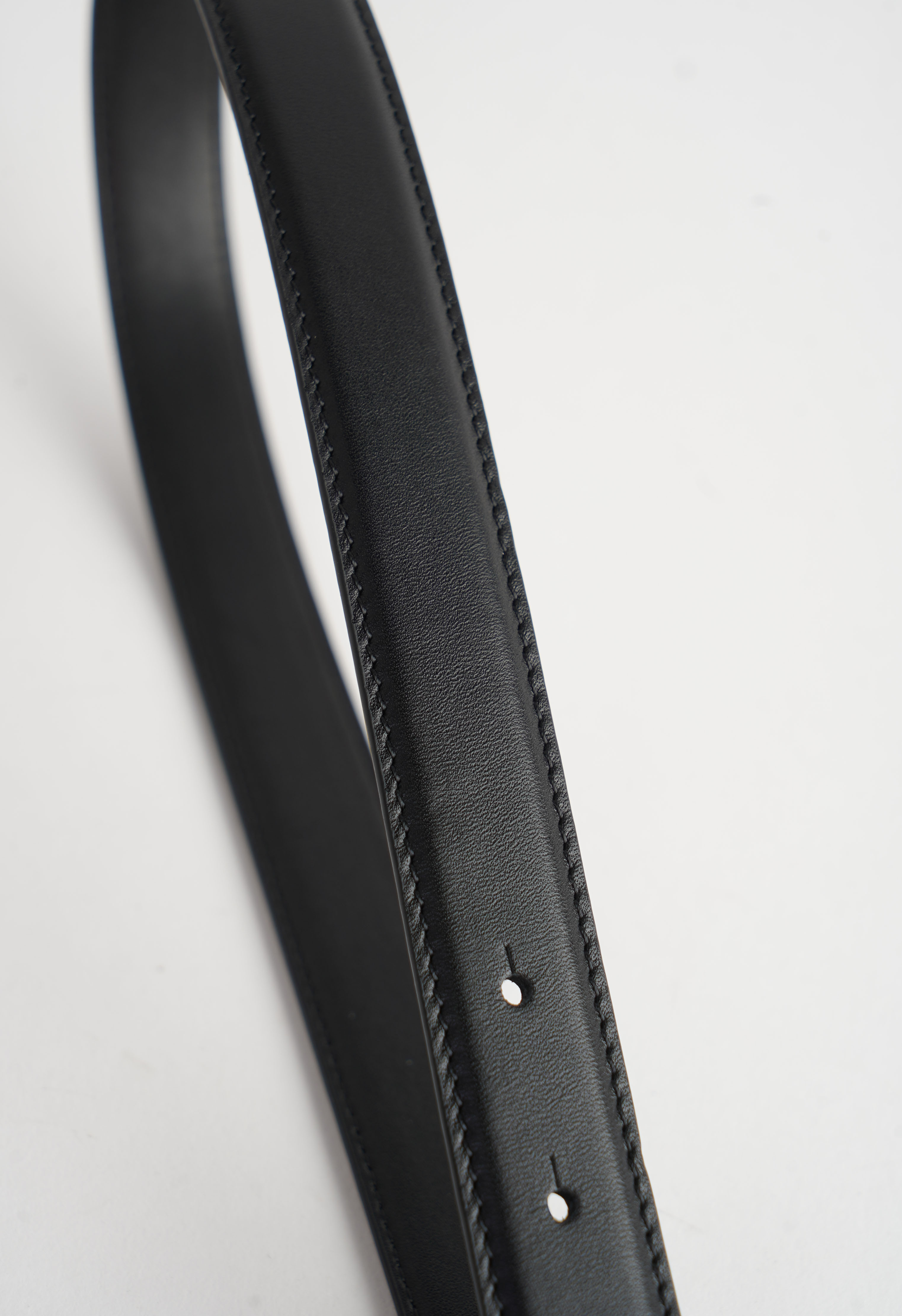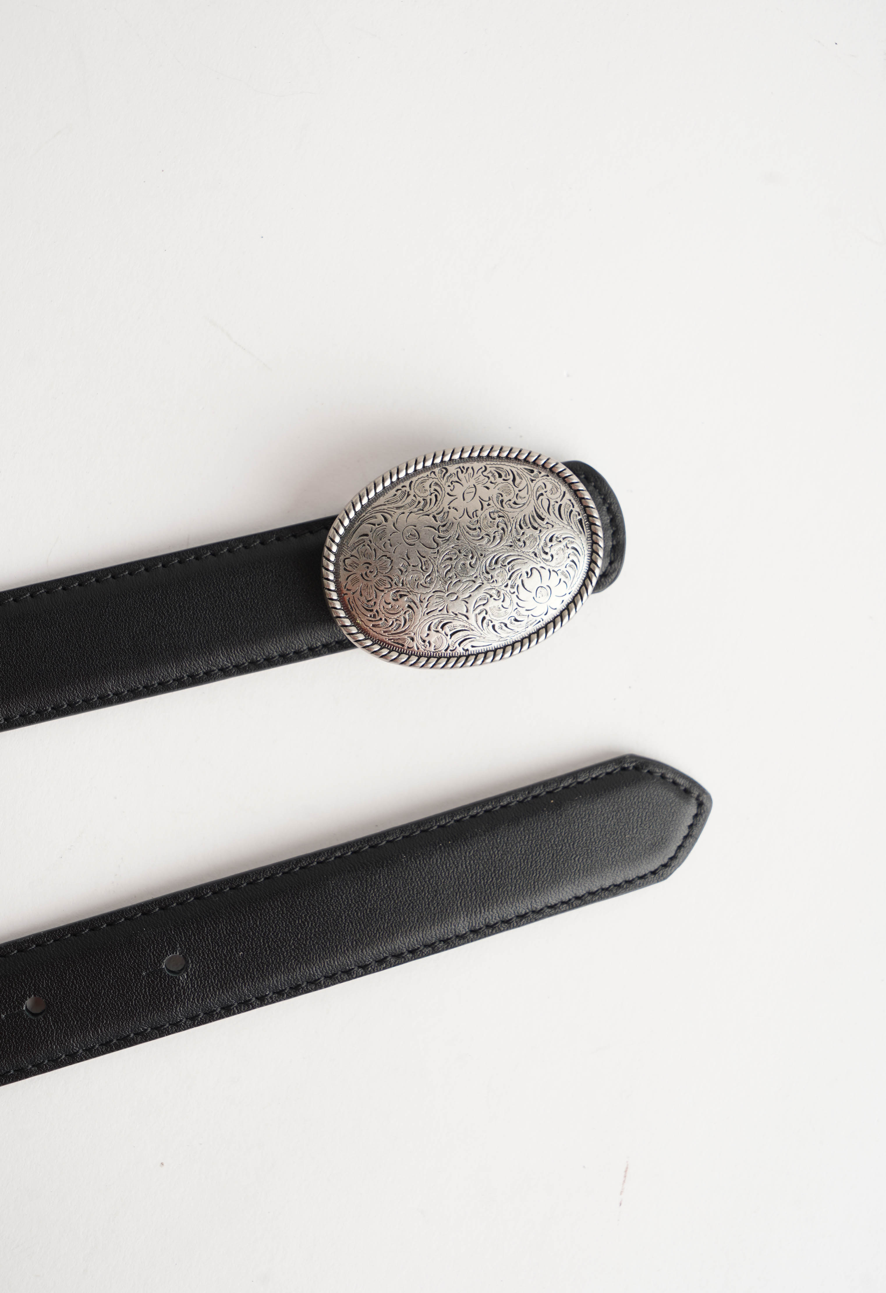 Акцент образа – ремень из черной натуральной кожи с выразительной серебряной пряжкой овальной формы. Тонкая гравировка и декоративный кант красиво ловят свет и смотрятся как украшение, а гладкая кожа с аккуратной строчкой добавляет ощущение дорогой, ухоженной базы.