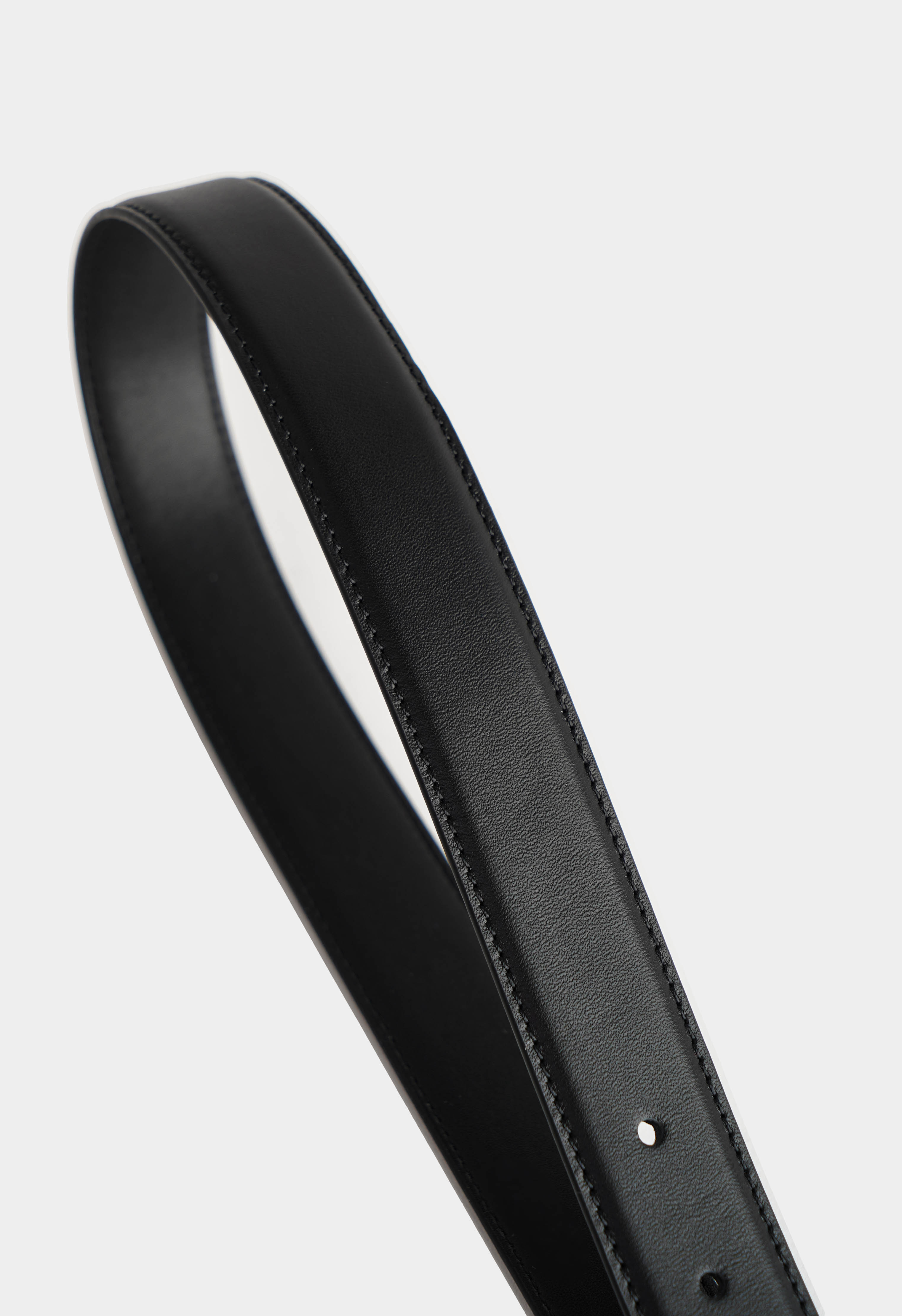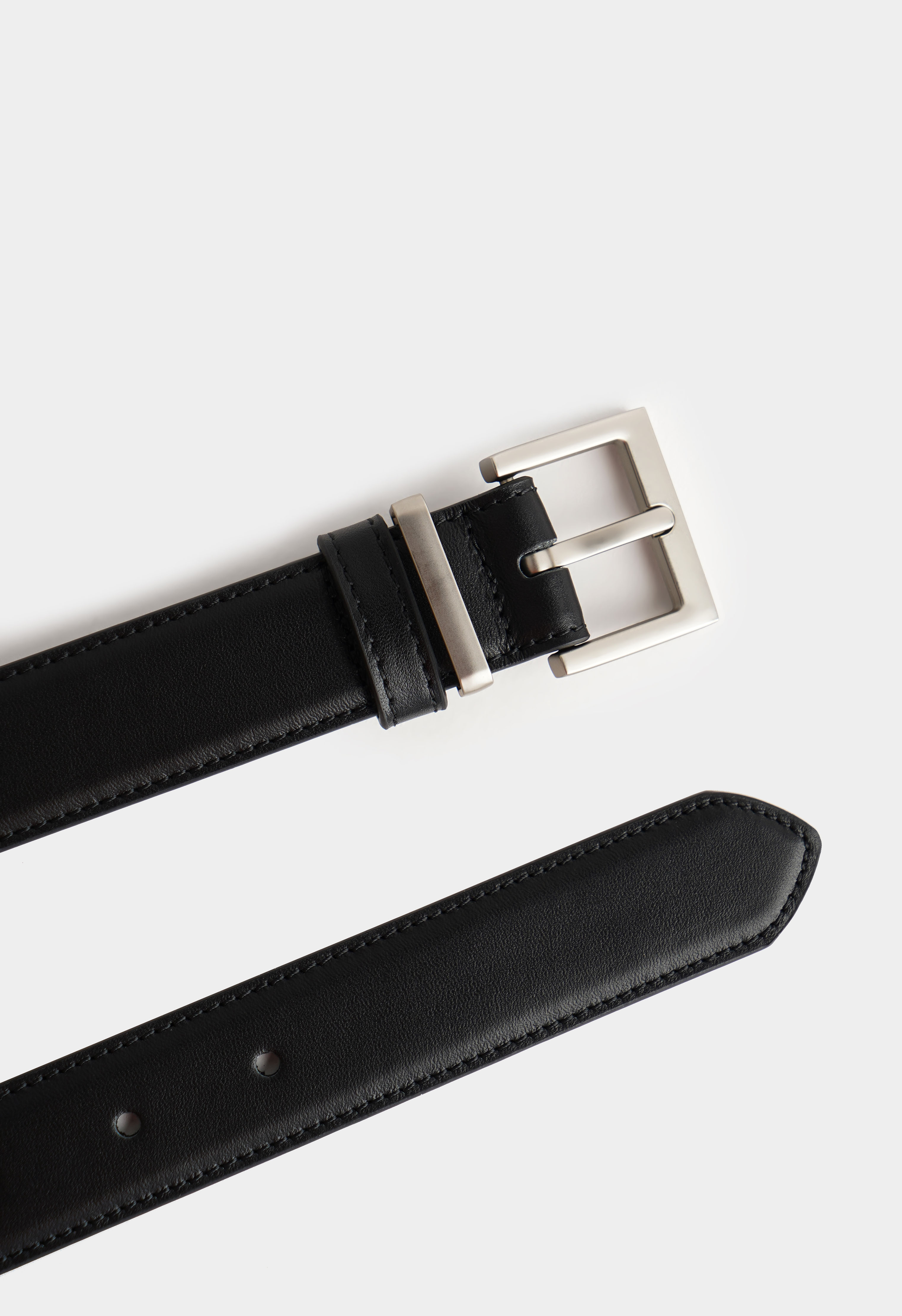 Классический черный ремень из натуральной кожи – аккуратная база, которая делает образ собранным и уверенным. Широкая прямоугольная серебряная пряжка выглядит строго и современно, подчеркивая строгие линии и минималистичный стиль.