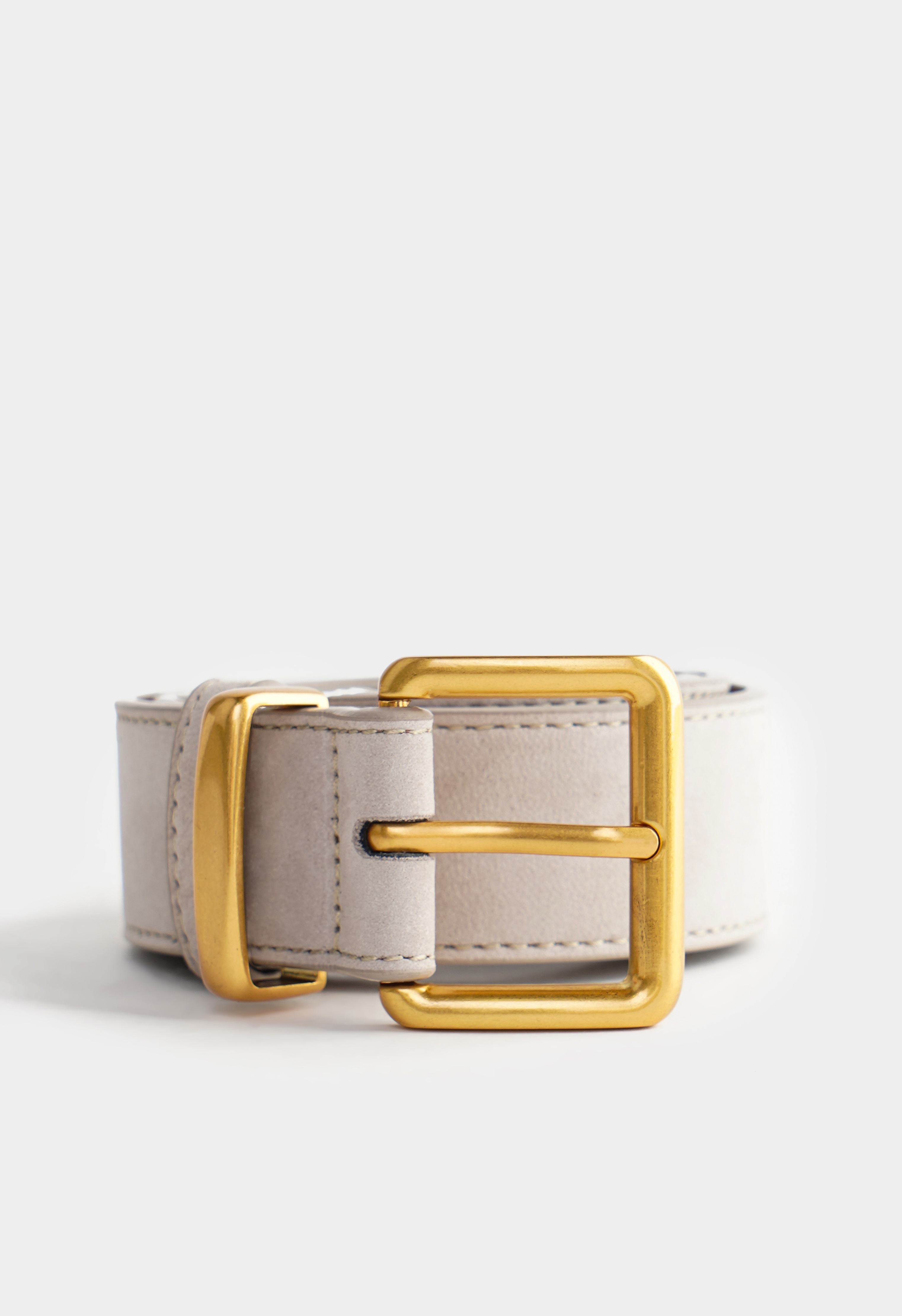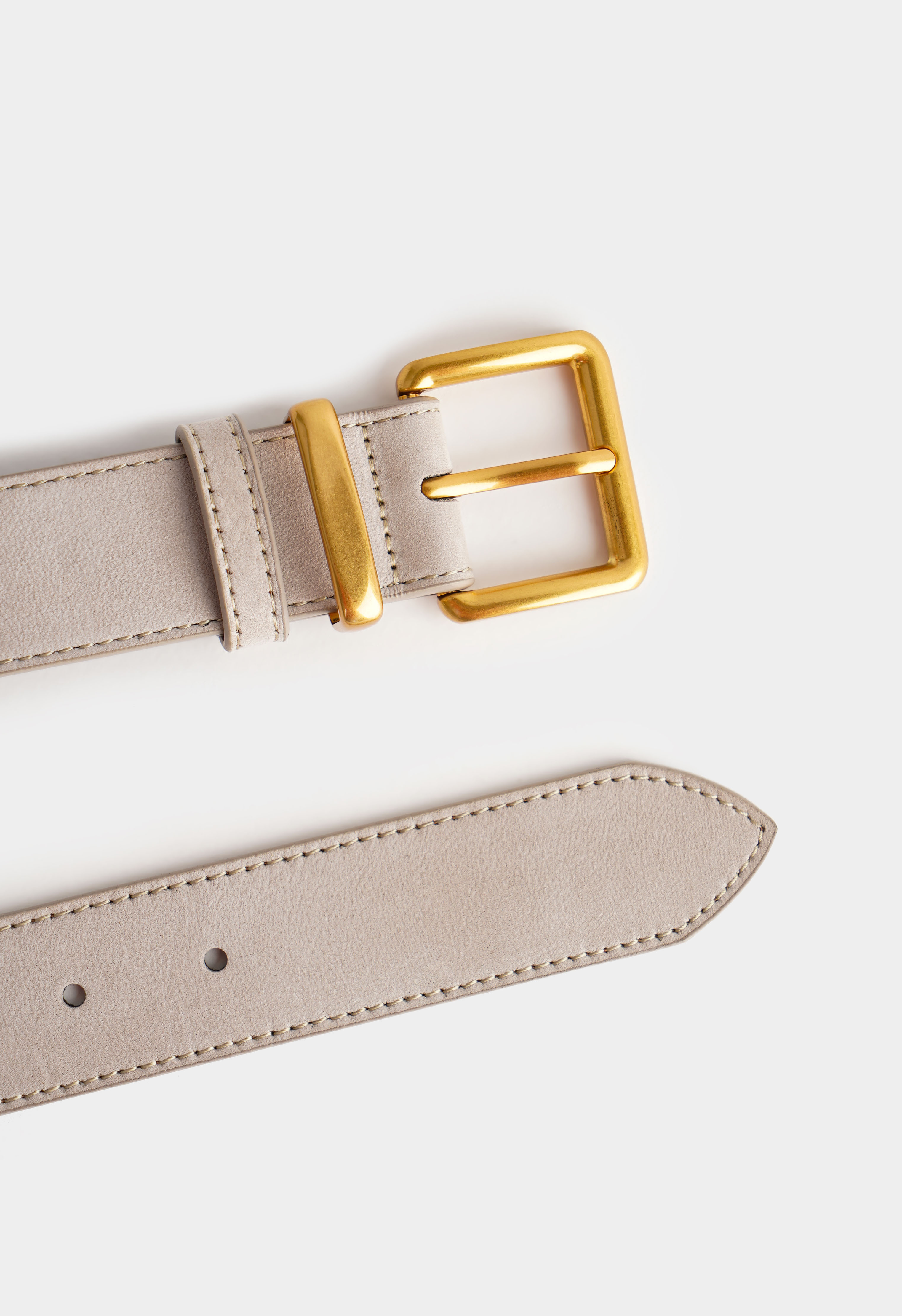 Серый ремень из натурального нубука – спокойная, благородная база с мягкой бархатистой фактурой, которая выглядит дорого и аккуратно. Матовая золотая пряжка прямоугольной формы добавляет акцент и красиво контрастирует с холодным оттенком нубука.