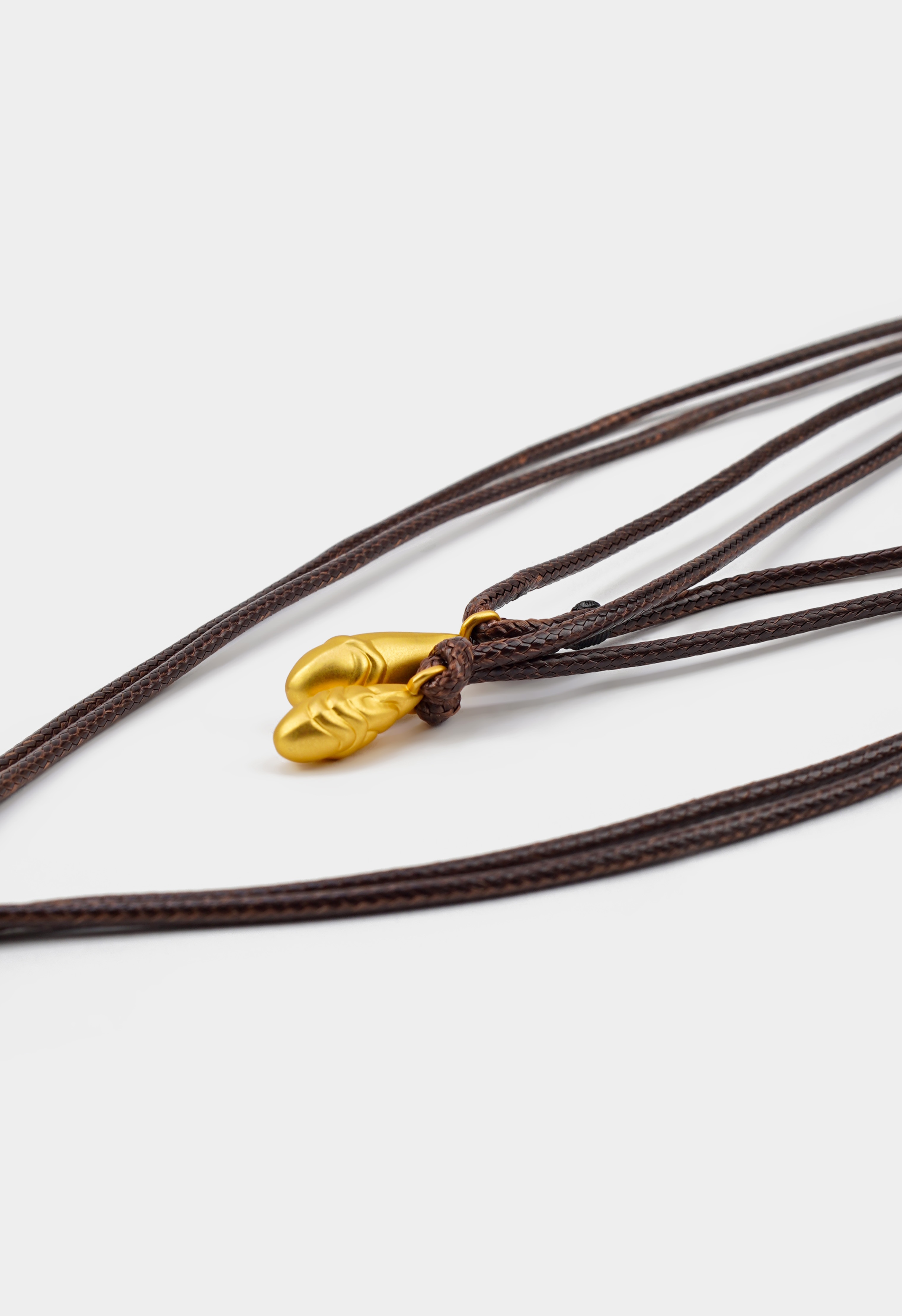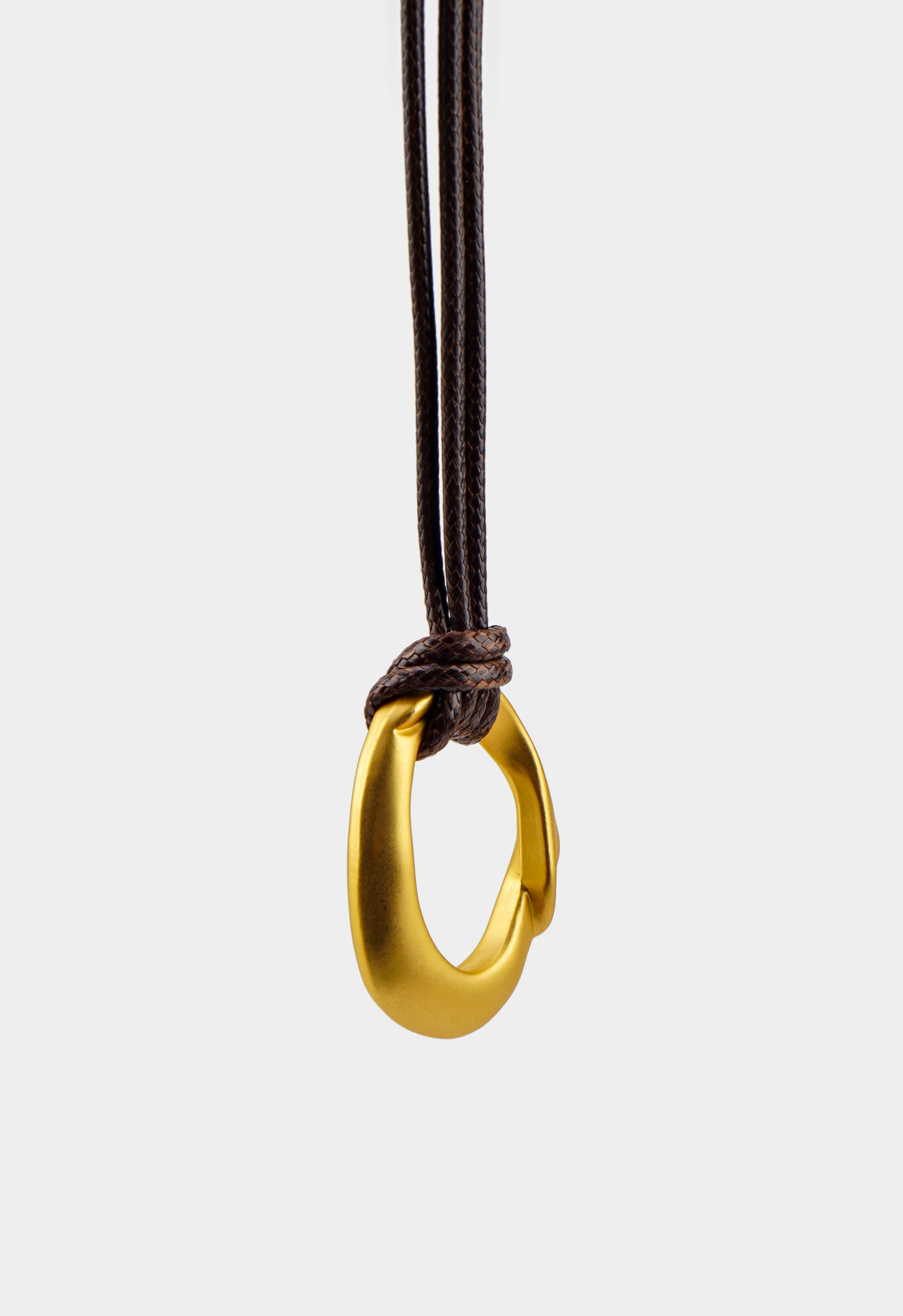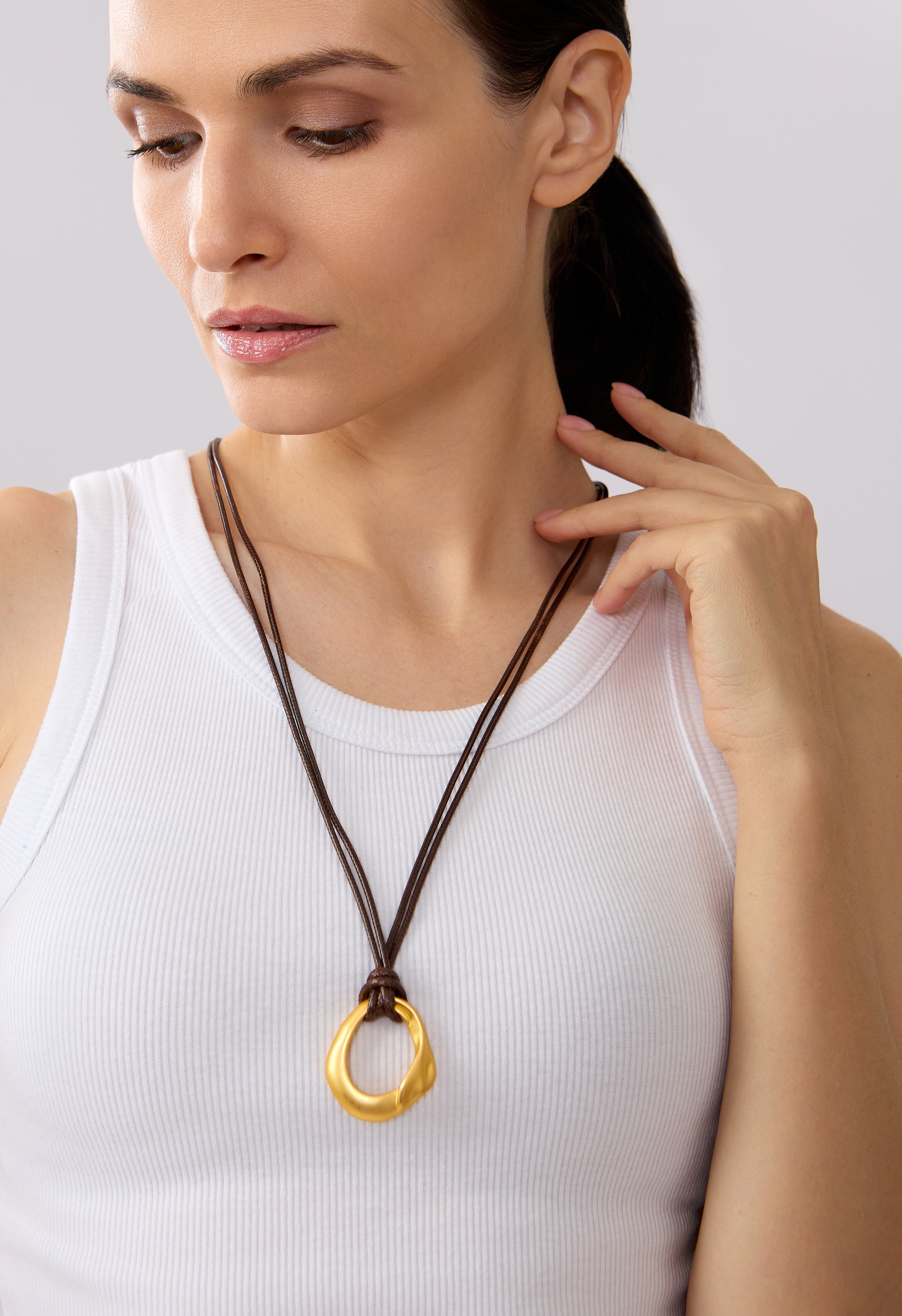 Очень гармоничное украшение. Коричневая основа добавляет тепла в образ, а золотистая подвеска