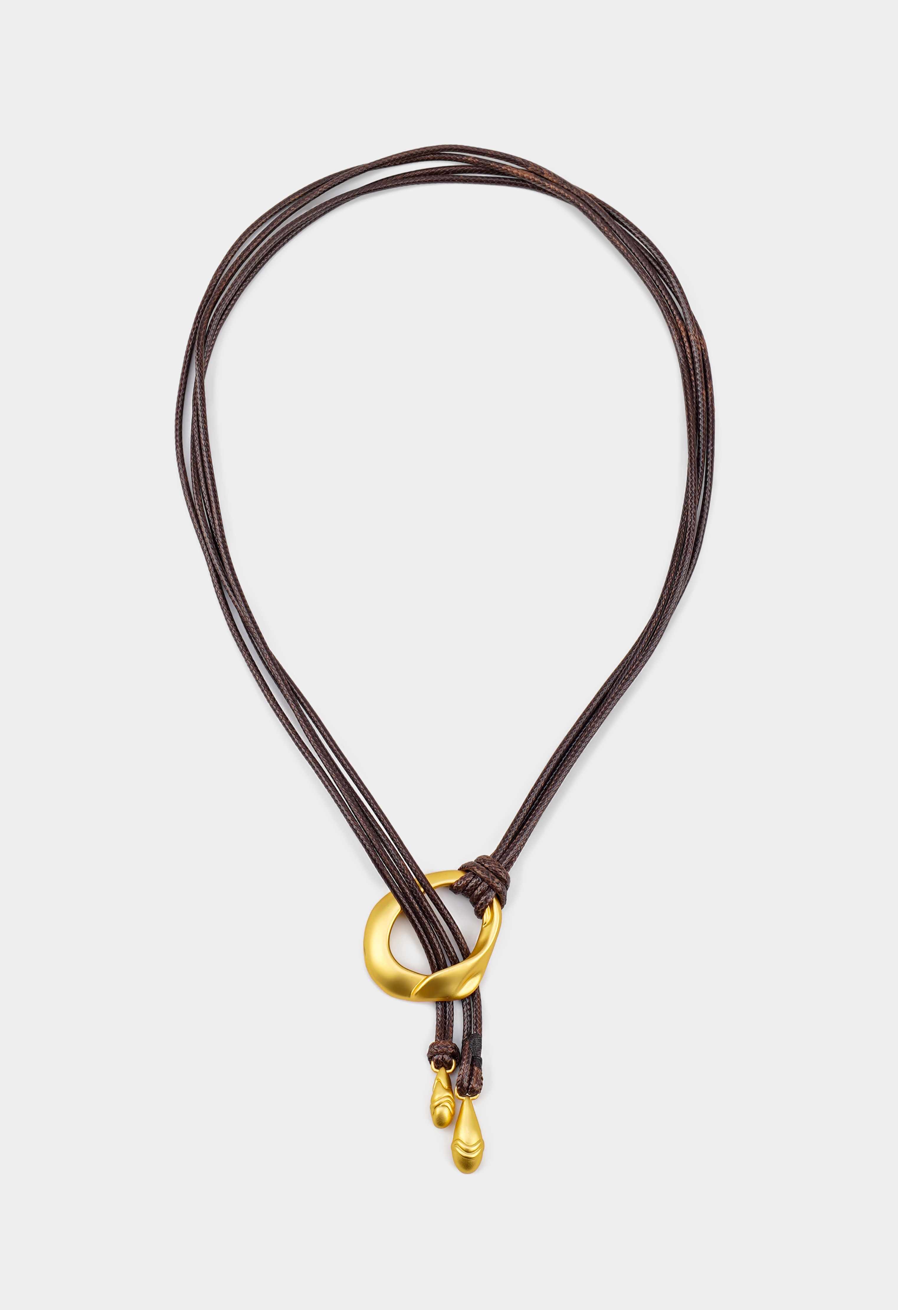 Ожерелье из ювелирного сплава золотого цвета с подвеской и текстильной основой насыщенного коричневого оттенка – это стильное сочетание изысканности и комфорта. Легкая текстильная база мягко ложится на шею, а кулон с золотистым сиянием добавляет акцент утонченности. Такой аксессуар легко впишется в повседневный образ и подчеркнет элегантность в особых случаях.