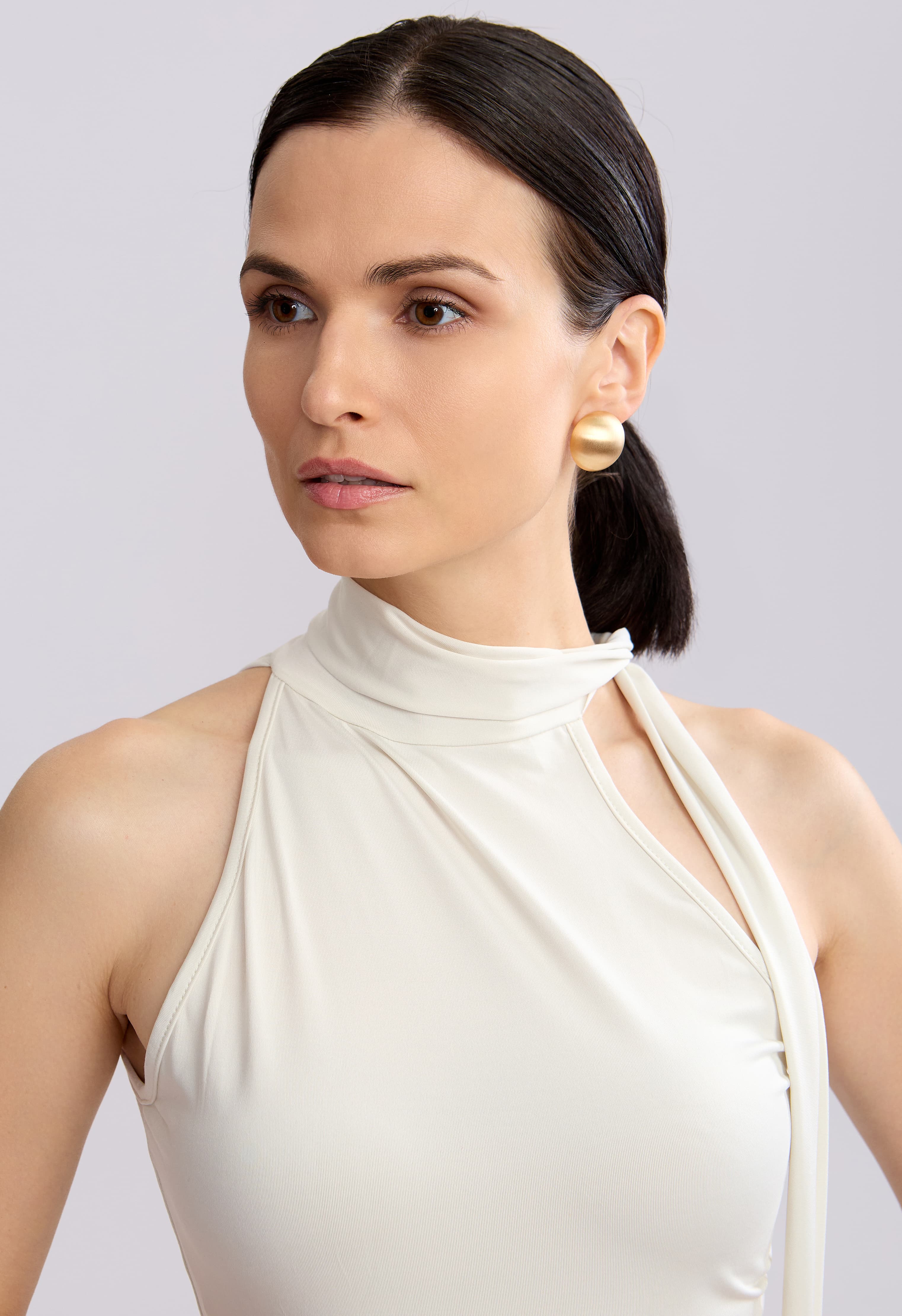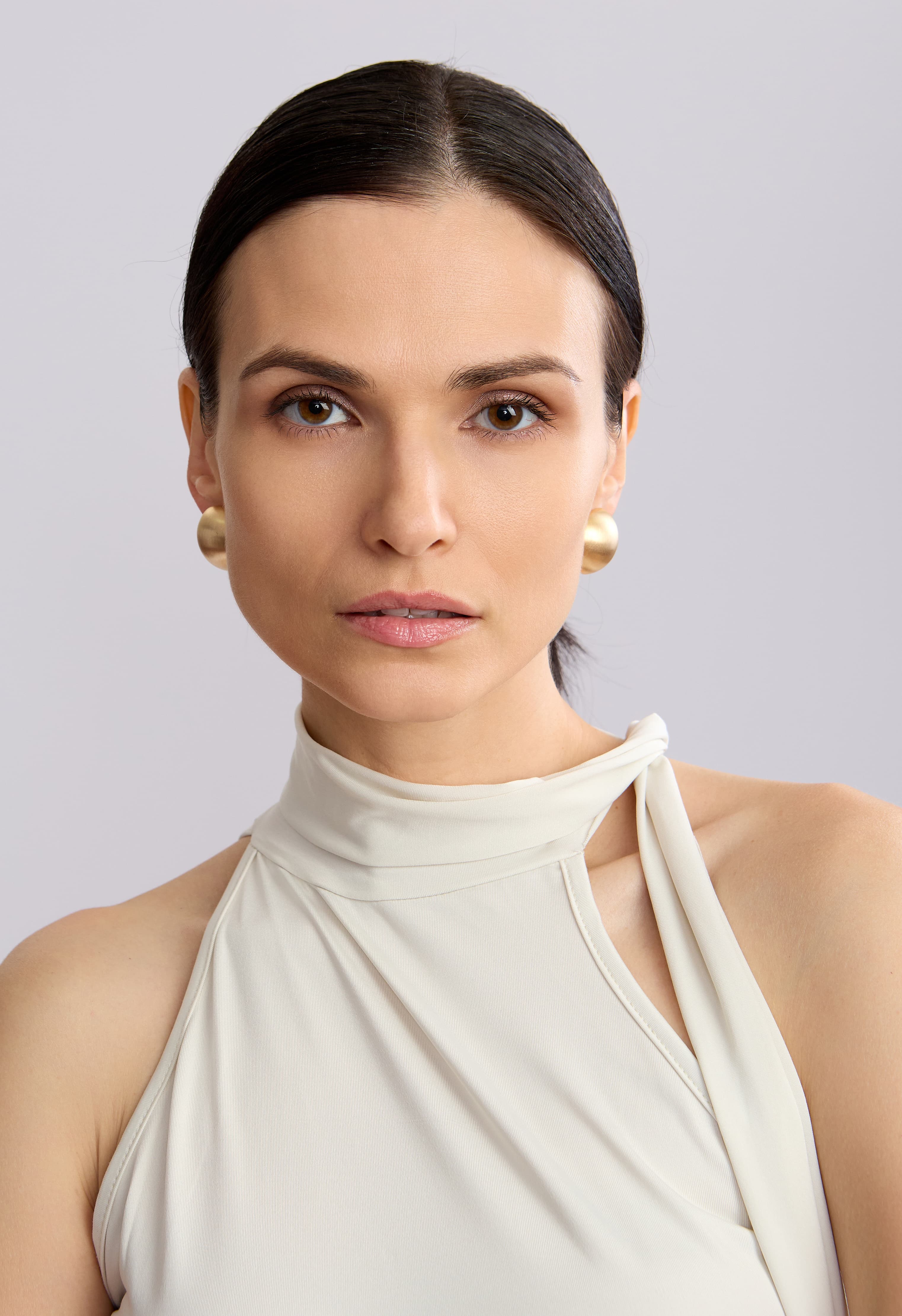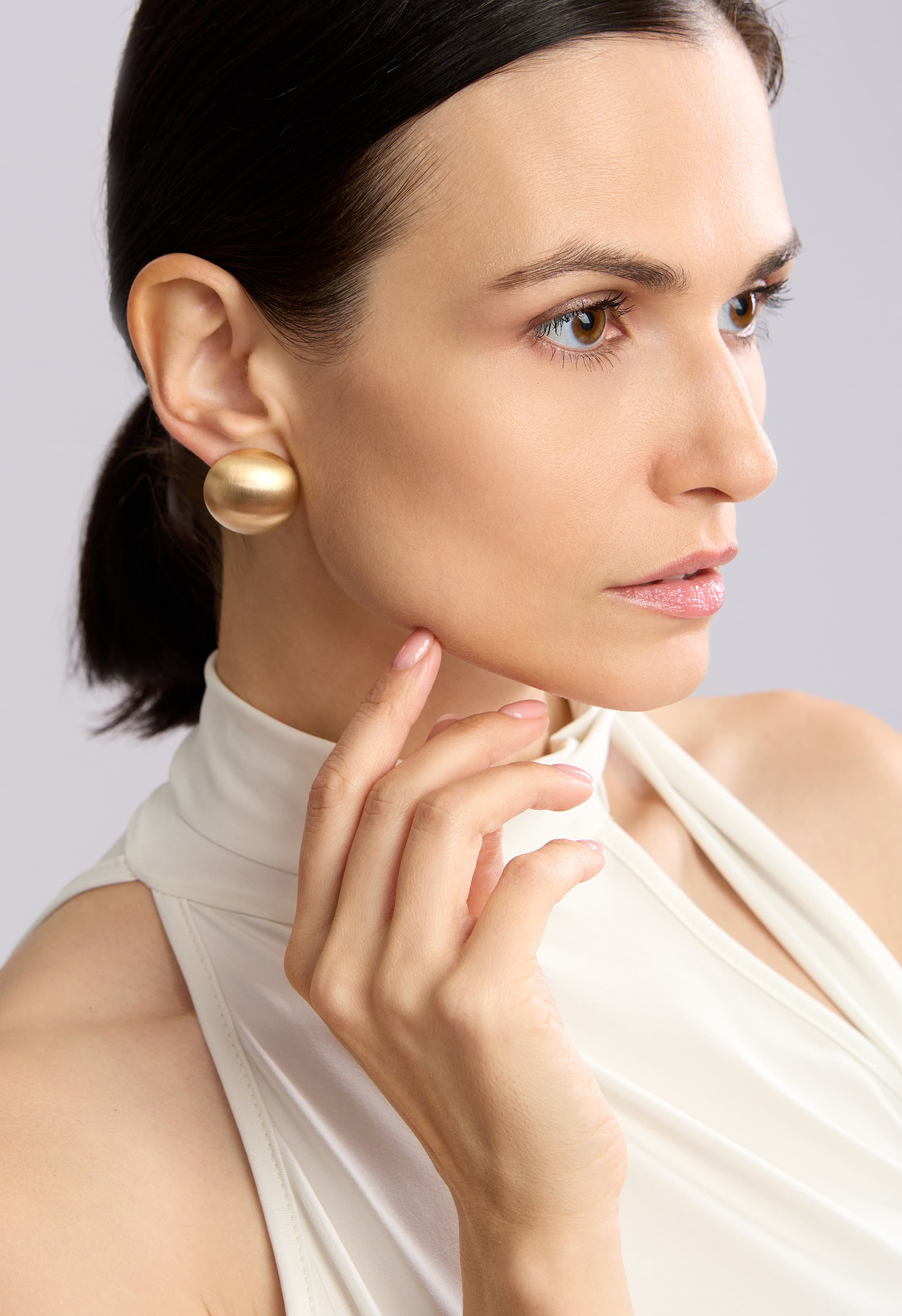 Серьги выполнены из ювелирного сплава. Модель округлой формы представлена в золотом цвете и имеет застежку на пусете.