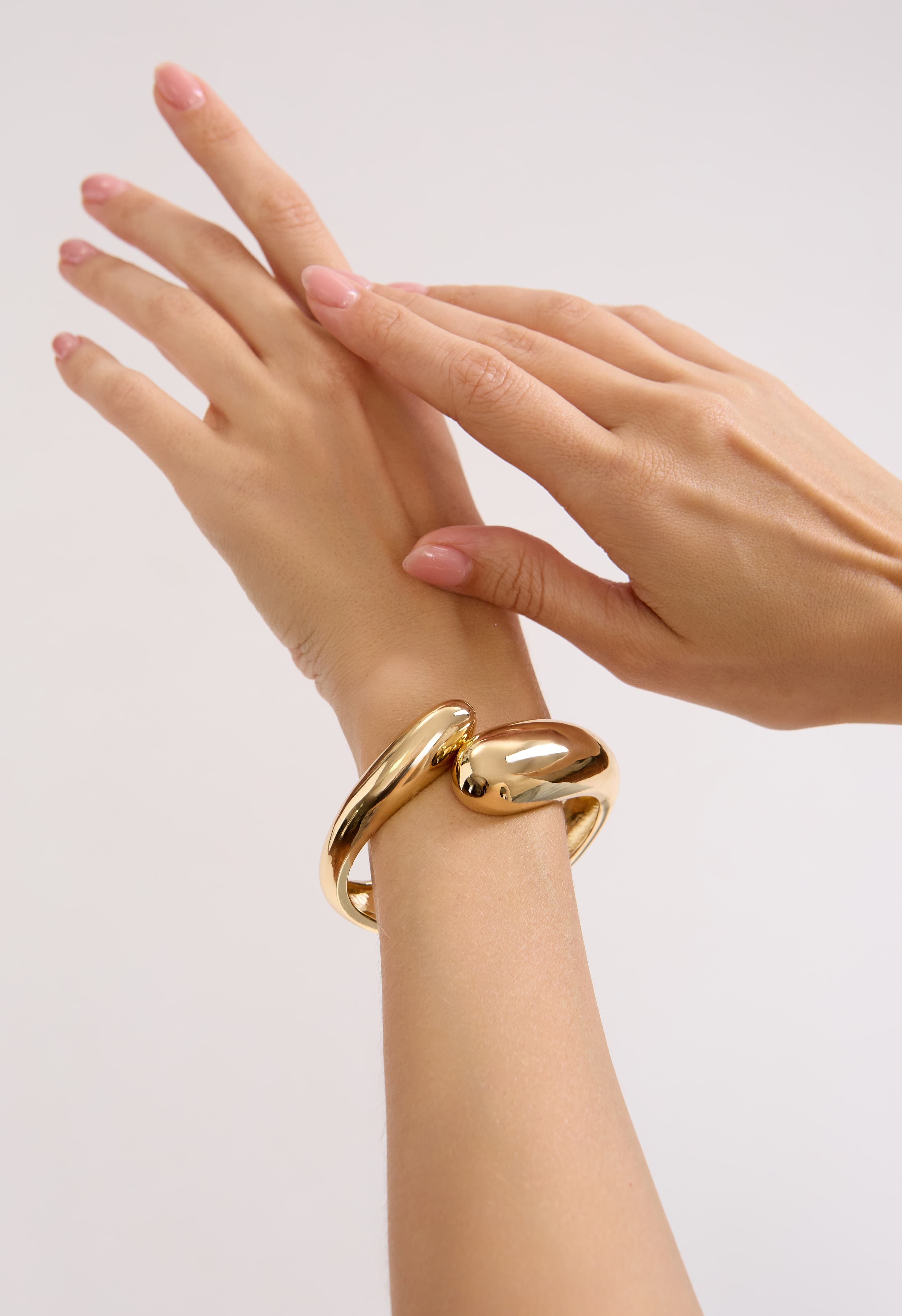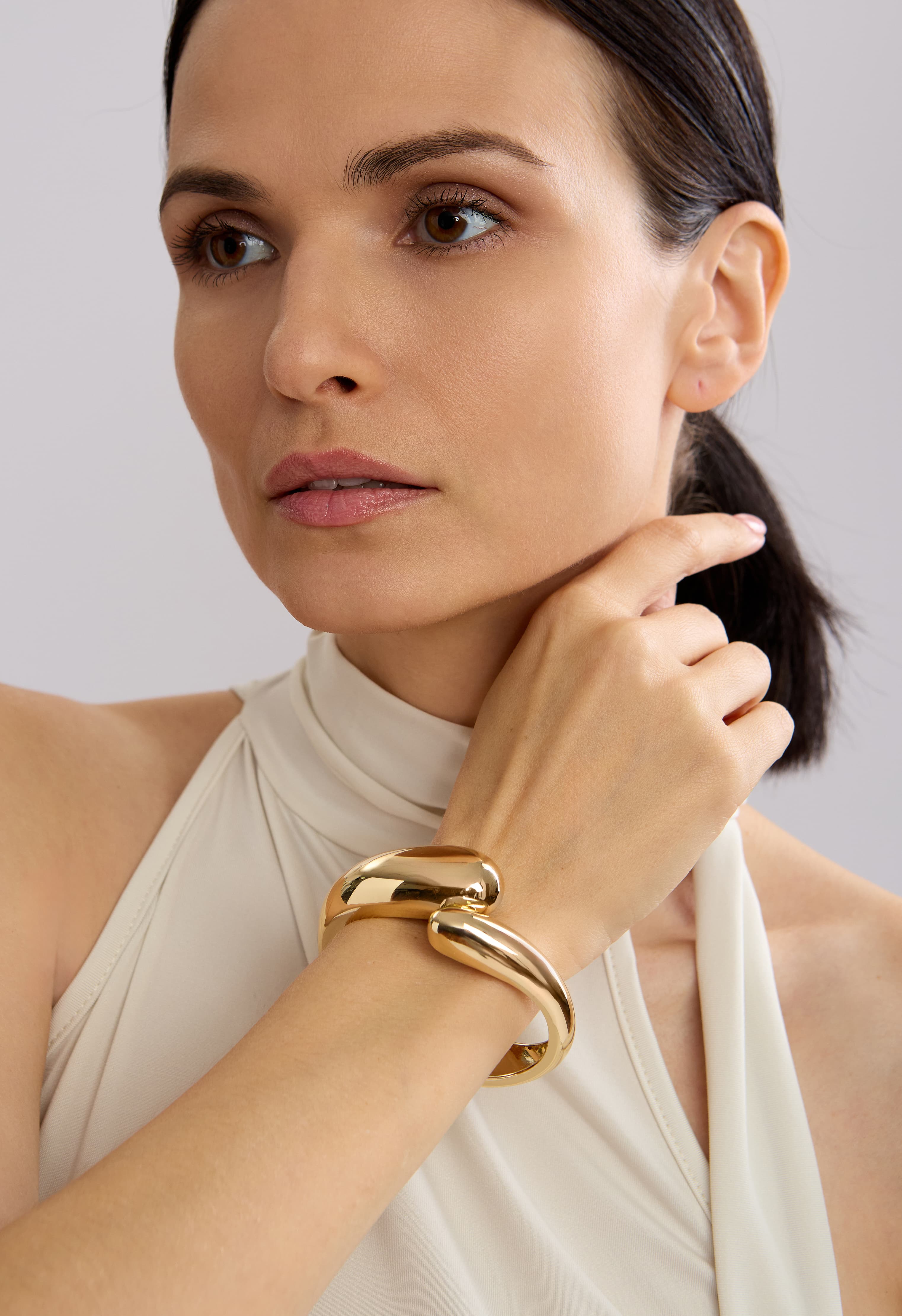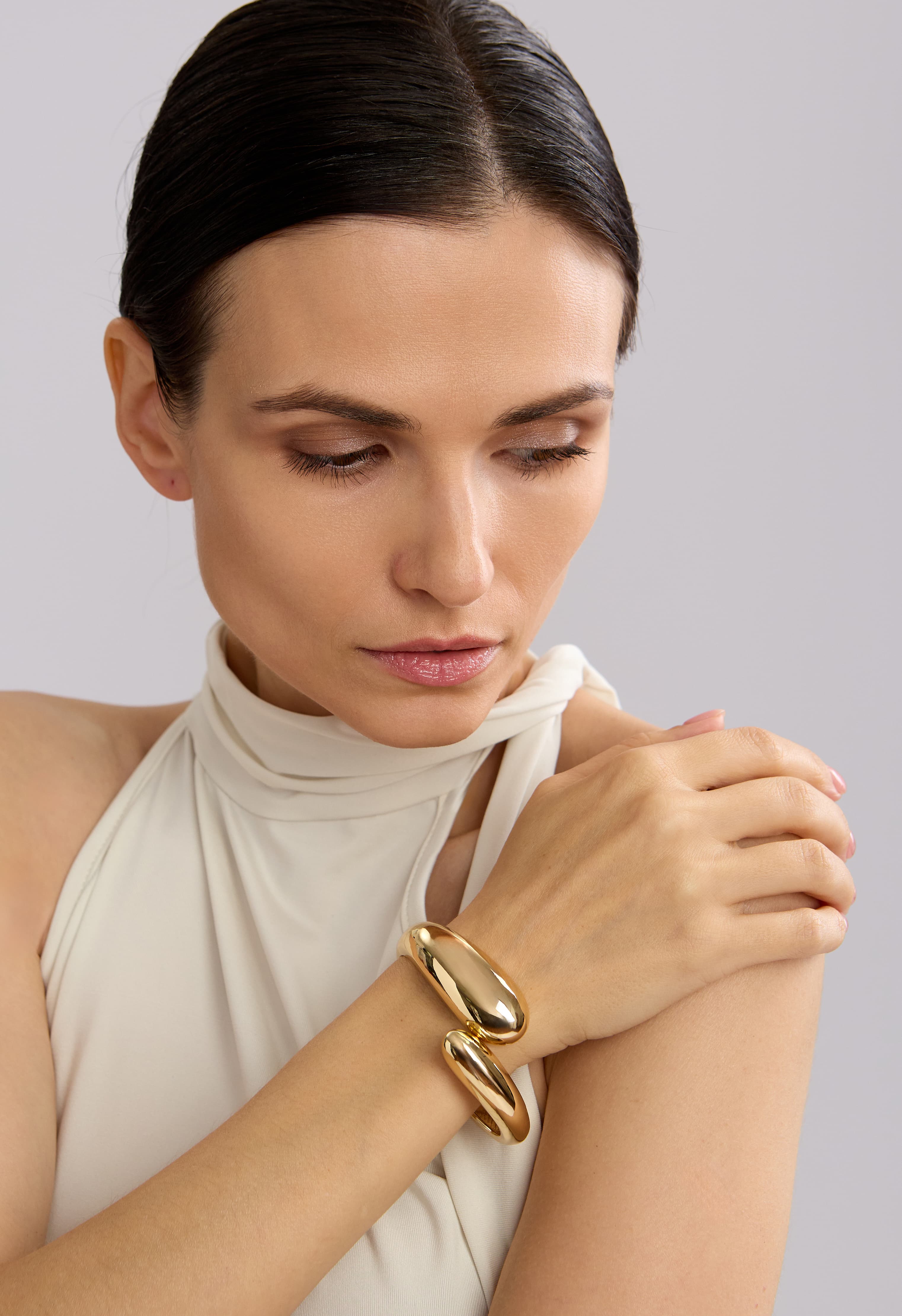 Золотой браслет идеально подойдёт как для повседневных встреч, так и для особых событий. С его блеском и стильным минималистичным дизайном нельзя остаться незамеченной.