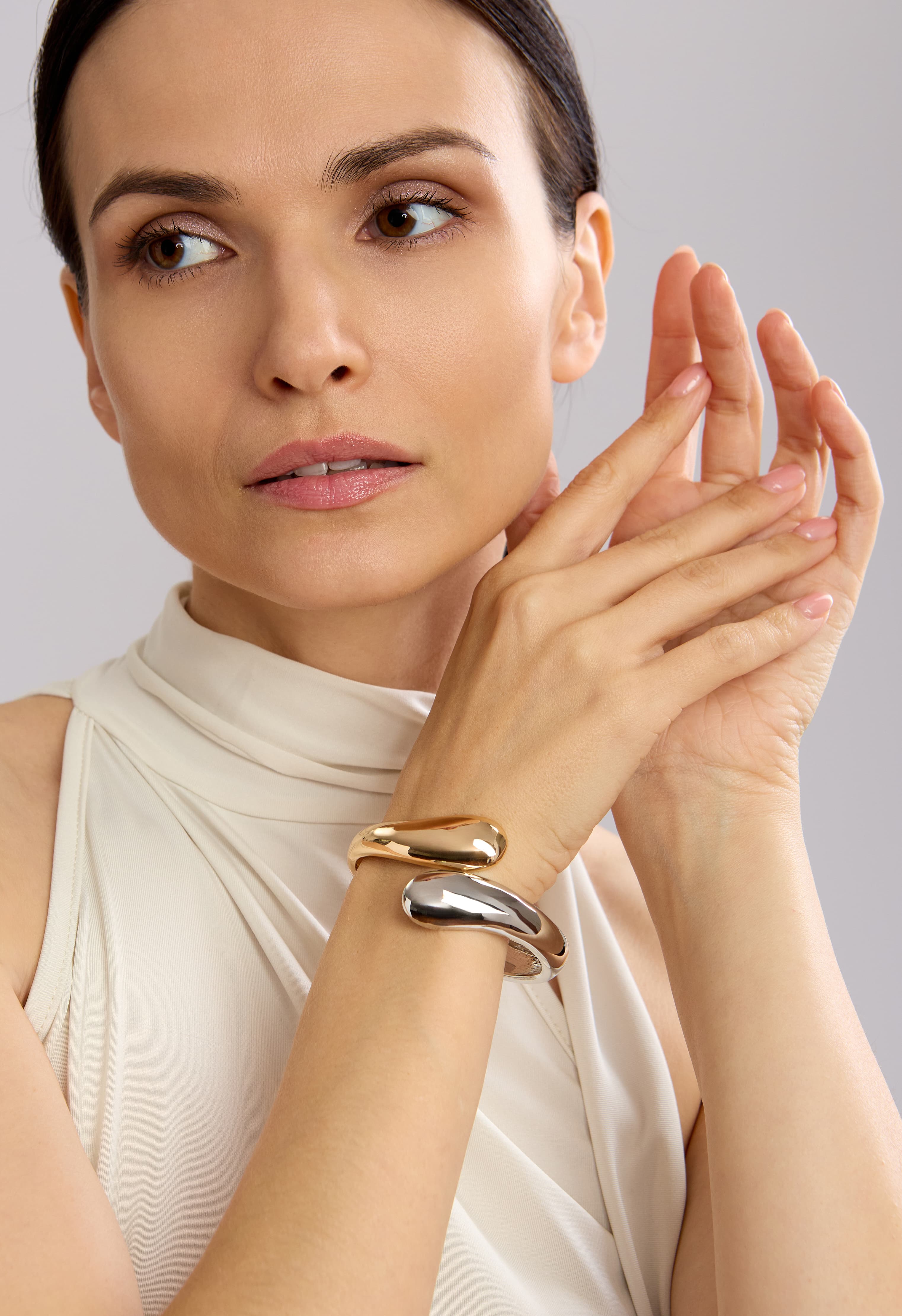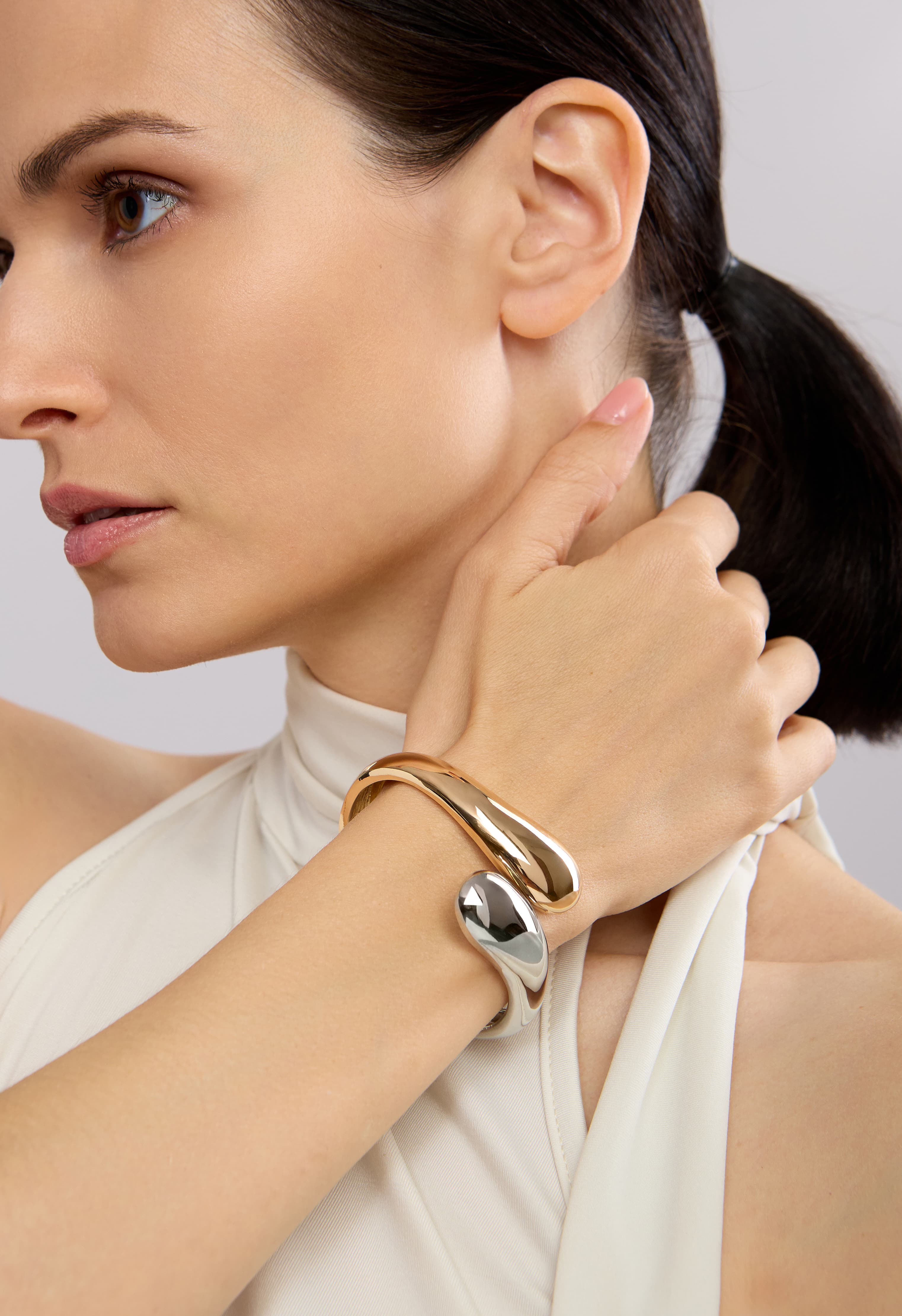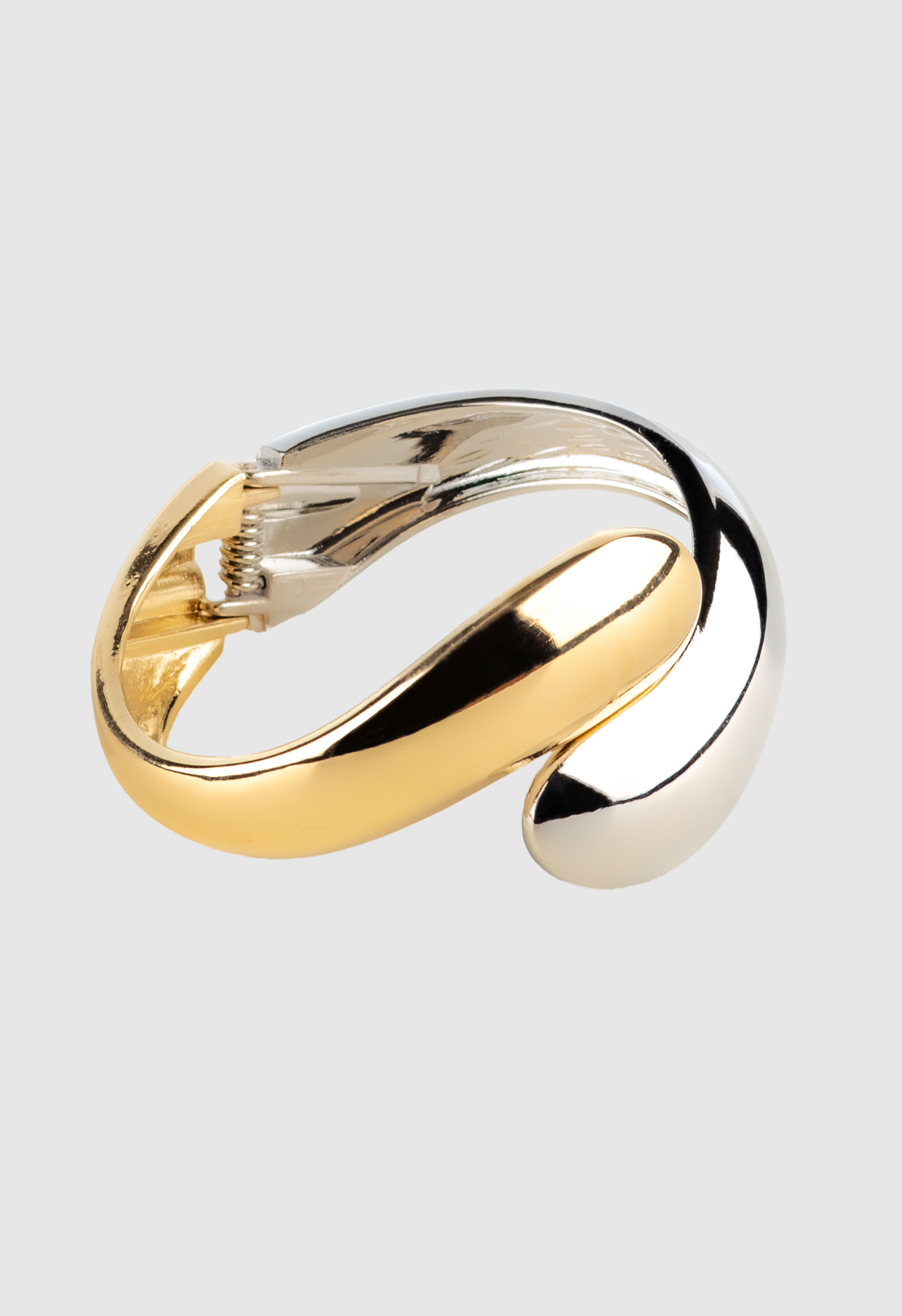 Браслет выполнен из высококачественного ювелирного сплава. Украшение сочетает в себе серебряный и золотой цвет. Аксессуар станет прекрасным завершающим штрихом образа.