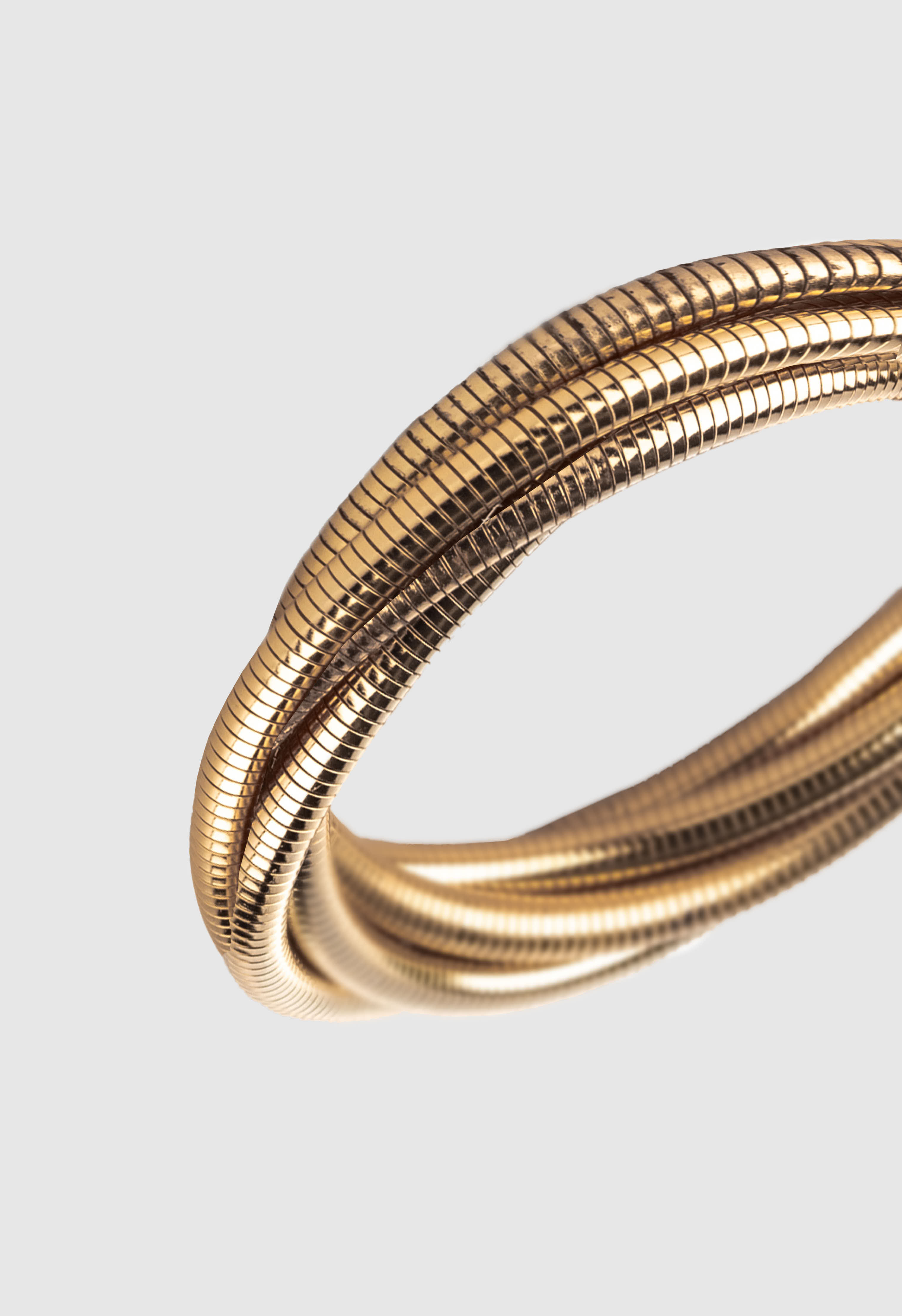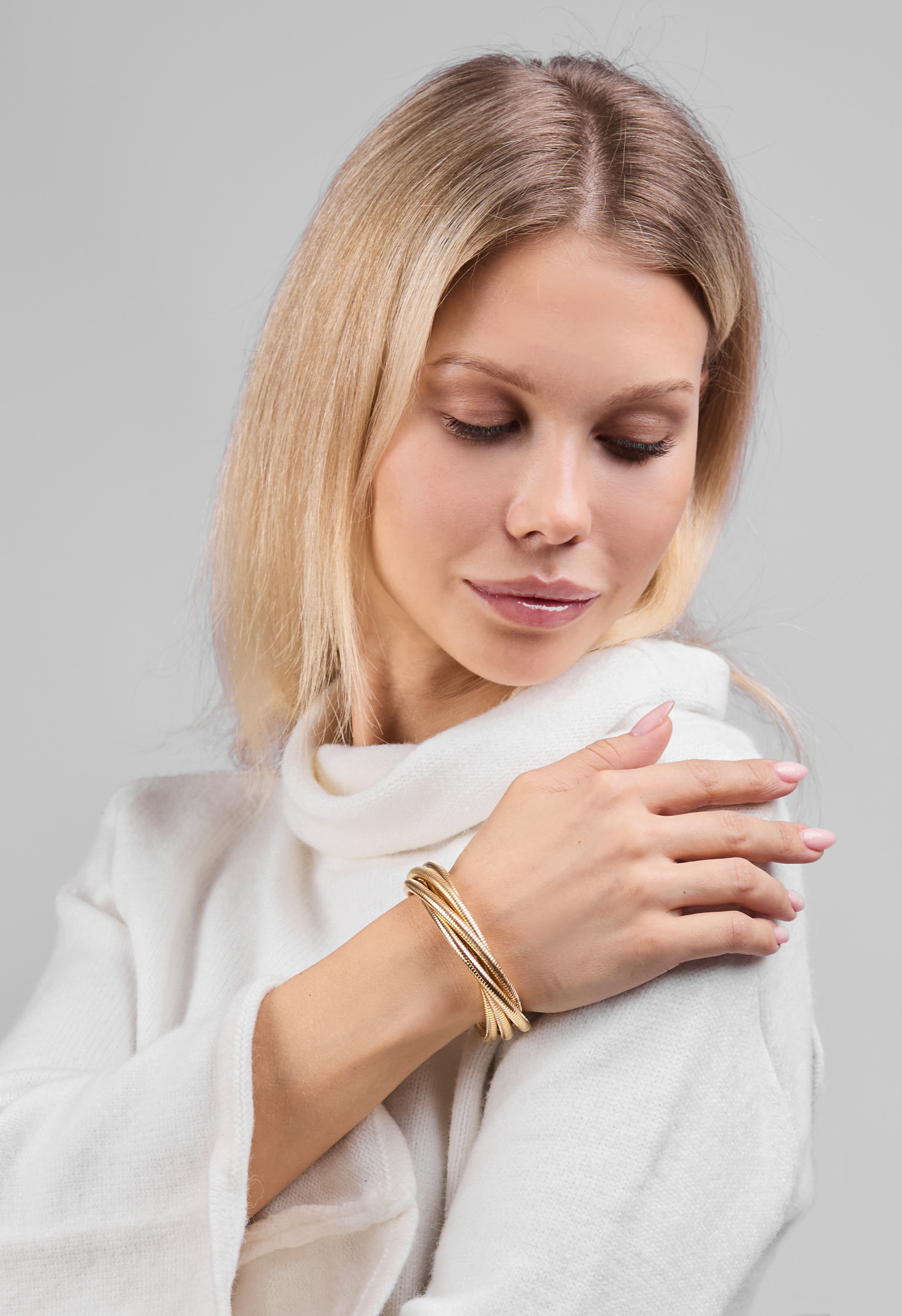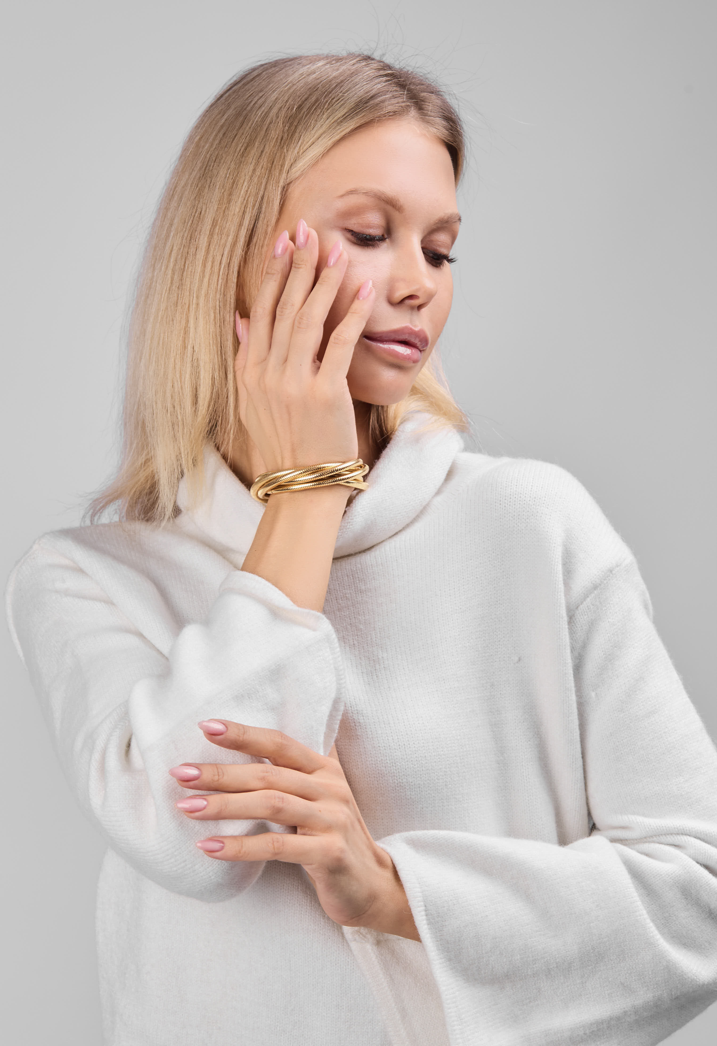 Браслет сможет притянуть к себе всё внимание окружающих и станет верным спутником как на важных мероприятиях, так и в повседневной жизни благодаря золотому цвету и утончённому стилю.