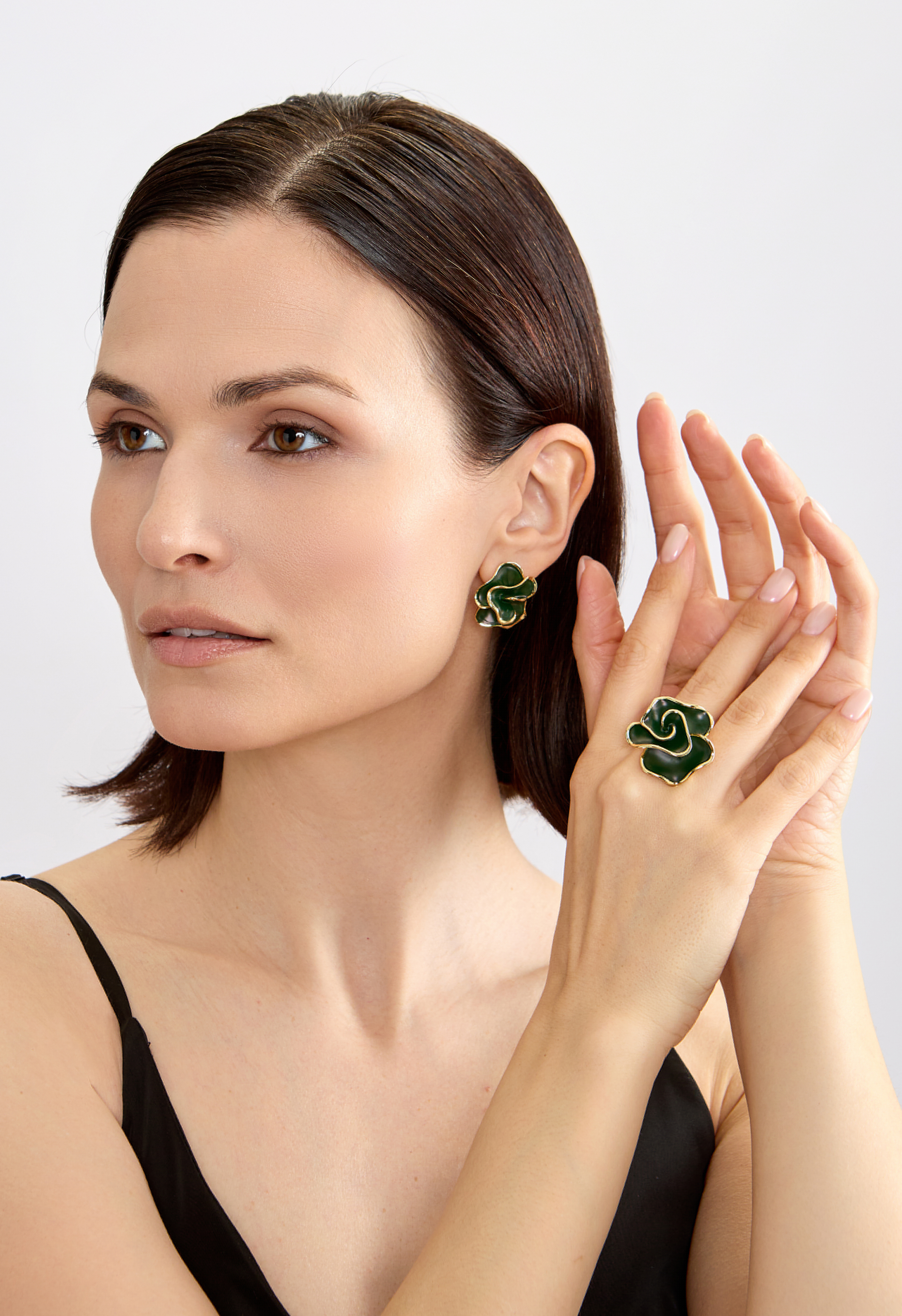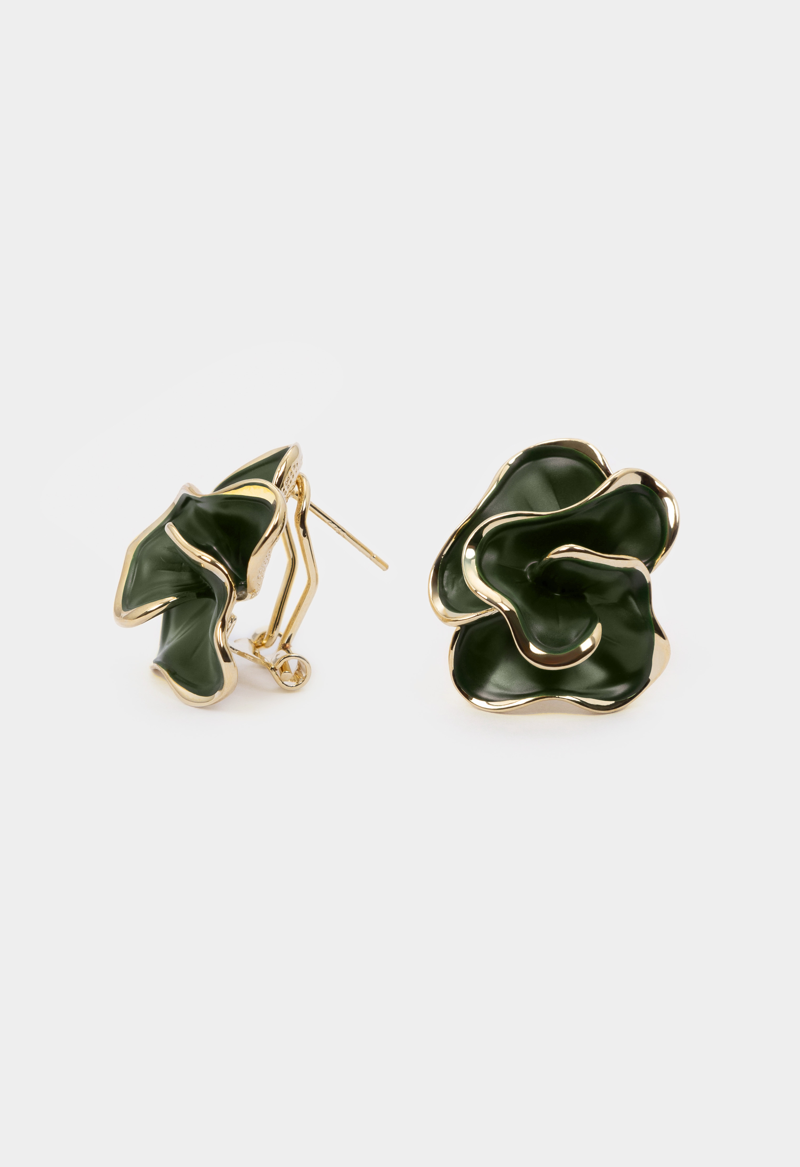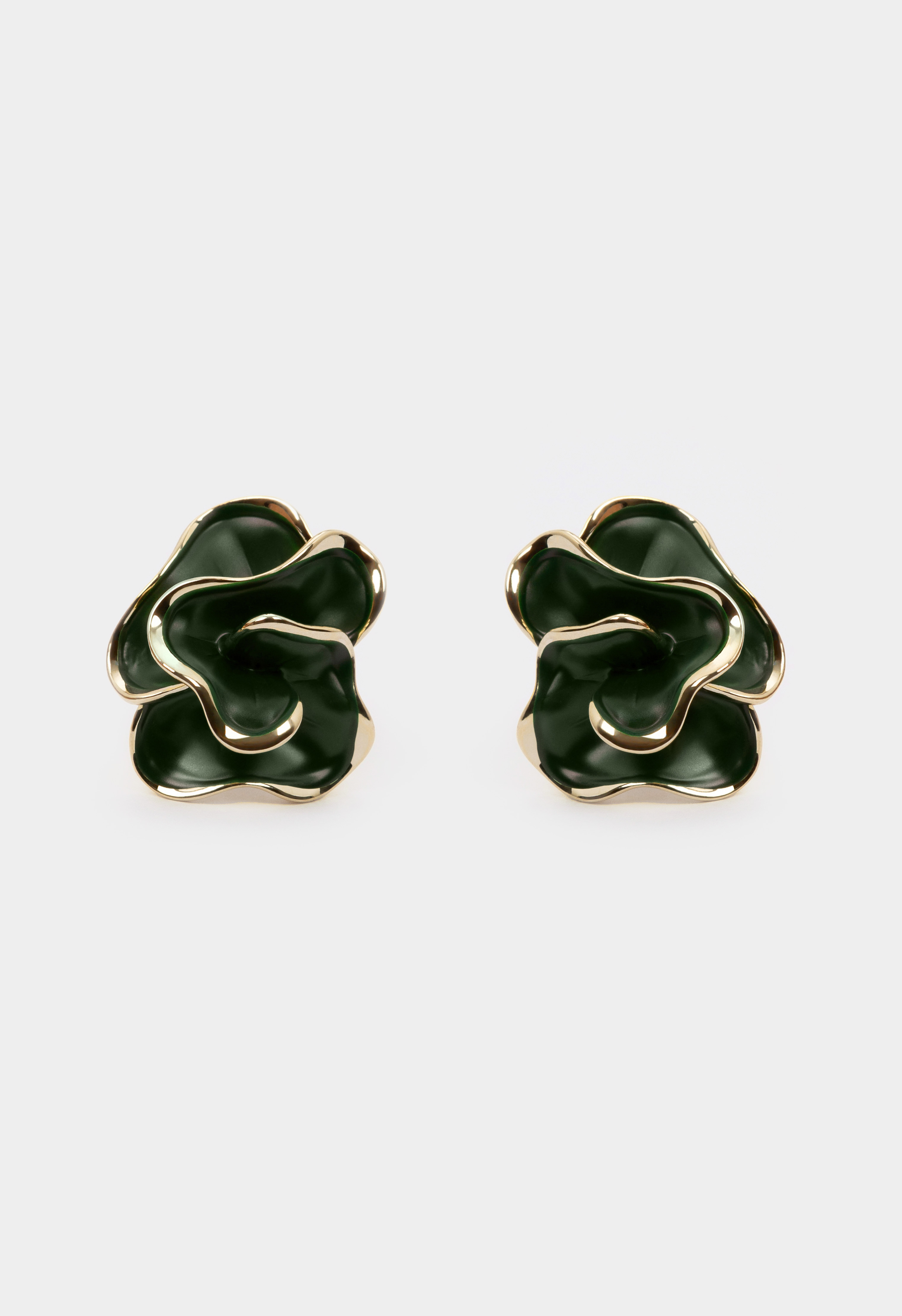 Серьги из ювелирного сплава в форме розы с глубоким зеленым оттенком и элегантной золотой окантовкой на булaвке – это эффектное украшение для тех, кто ценит стиль с характером. Контраст темного цвета и эффектного блеска создает атмосферу загадочности, силы и утонченной роскоши. Такой аксессуар добавит образу драматичности и изысканности, подчеркивая вашу уверенность и неповторимый вкус в любых обстоятельствах.