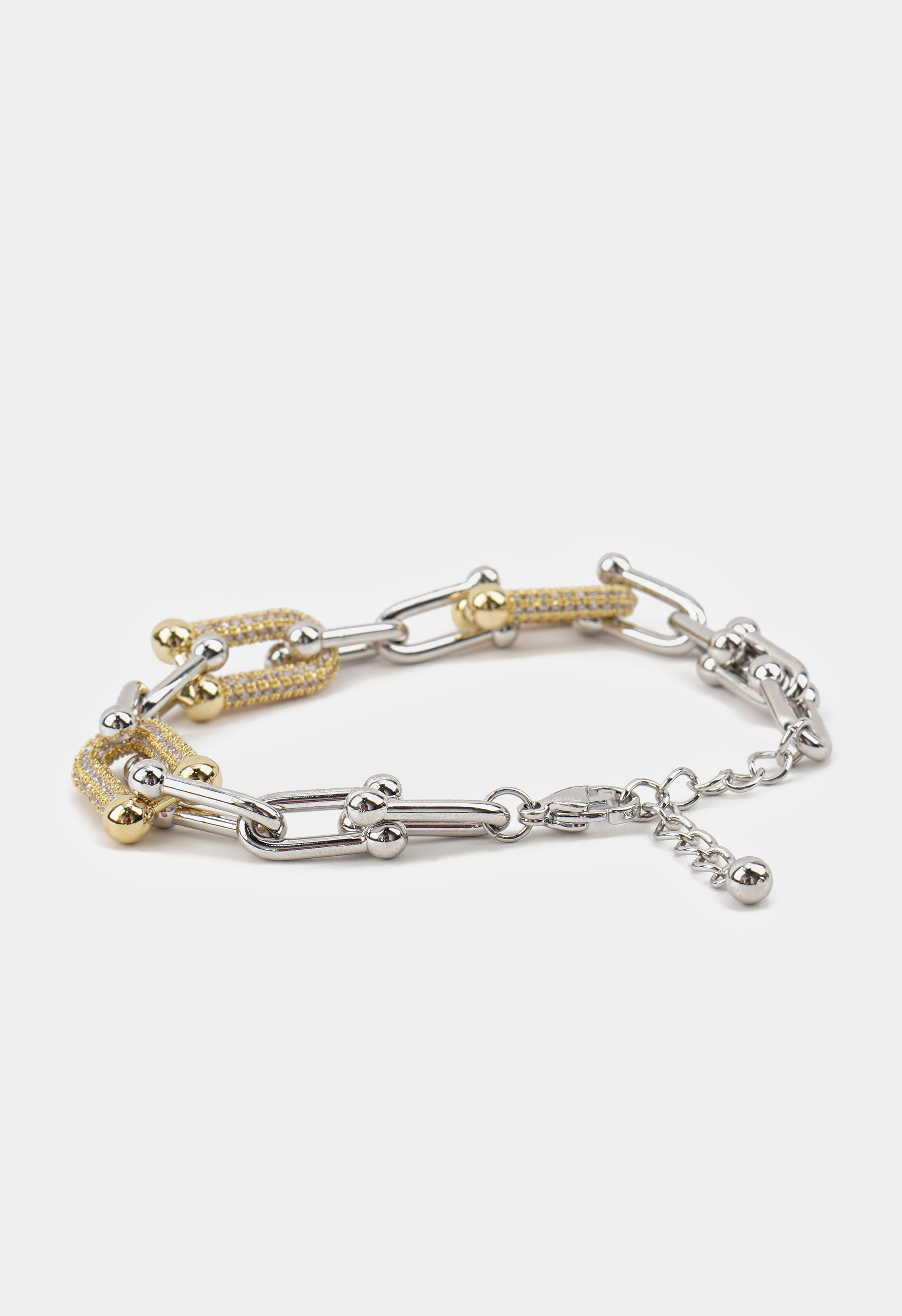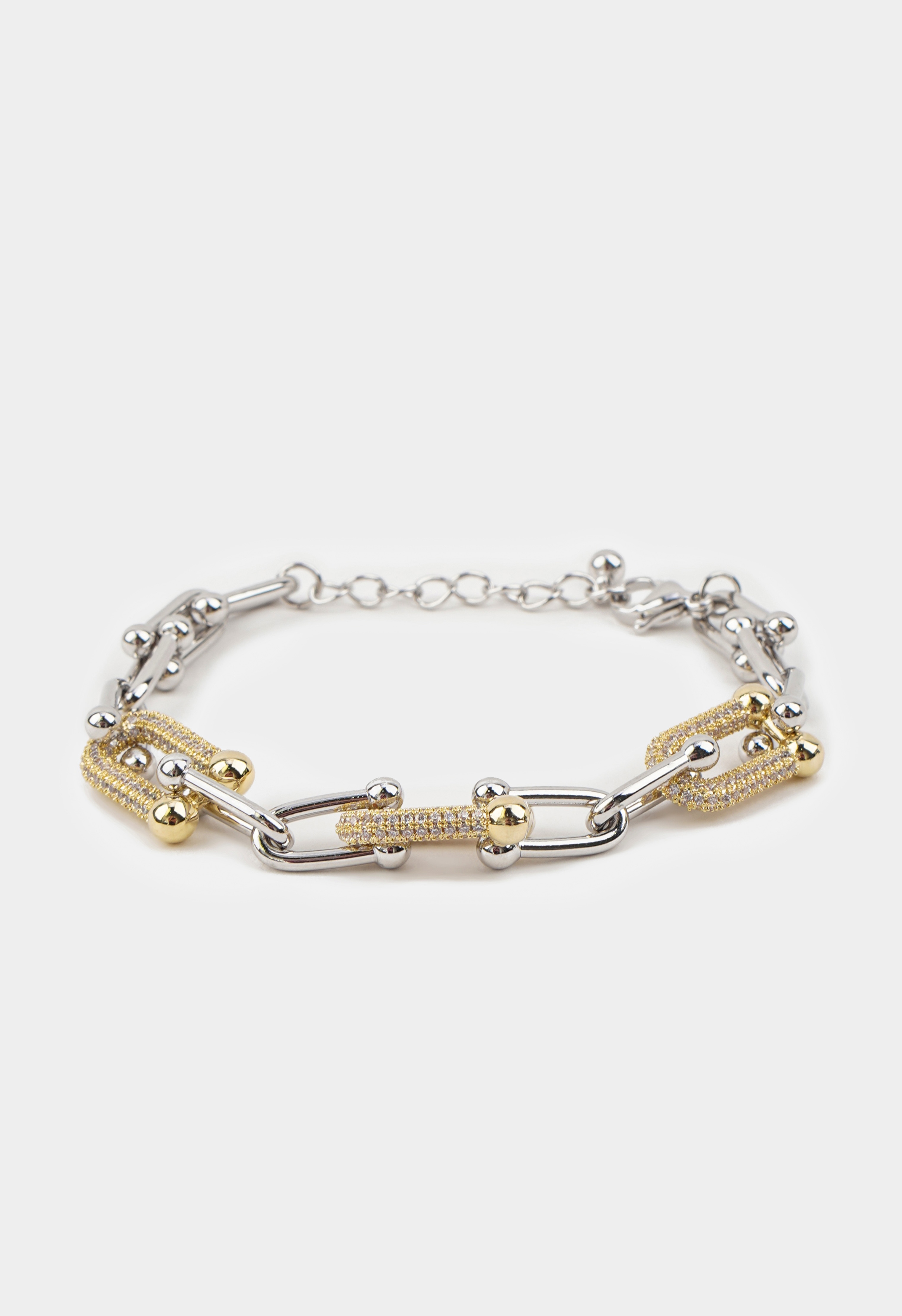 Стильный браслет из ювелирного сплава сочетает серебристые и золотистые элементы, создавая современный и выразительный акцент. Объемные звенья добавляют образу фактуры, а теплый блеск золотистых деталей делает аксессуар более заметным. Изделие легкое, удобное, с надежной застежкой-карабином и регулируемой длиной. Браслет гармонично дополняет как повседневные, так и праздничные образы.