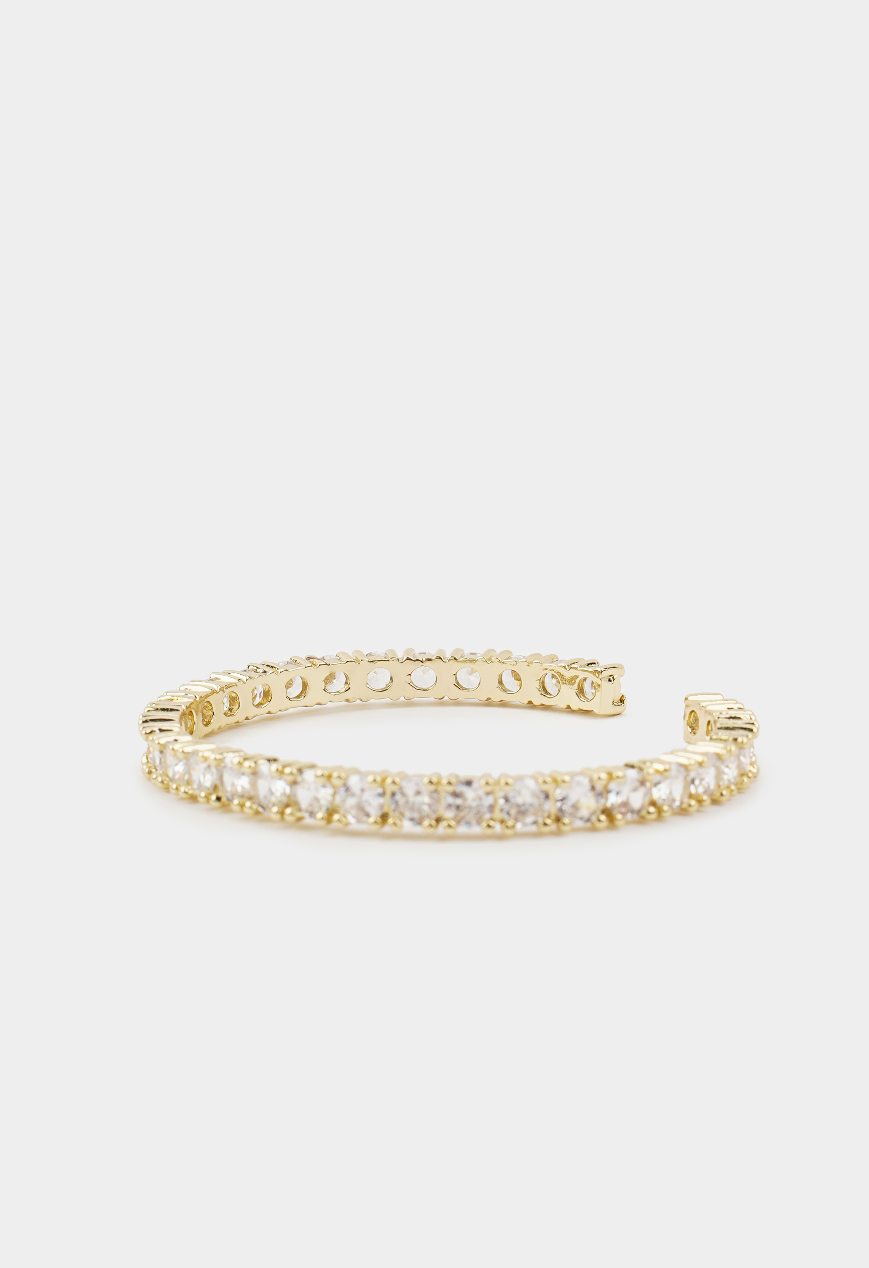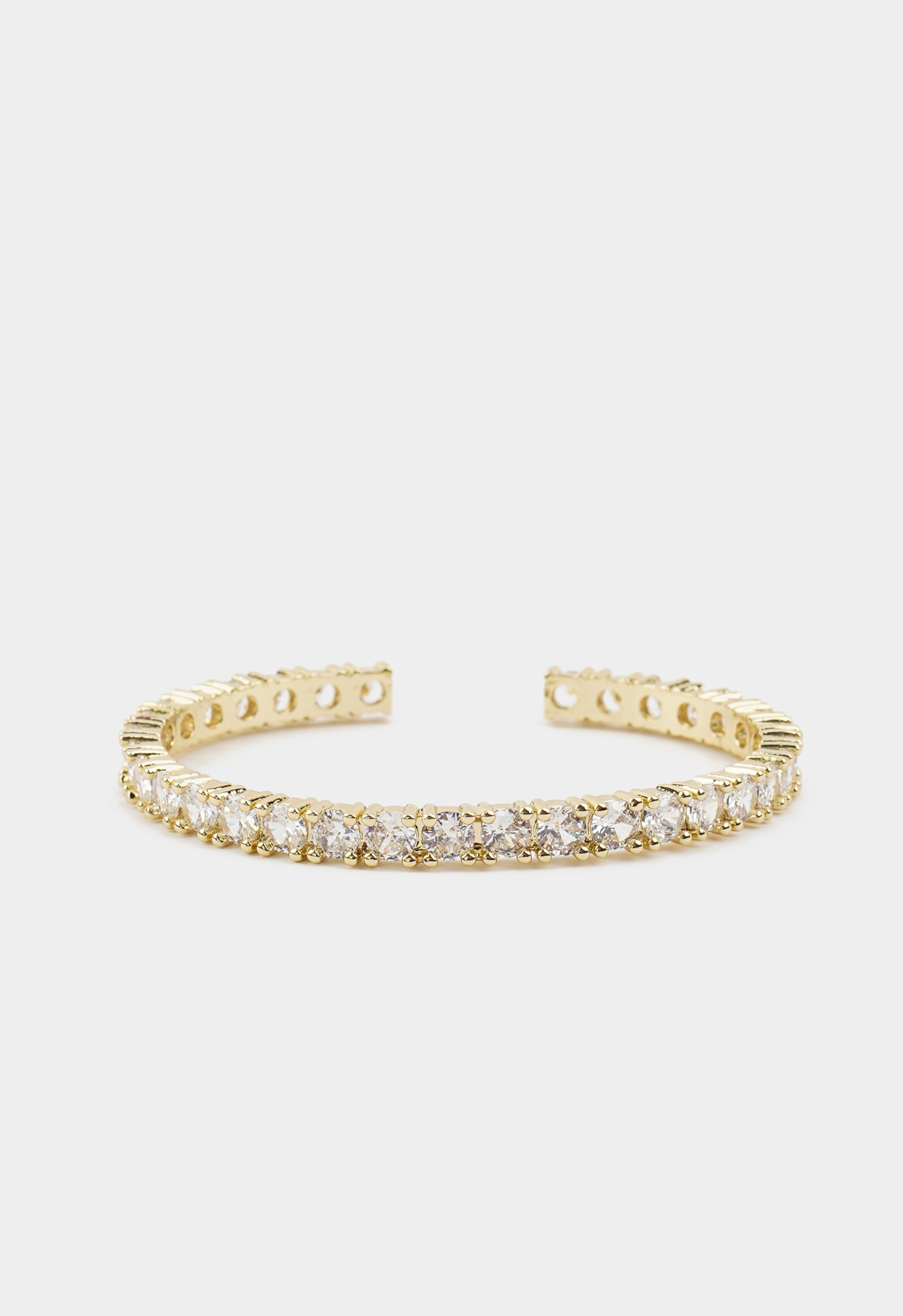 Золотой браслет из ювелирного сплава со вставками сияющих страз – это эффектный и в то же время изящный аксессуар, который подчеркивает праздничность образа. Теплый золотистый оттенок гармонирует с любой цветовой гаммой, а аккуратно расставленные стразы ловят свет и придают запястью тонкий блеск. Браслет легкий и комфортный в носке, прочный в уходе и станет идеальным дополнением к вечернему платью или ярким акцентом в повседневном ансамбле, а также прекрасным подарком.